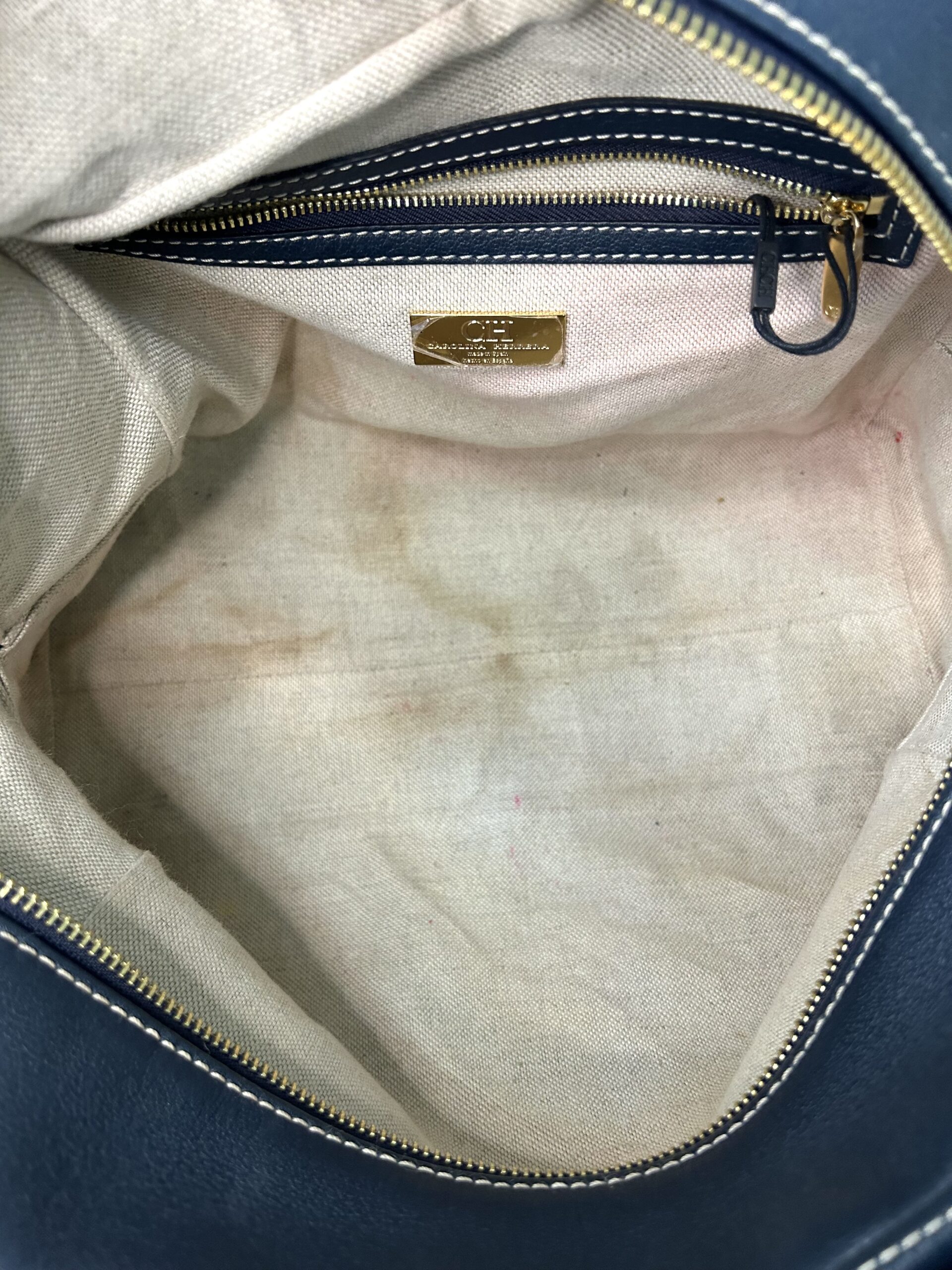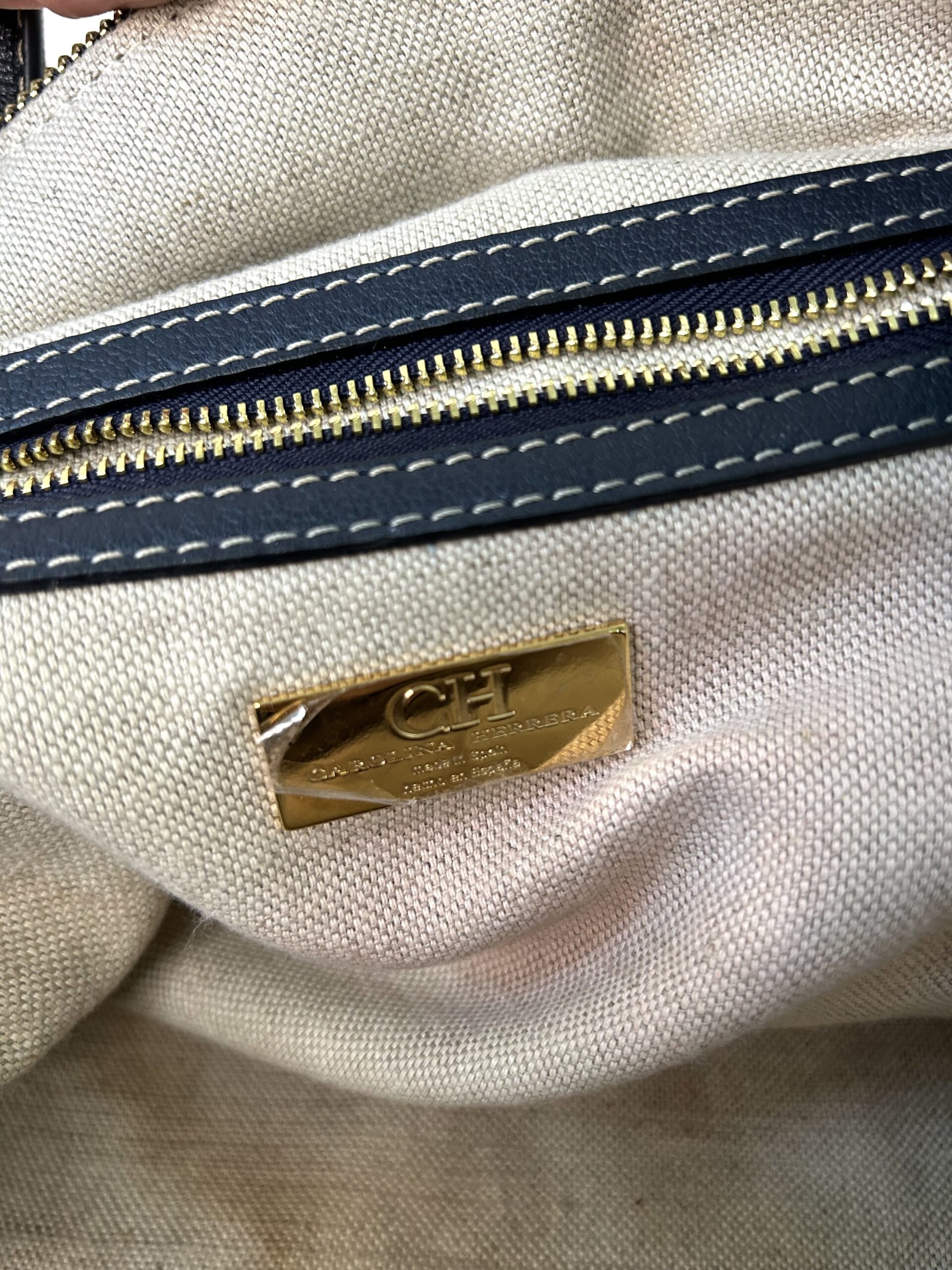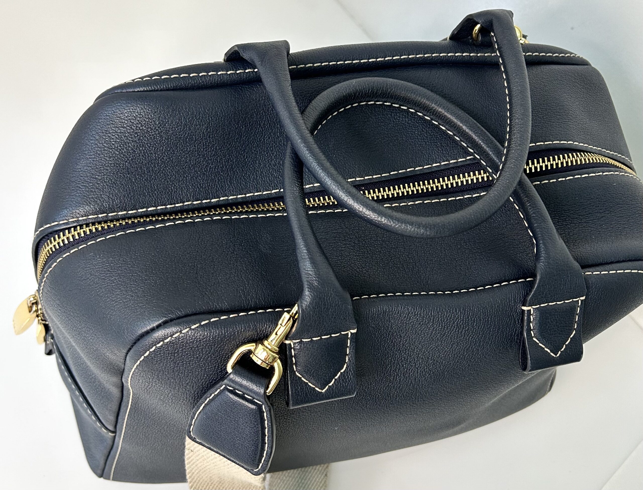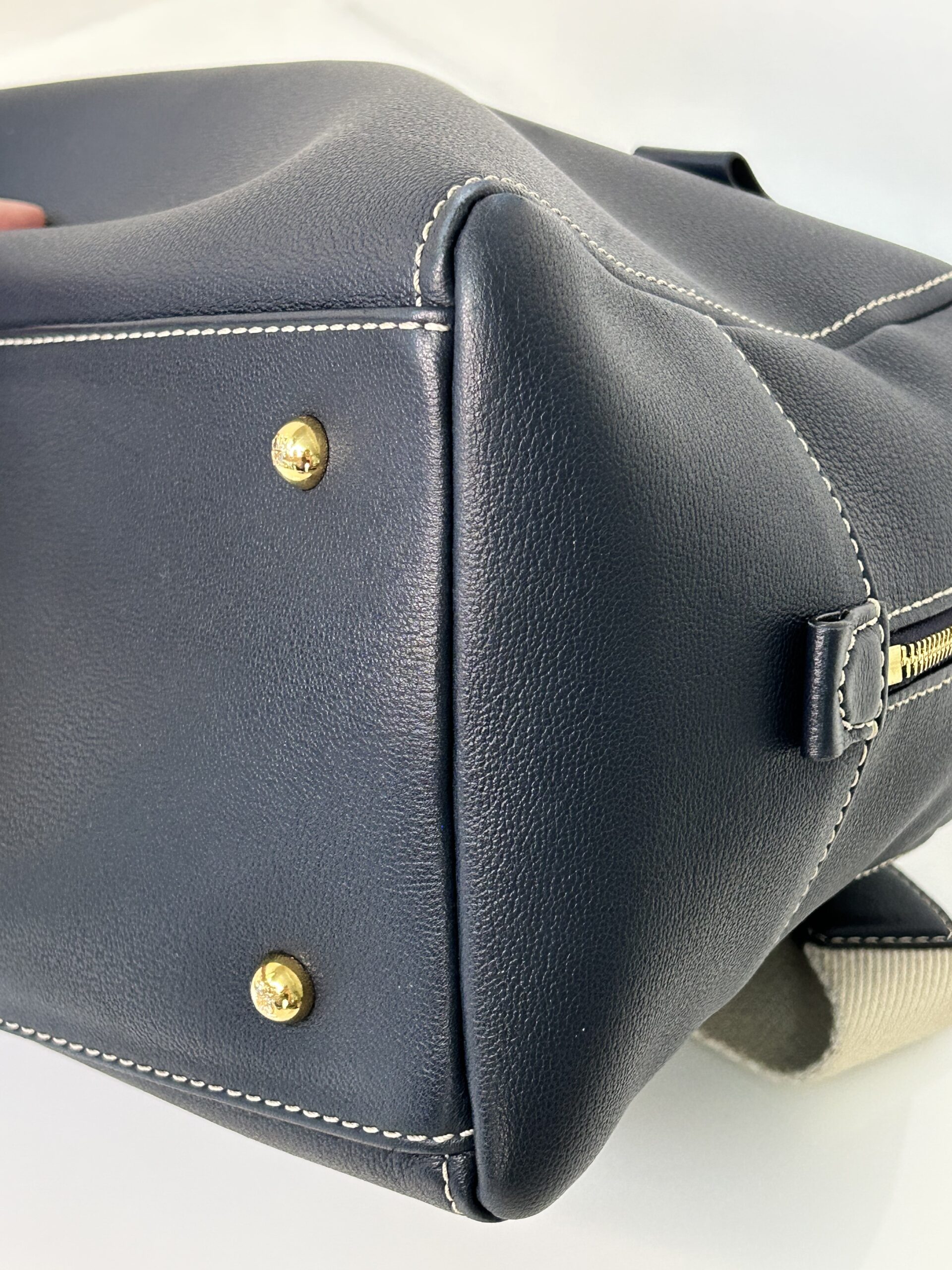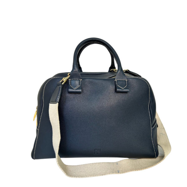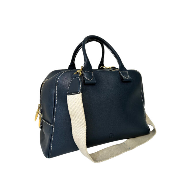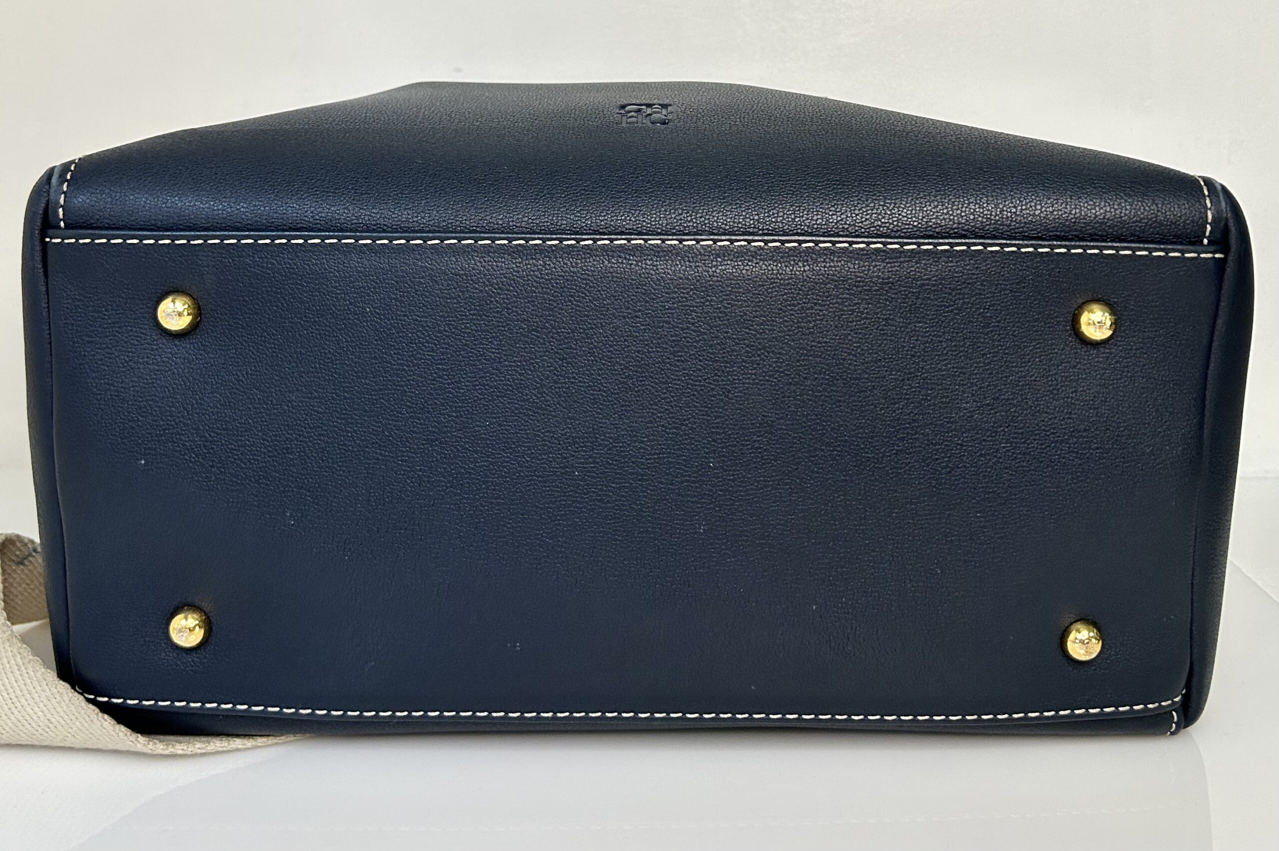 Bolso molde satchel en cuero liso color azul marino con manija corta de mano y strap removible de tejido beige. Con cierre. Se puede usarla al hombro o de mano. Logo frontal grabado.