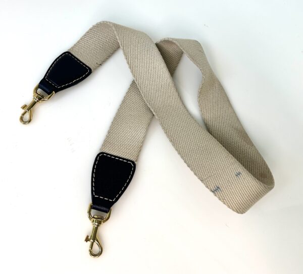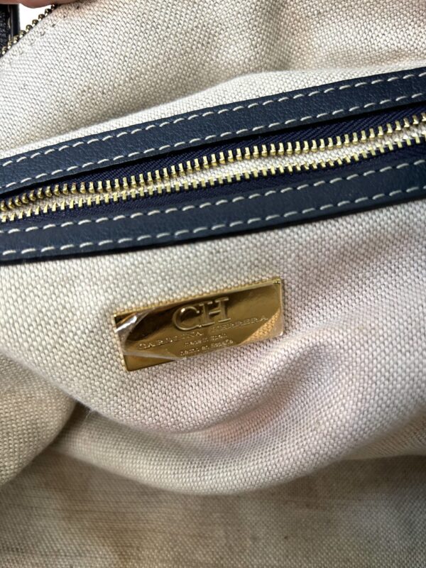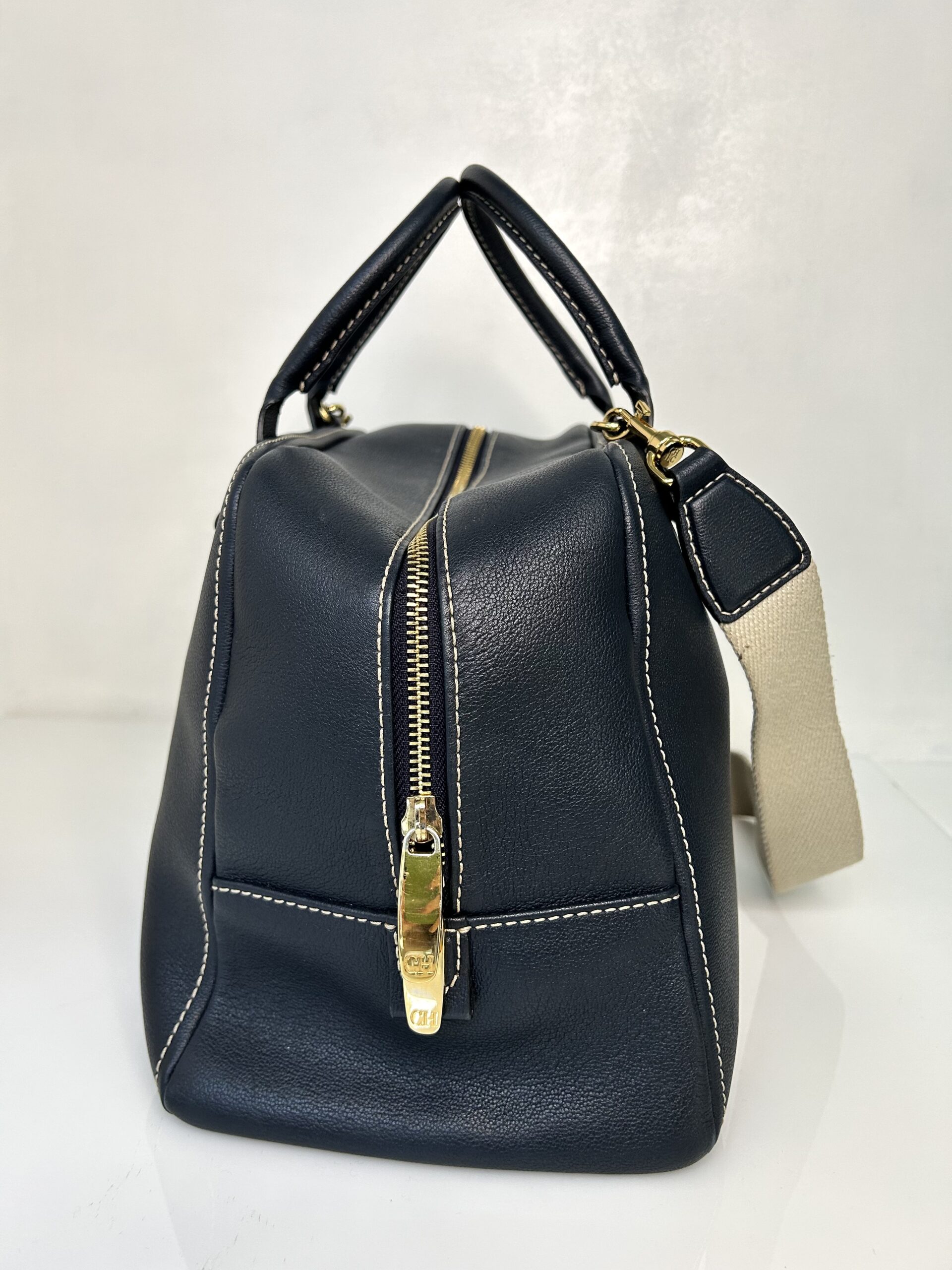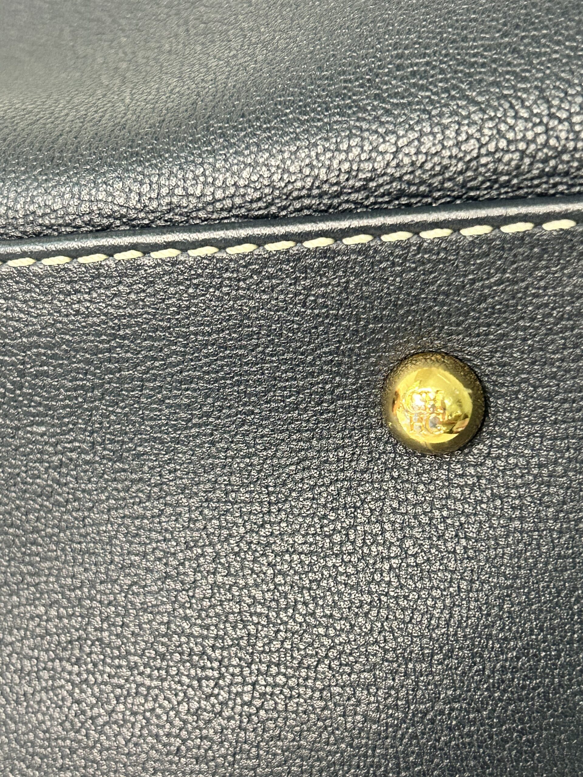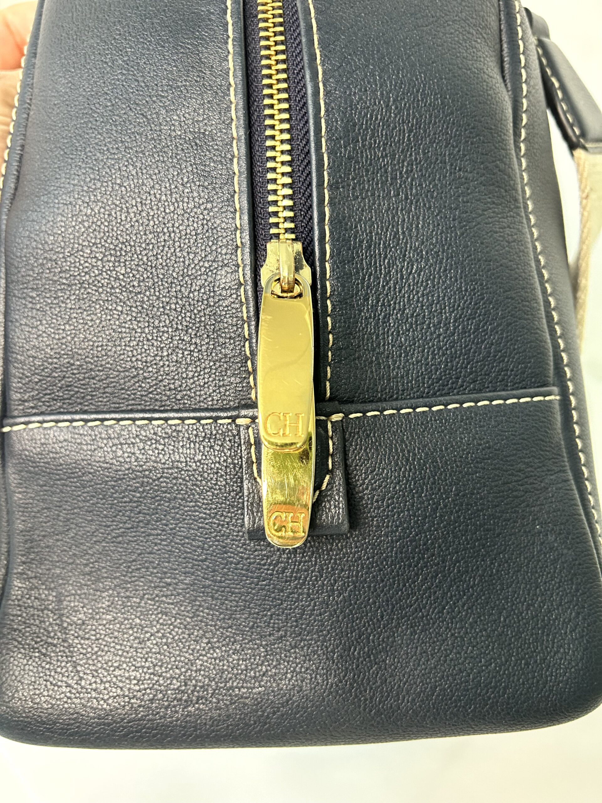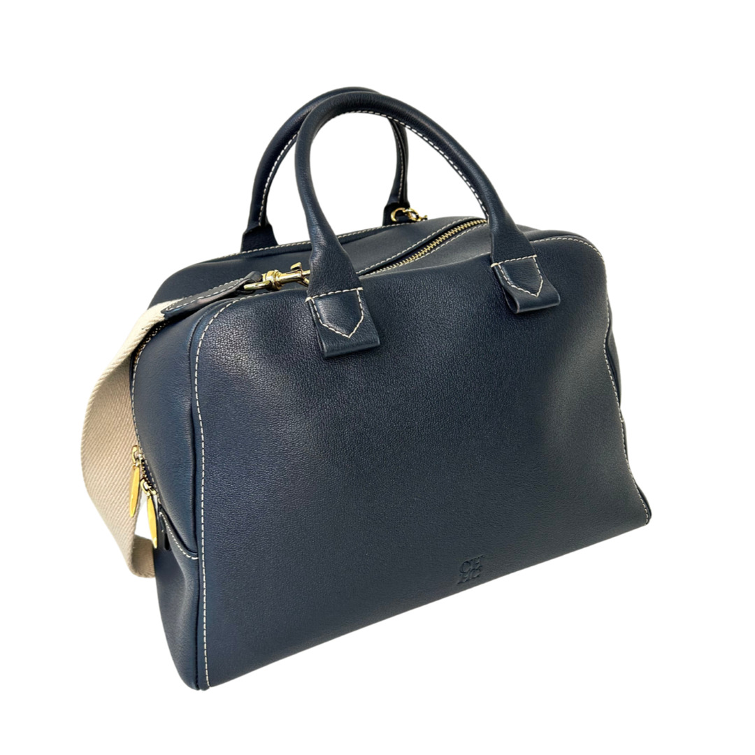 Bolso molde satchel en cuero liso color azul marino con manija corta de mano y strap removible de tejido beige. Con cierre. Se puede usarla al hombro o de mano. Logo frontal grabado.
