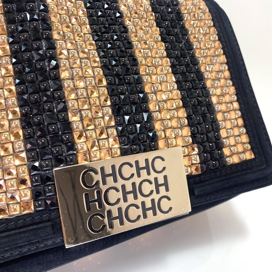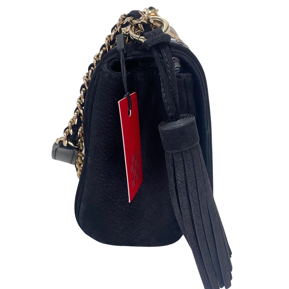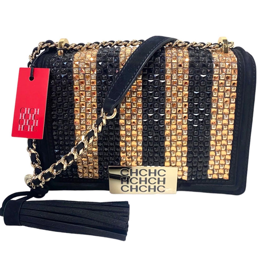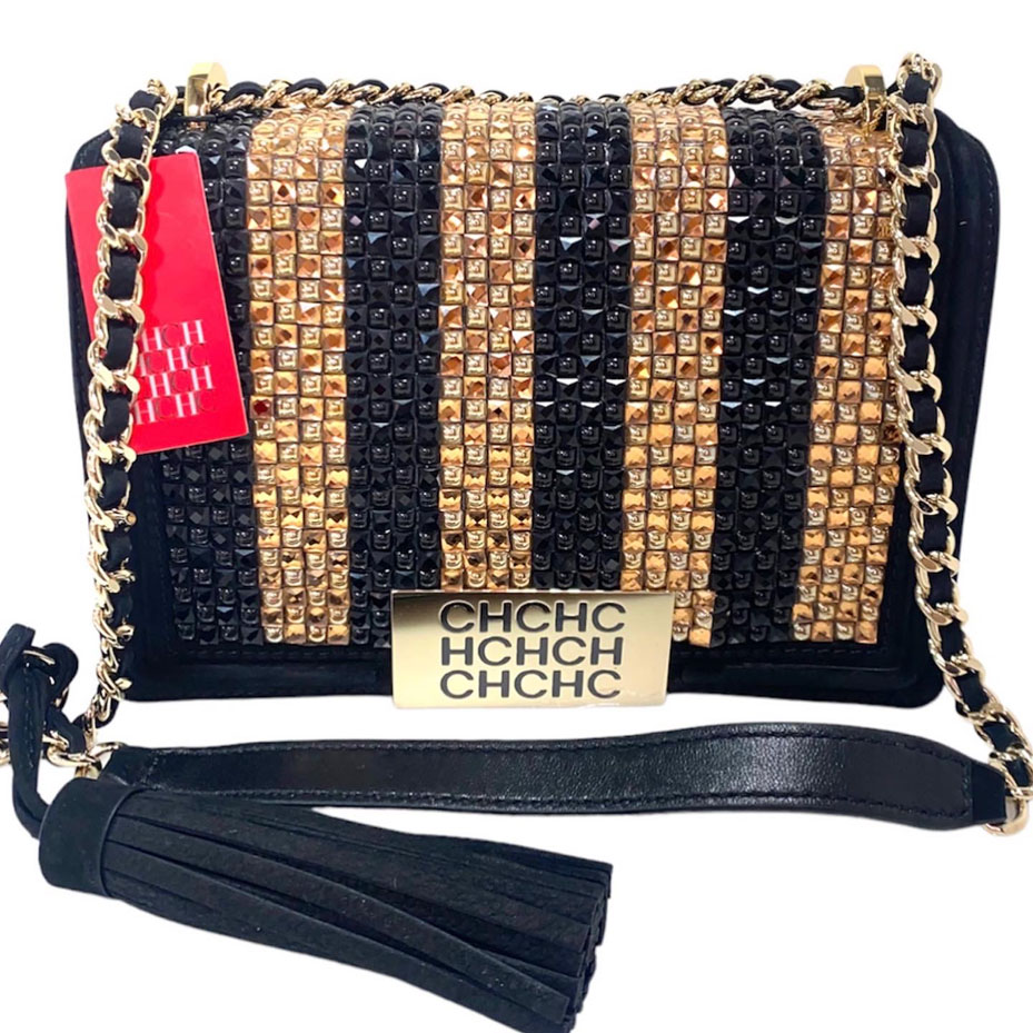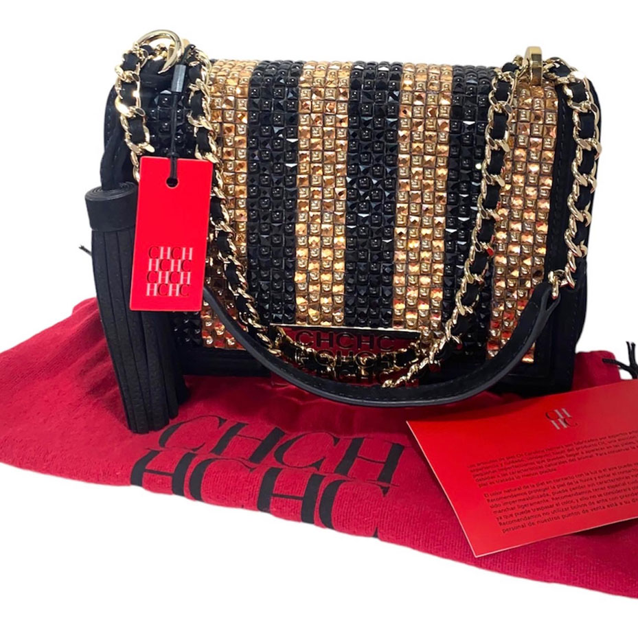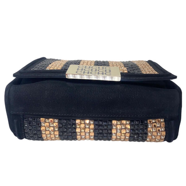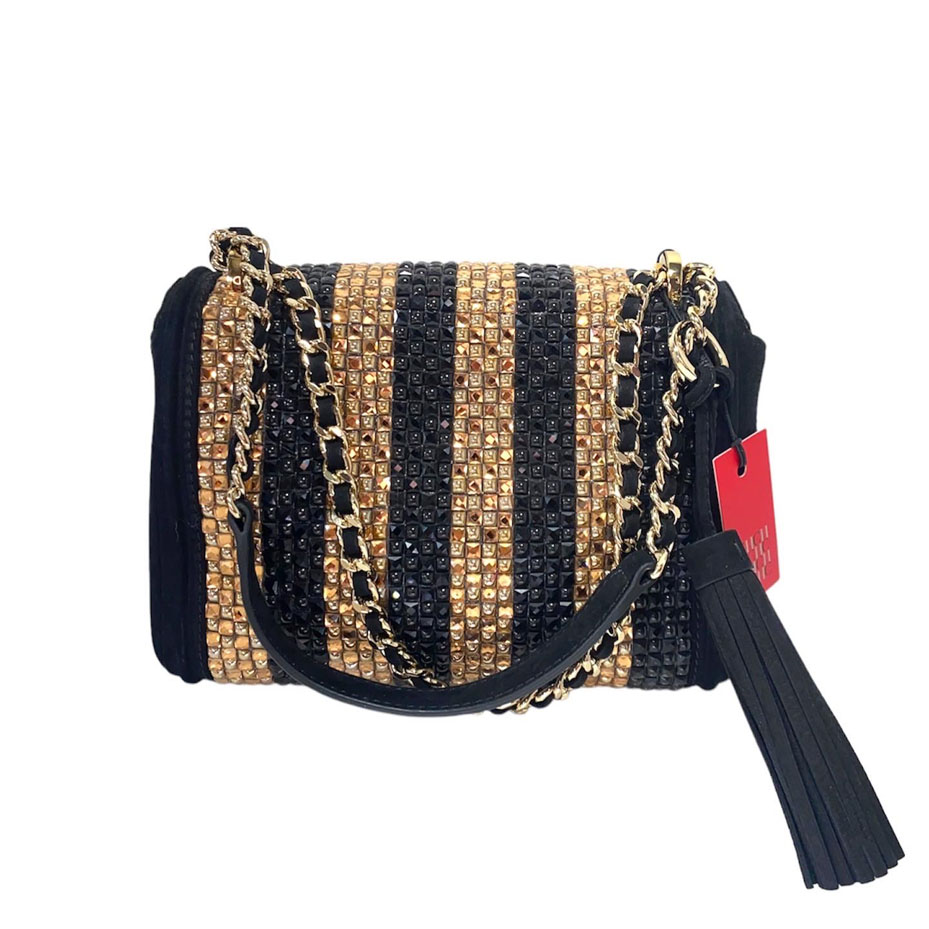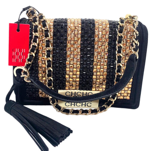 Crossbody de cuero nobuk negro y piedras en tono negro y dorado. Strap de cadena y cuero corto para hombro. Tamaño pequeño. 23 cm ancho y 17 alto.