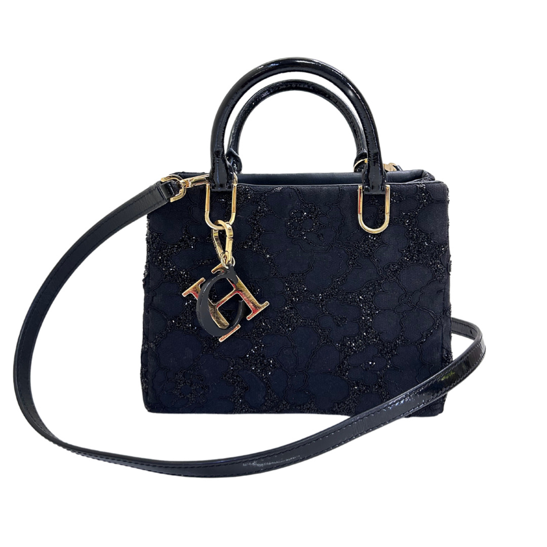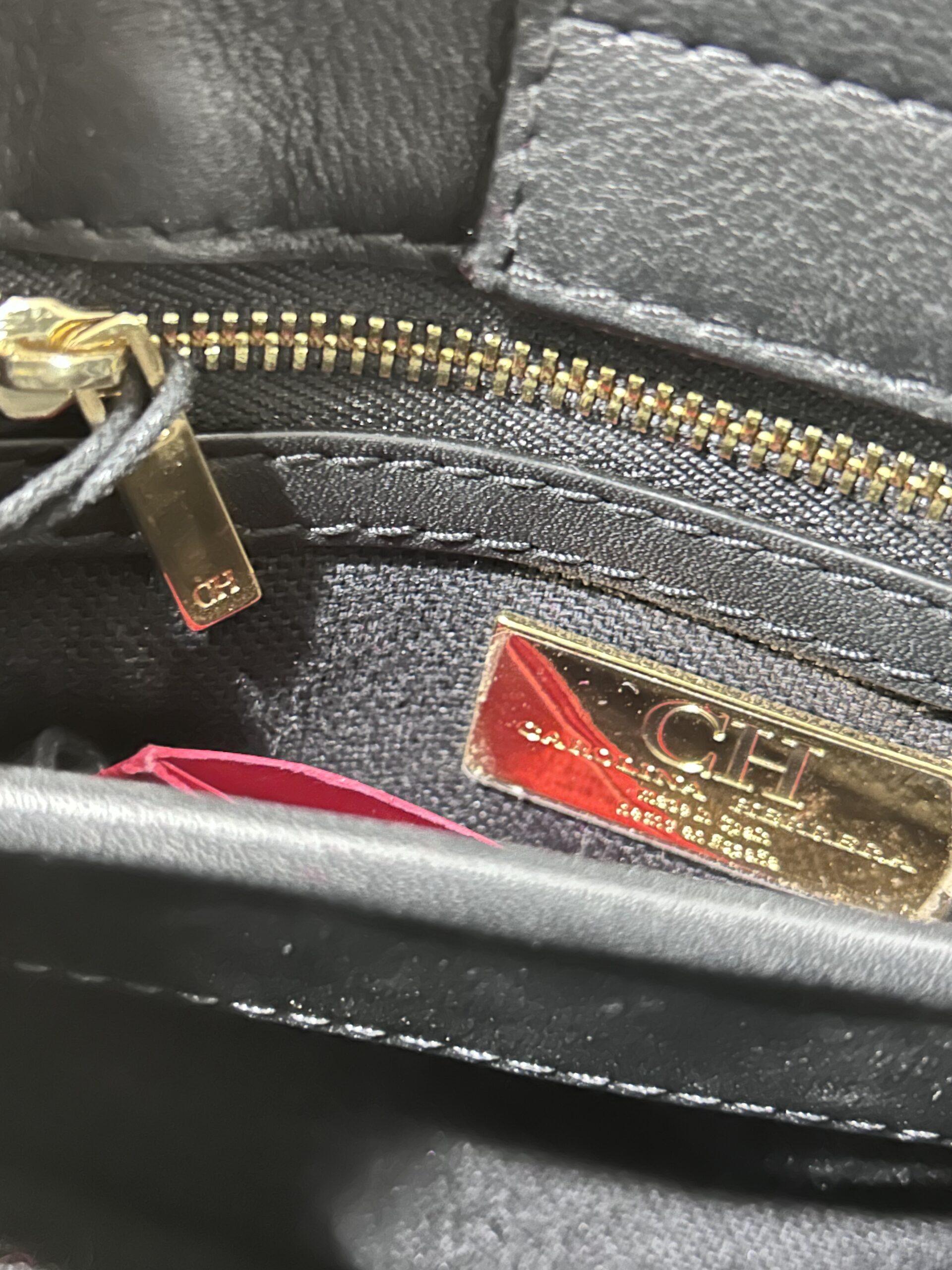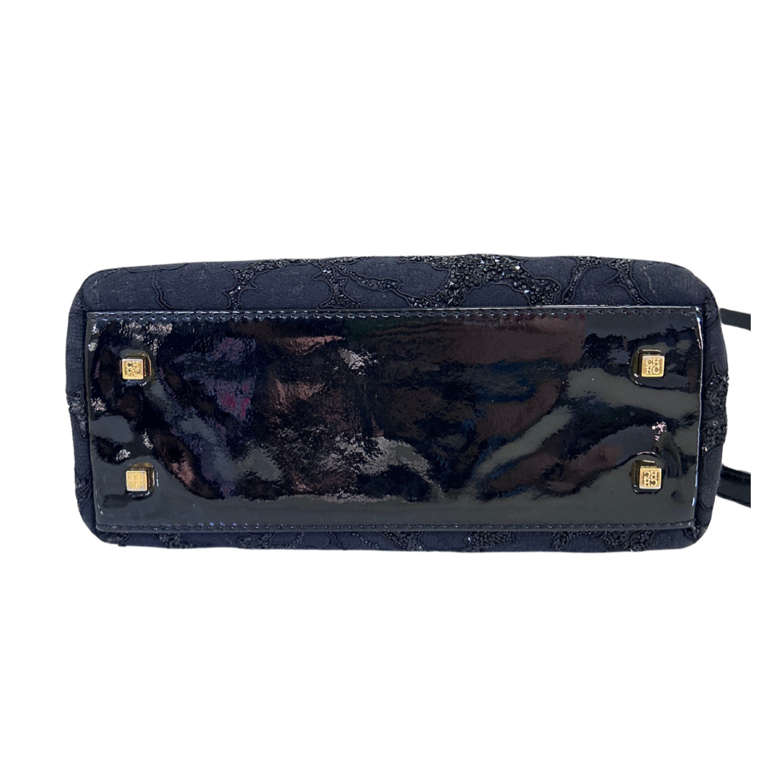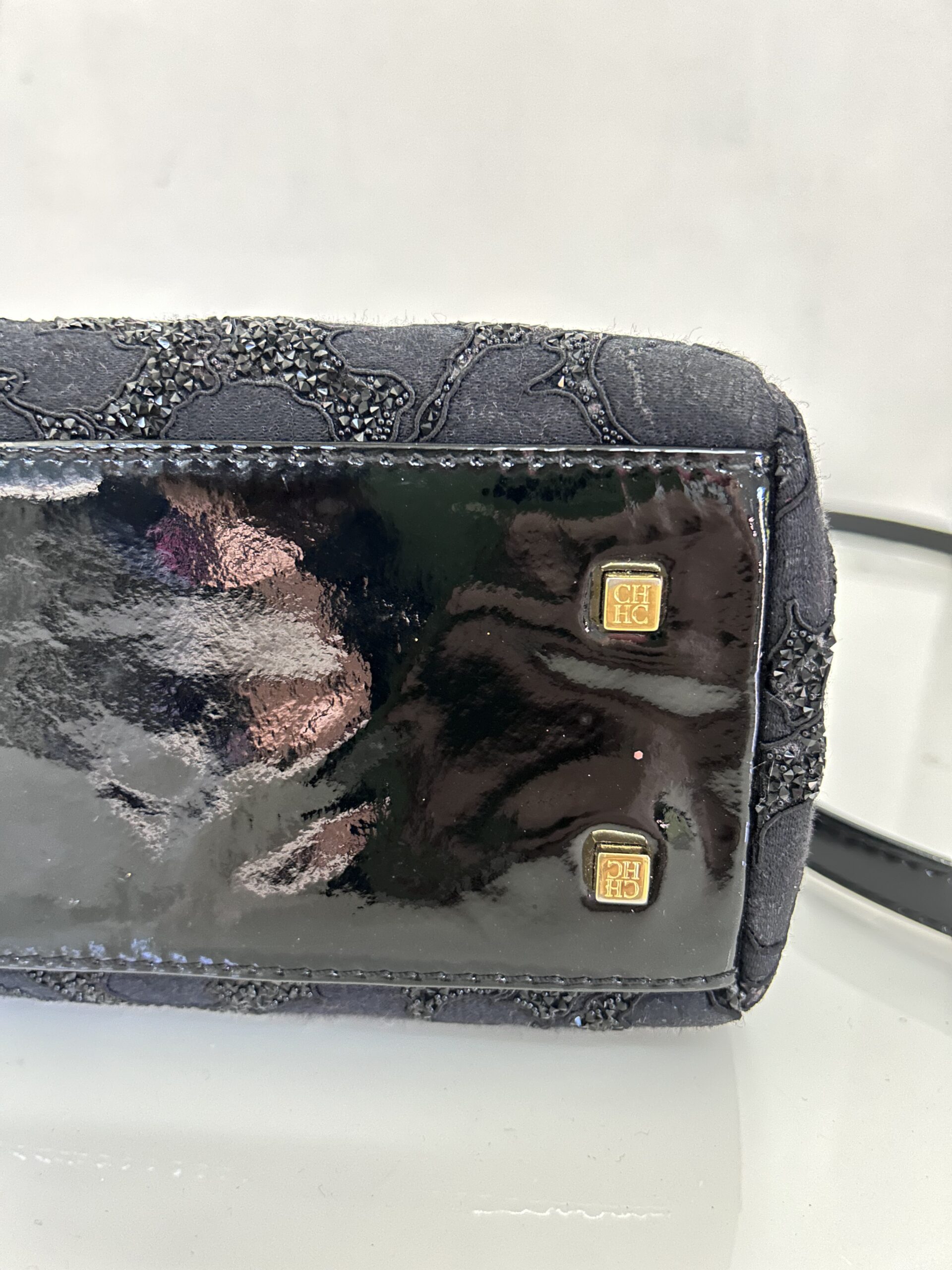 Bolso tamaño mini en tejido negro con flores bordadas y piedras de cristal color negro. Asa corta de mano en cuero charolado negro. También posee un strap largo de cuero charolado negro removible. Podes usarla de mano, al hombro o cruzada. Colgante de logo CH en metal dorado y negro. Sin cierre, con prendedor de iman en cuero. Interior en tejido negro con bolsillo con cierre. Con dos compartimientos separados.