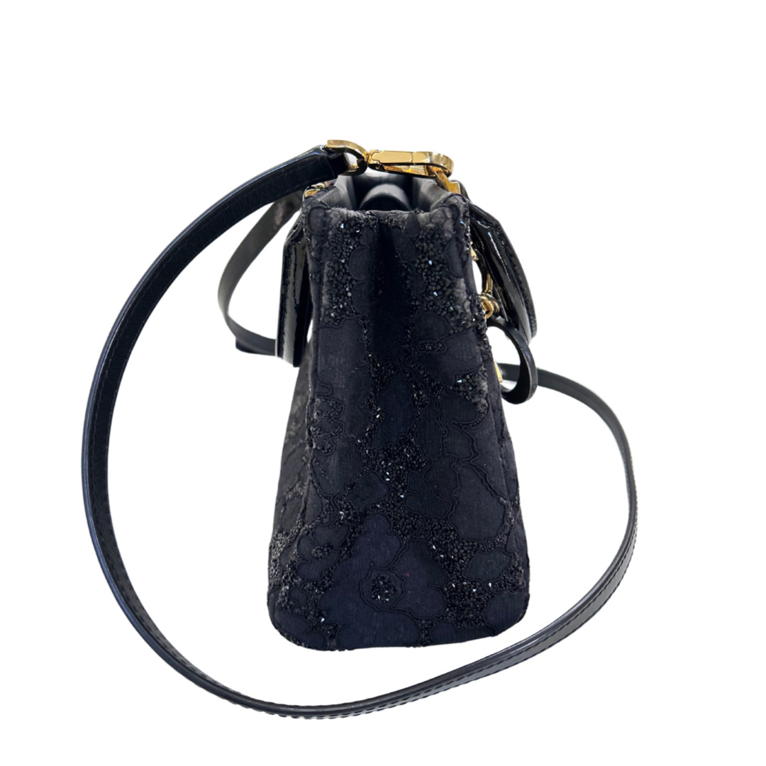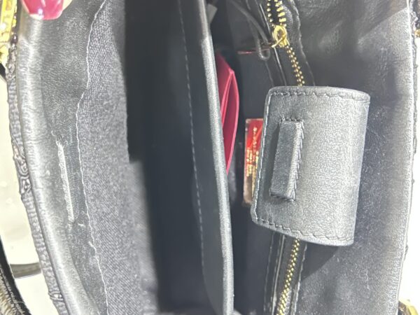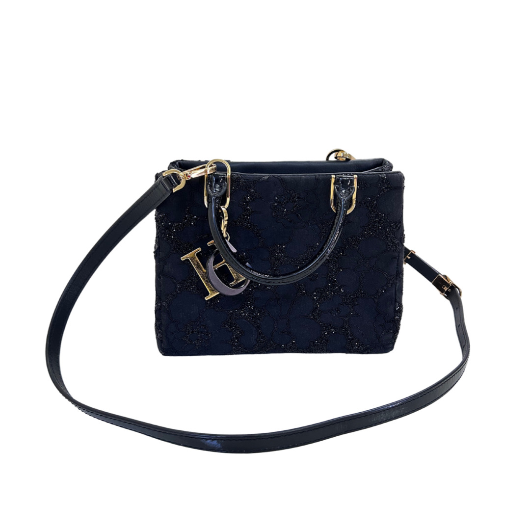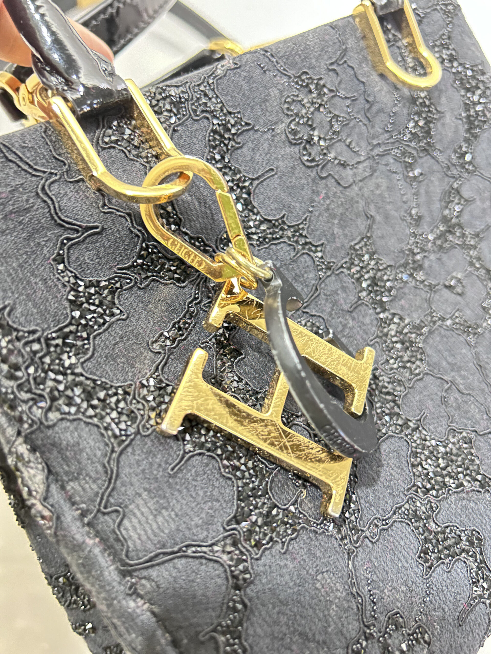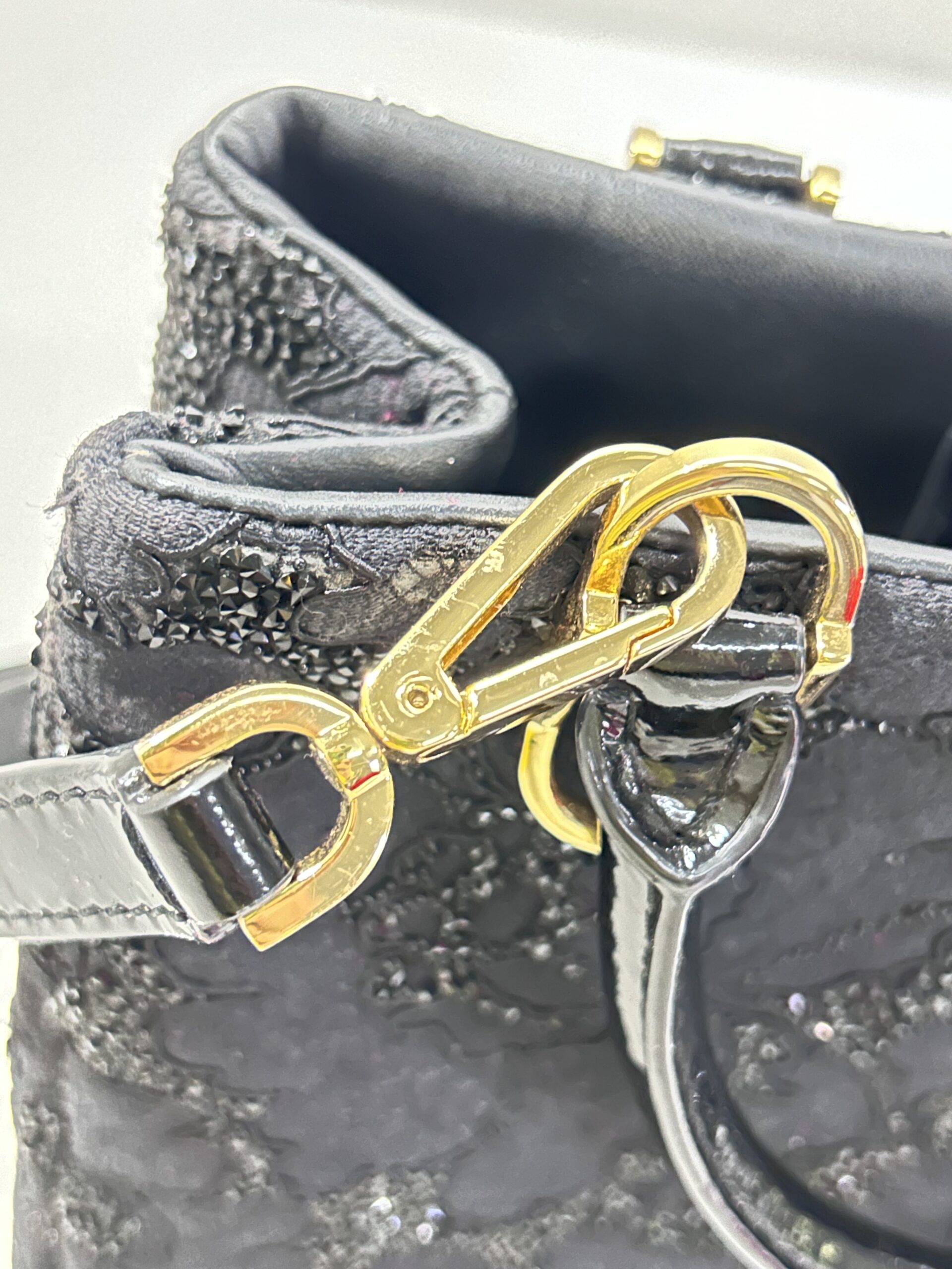 Bolso tamaño mini en tejido negro con flores bordadas y piedras de cristal color negro. Asa corta de mano en cuero charolado negro. También posee un strap largo de cuero charolado negro removible. Podes usarla de mano, al hombro o cruzada. Colgante de logo CH en metal dorado y negro. Sin cierre, con prendedor de iman en cuero. Interior en tejido negro con bolsillo con cierre. Con dos compartimientos separados.