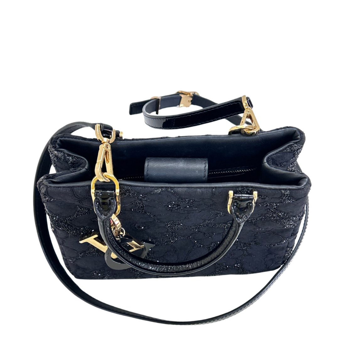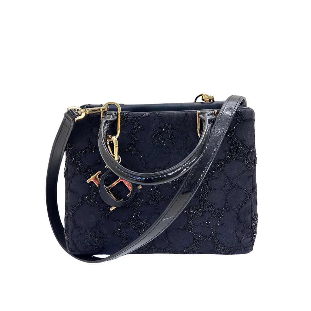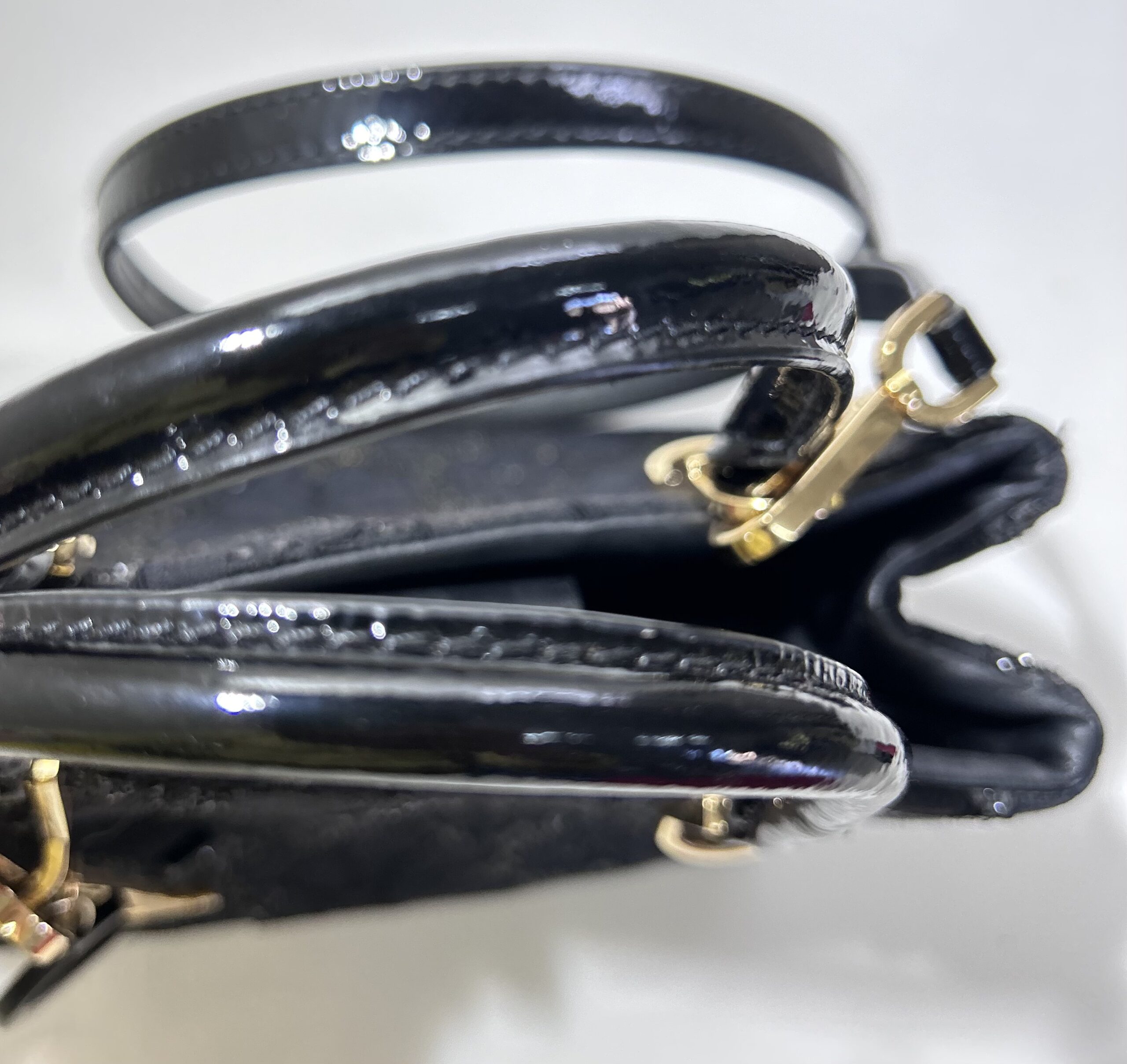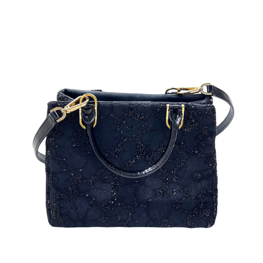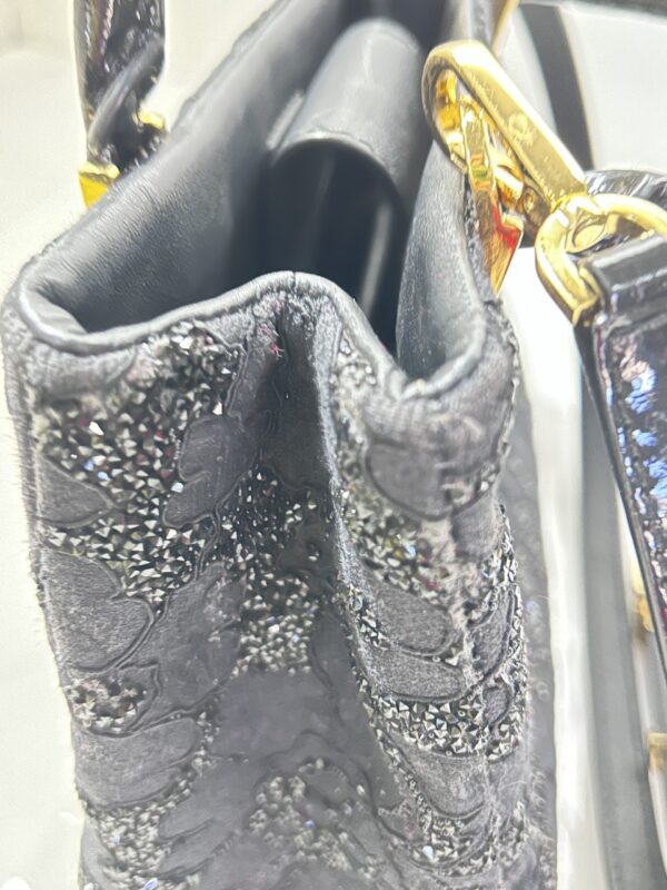 Bolso tamaño mini en tejido negro con flores bordadas y piedras de cristal color negro. Asa corta de mano en cuero charolado negro. También posee un strap largo de cuero charolado negro removible. Podes usarla de mano, al hombro o cruzada. Colgante de logo CH en metal dorado y negro. Sin cierre, con prendedor de iman en cuero. Interior en tejido negro con bolsillo con cierre. Con dos compartimientos separados.