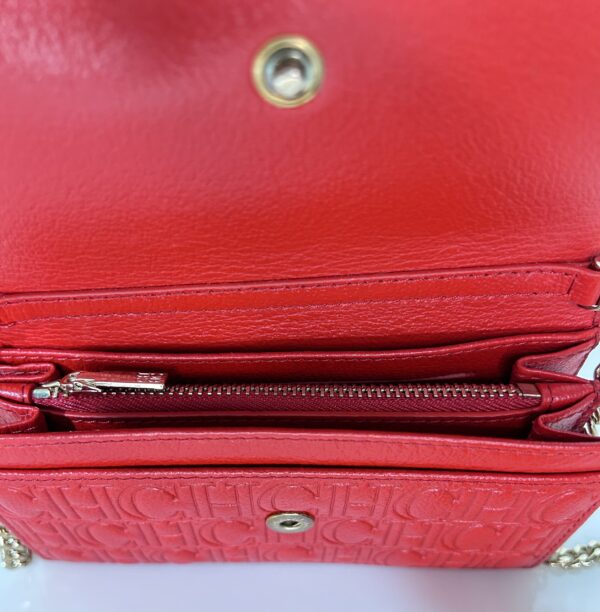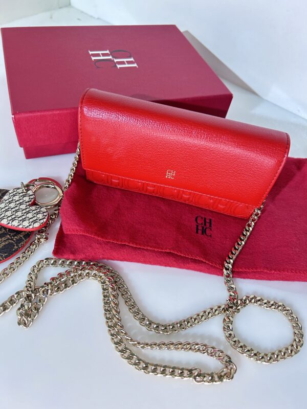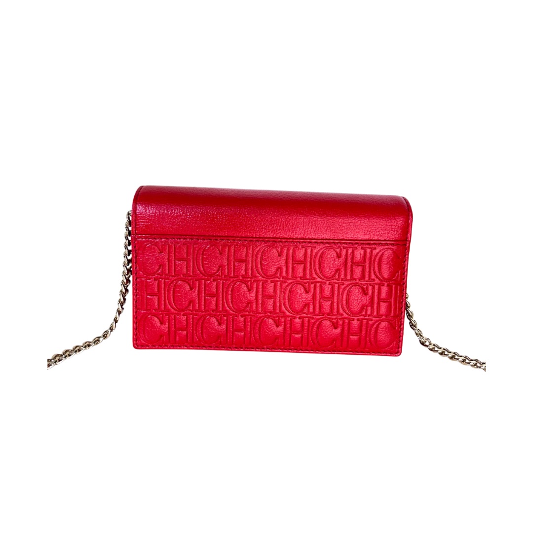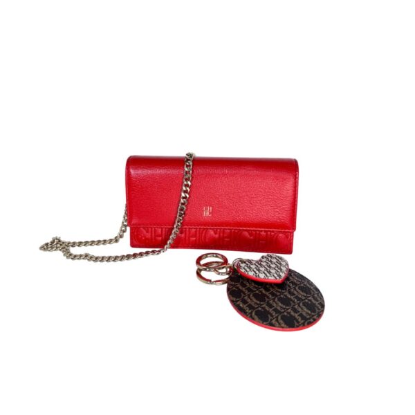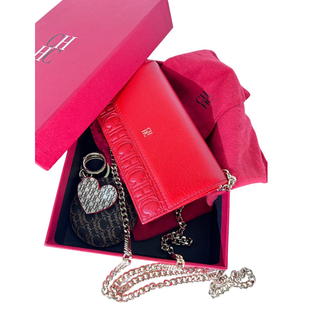 Crossbody tamaño mini de cuero monogram rojo con solapa frontal con botón a presión como sistema de cierre. Logo frontal en solapa grabado en color dorado. Strap largo de Cadena dorada para usarla cruzada o al hombro. Interior en cuero rojo, con dos compartimientos separados y porta tarjetas o documentos. Contiene un bolsillo con cierre. También se puede utilizar como billetera sin Strap. Incluye un Llavero colgante removible de cuero en forma de un corazón y un círculo en color marrón y beige.