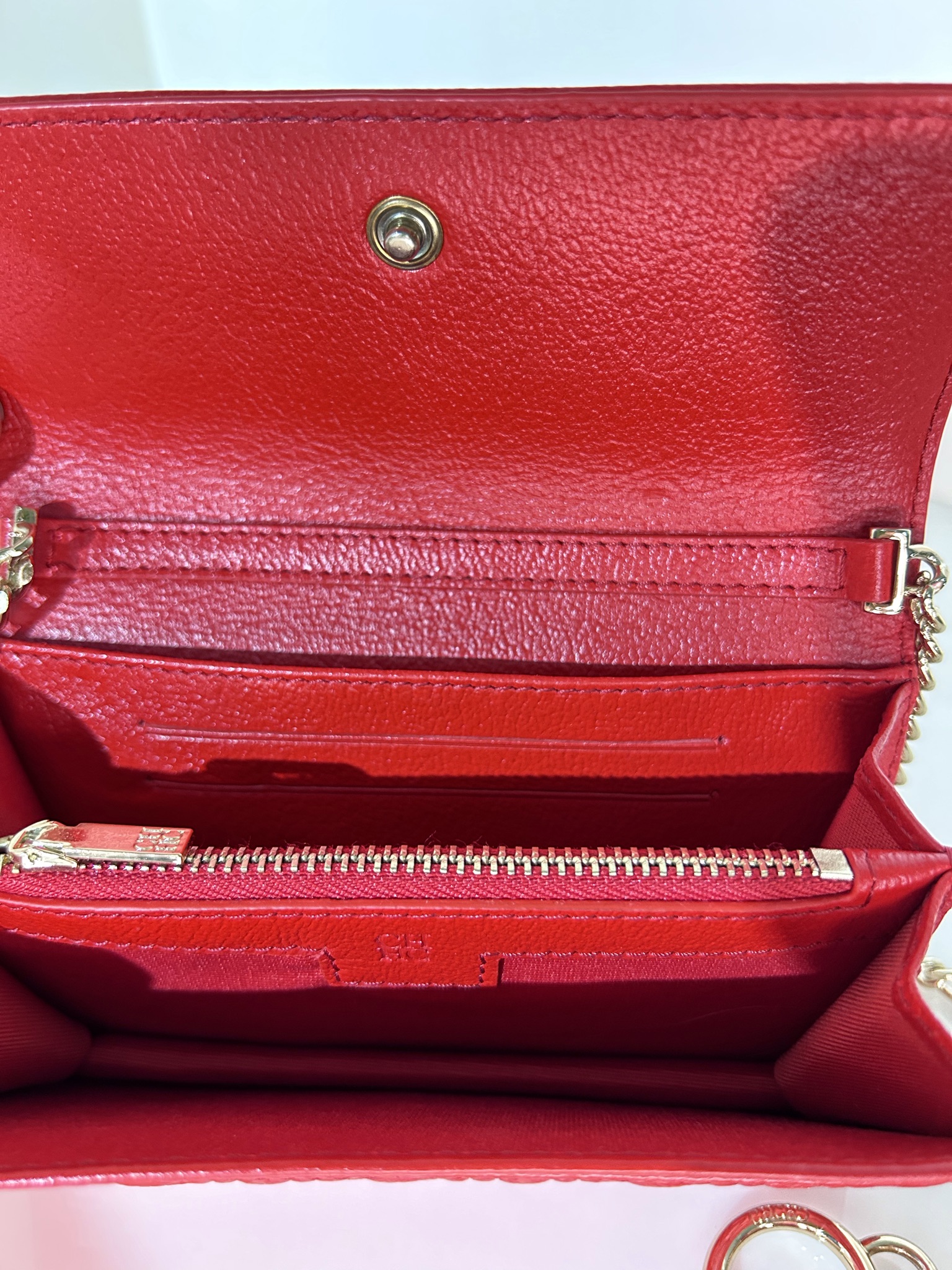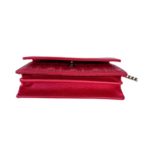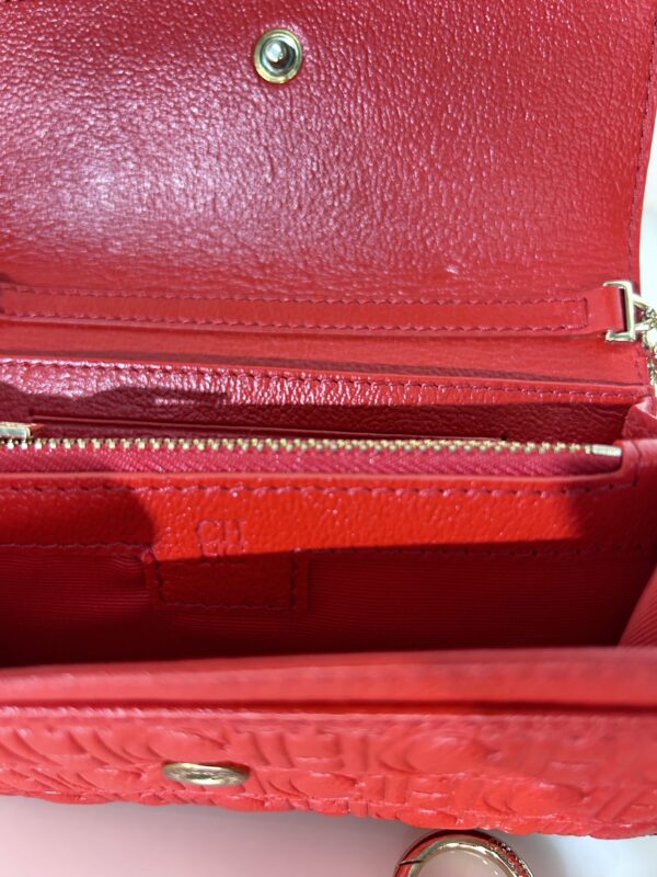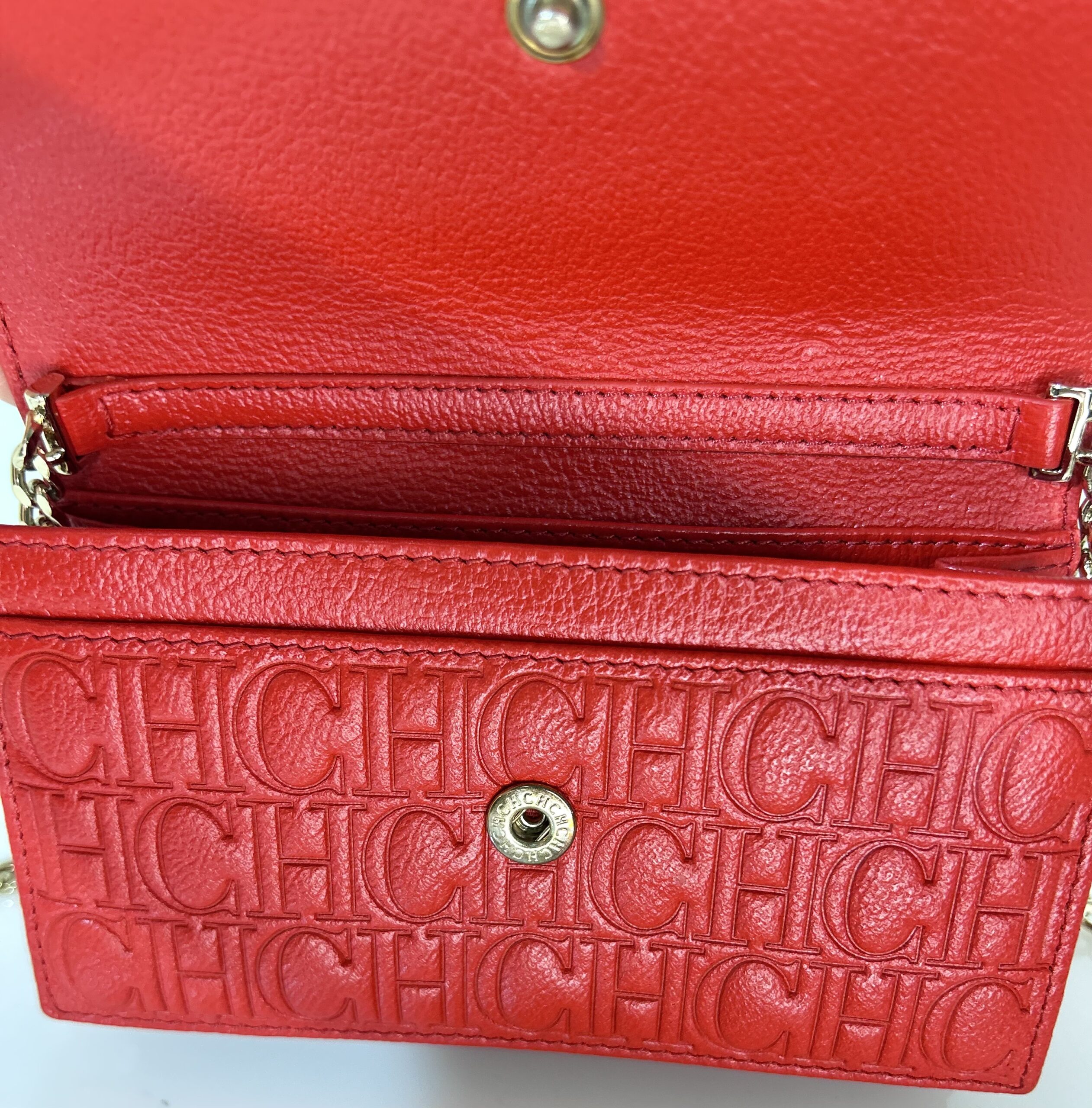 Crossbody tamaño mini de cuero monogram rojo con solapa frontal con botón a presión como sistema de cierre. Logo frontal en solapa grabado en color dorado. Strap largo de Cadena dorada para usarla cruzada o al hombro. Interior en cuero rojo, con dos compartimientos separados y porta tarjetas o documentos. Contiene un bolsillo con cierre. También se puede utilizar como billetera sin Strap. Incluye un Llavero colgante removible de cuero en forma de un corazón y un círculo en color marrón y beige.