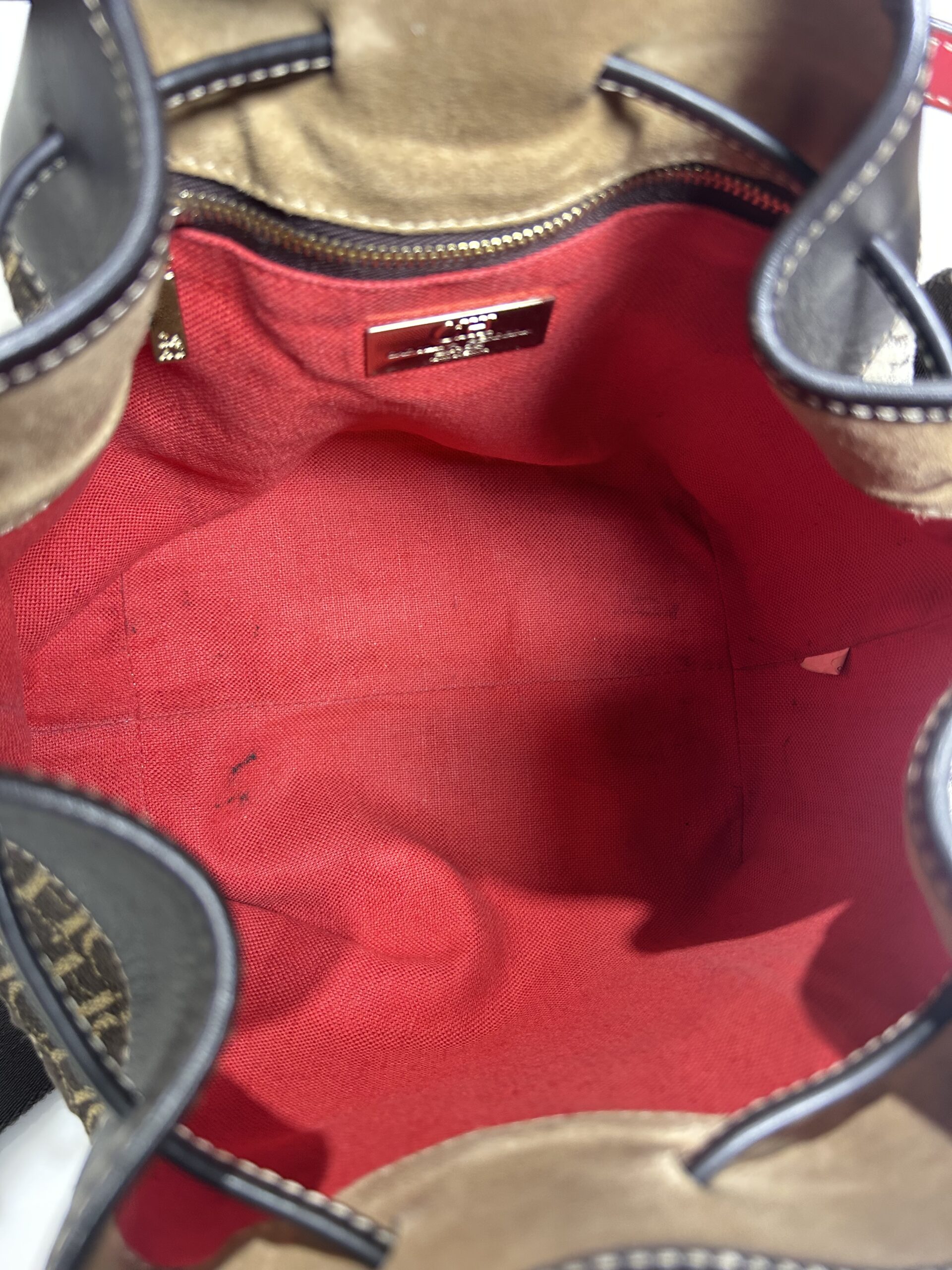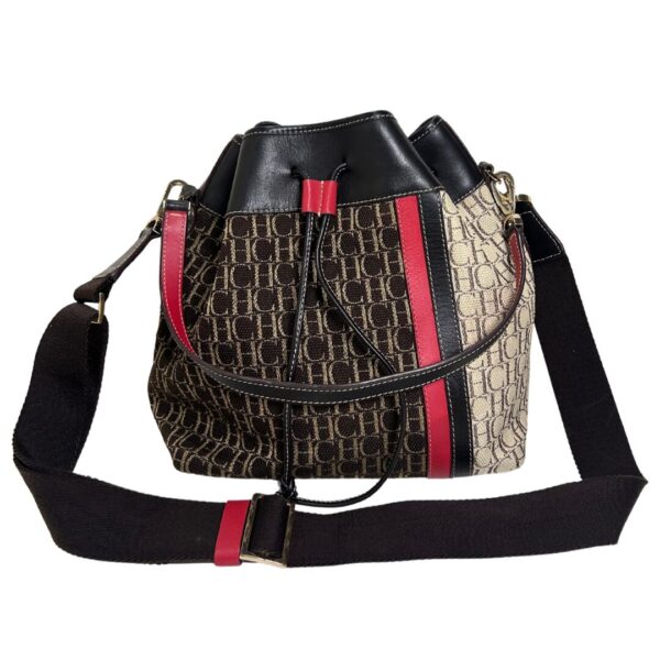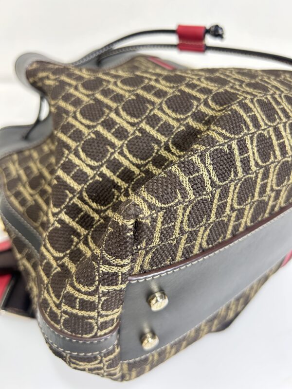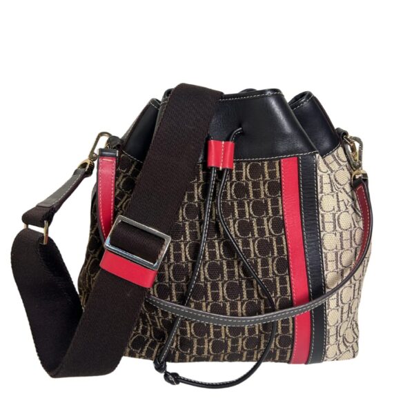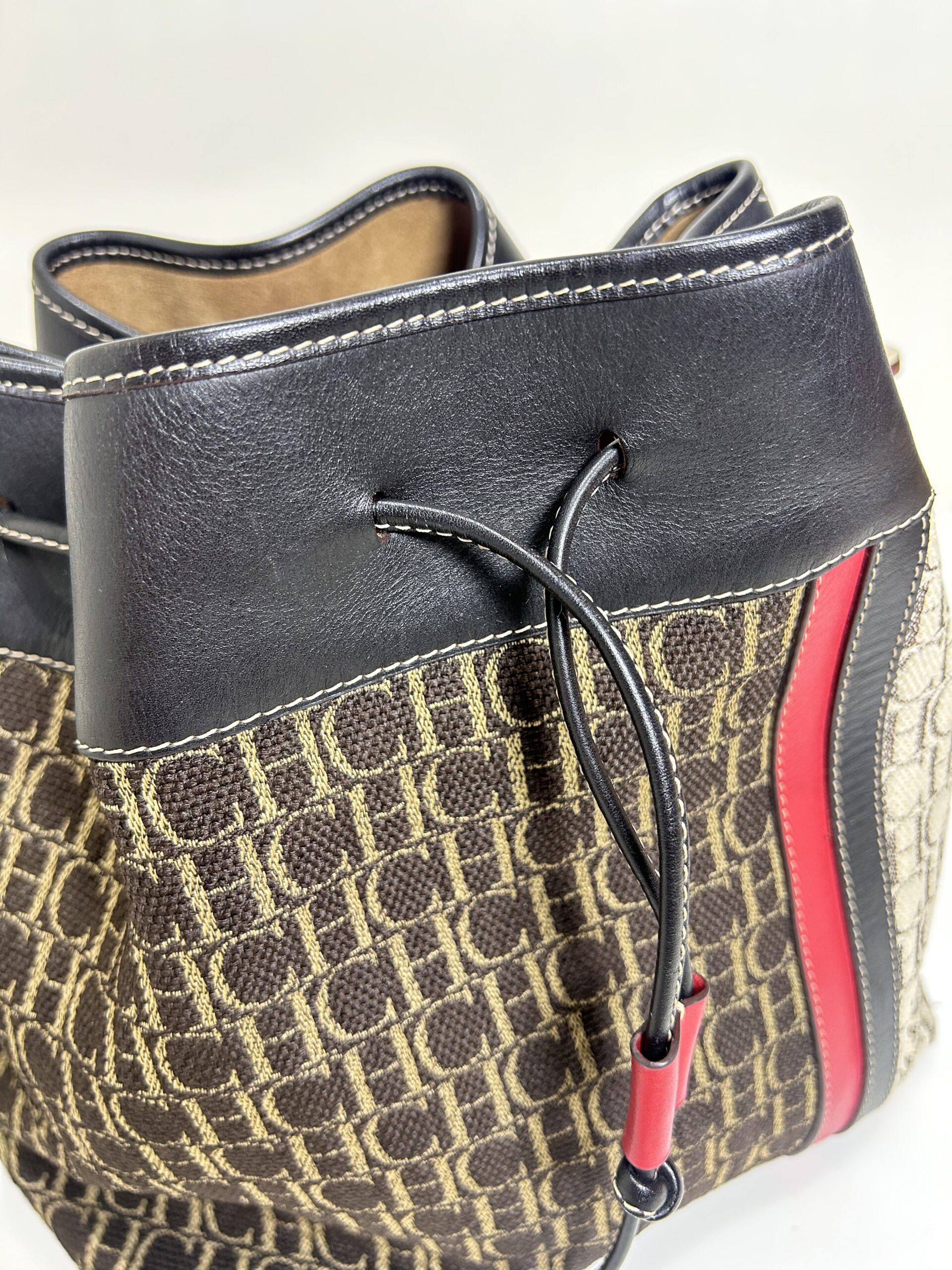Bolso modelo Bucket en tejido de lona monogram y cuero. Con curdas en cuero para cerrar. Strap largo removible en tejido de algodón marrón. También posee un Strap corto de cuero rojo m.y marrón para llevarla de mano. Tamaño mediano.