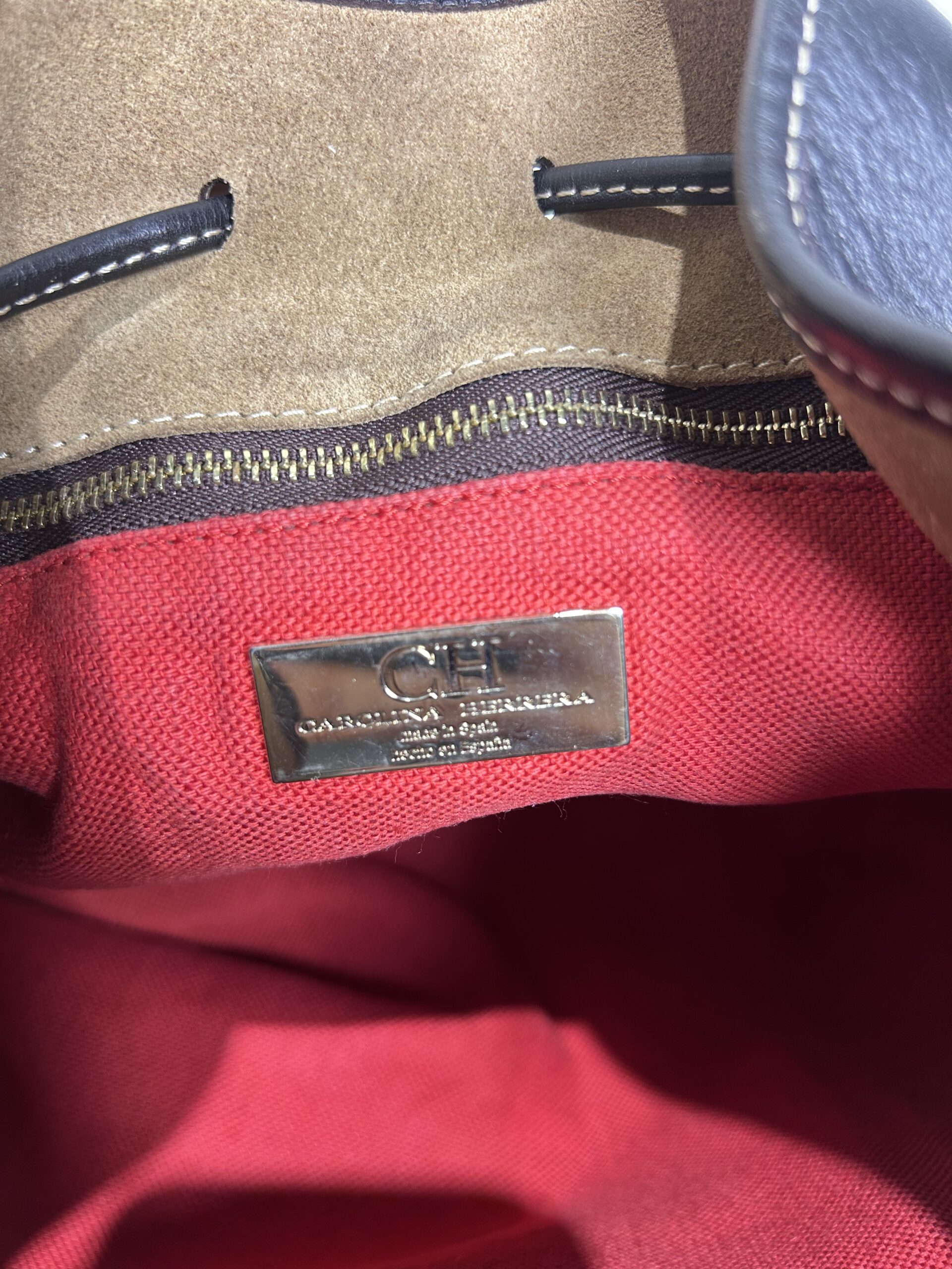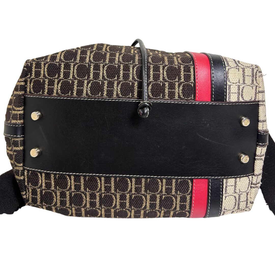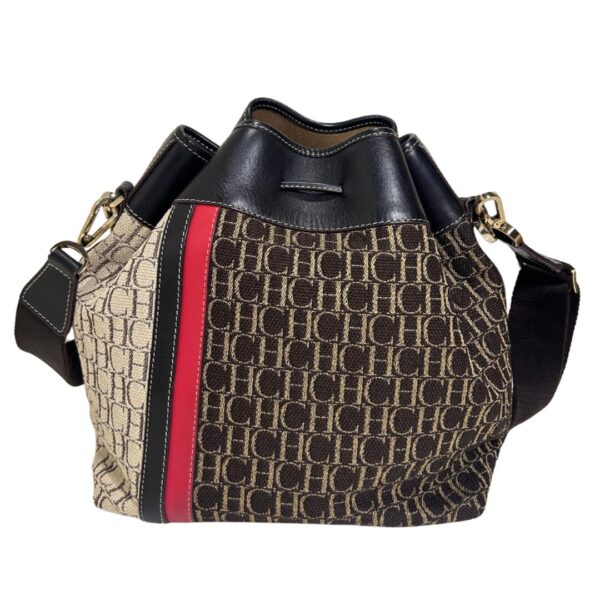 Bolso modelo Bucket en tejido de lona monogram y cuero. Con curdas en cuero para cerrar. Strap largo removible en tejido de algodón marrón. También posee un Strap corto de cuero rojo m.y marrón para llevarla de mano. Tamaño mediano.