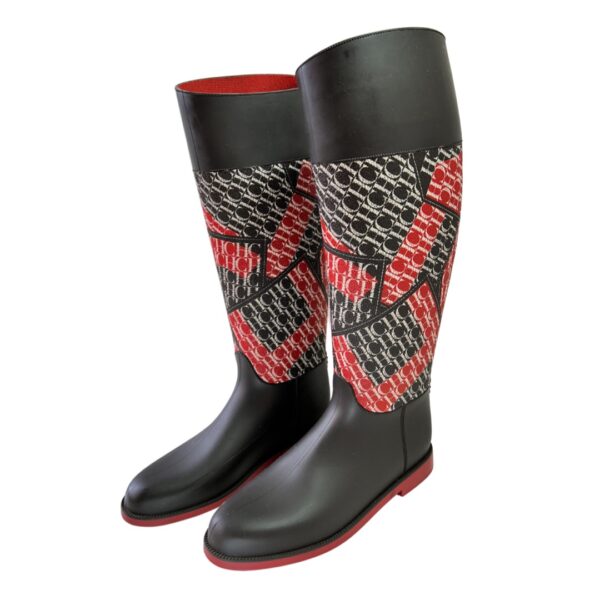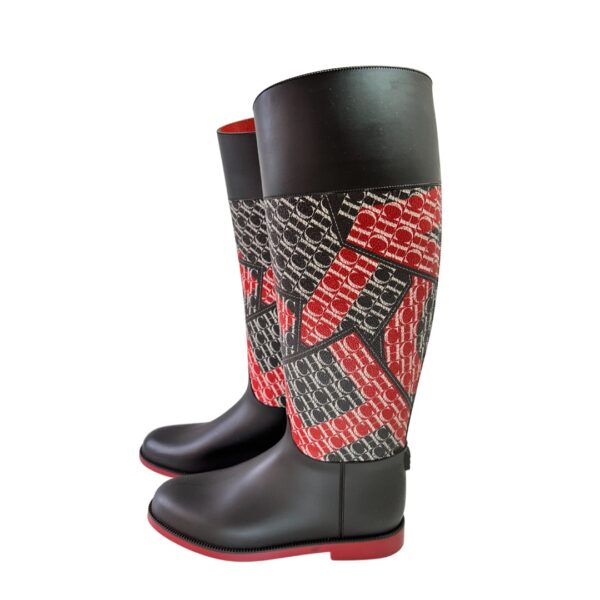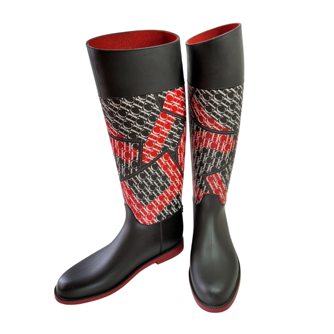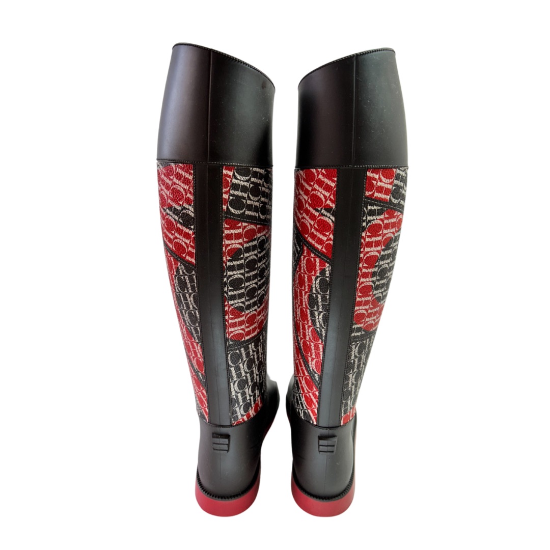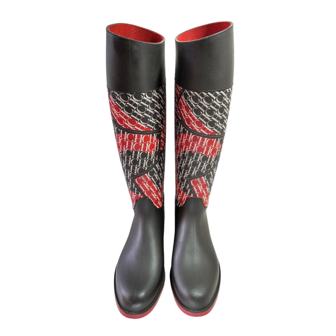 Botas de caucho negro con monogram CH blanco y rojo. Caño alto. Suela de goma roja. Interior forrado en tejido rojo. Talle 39.