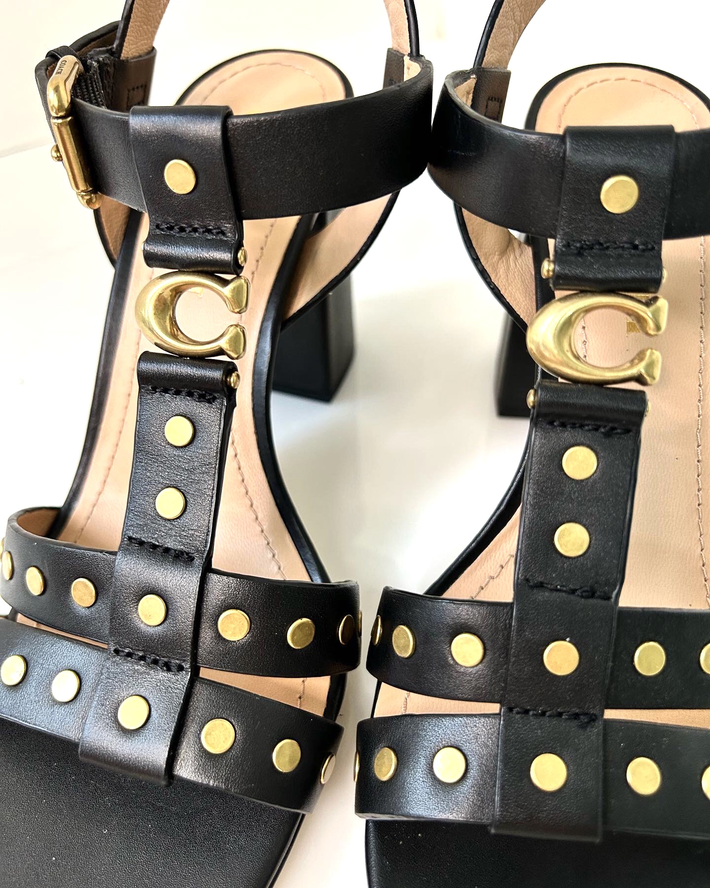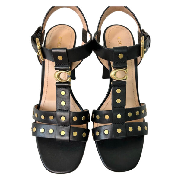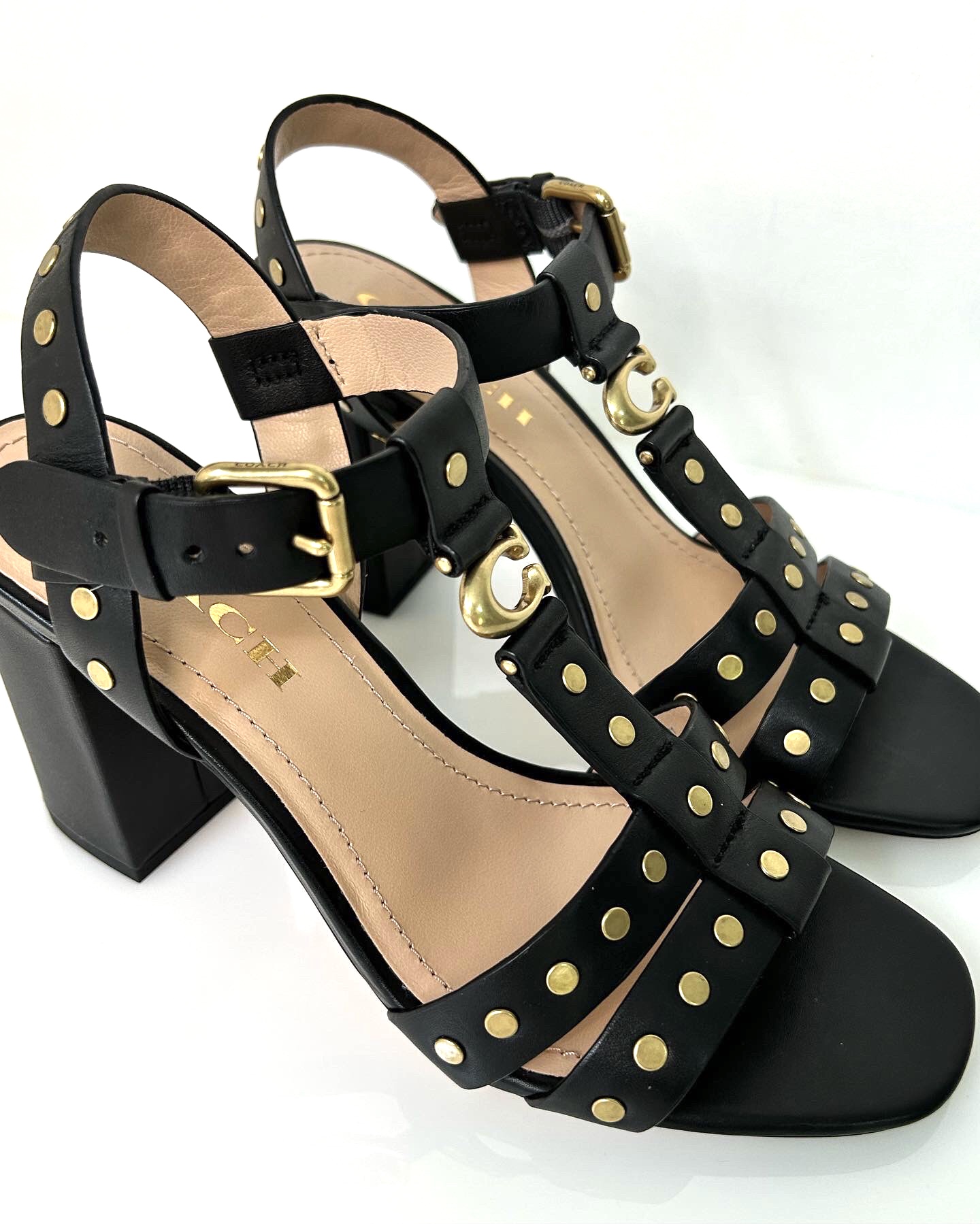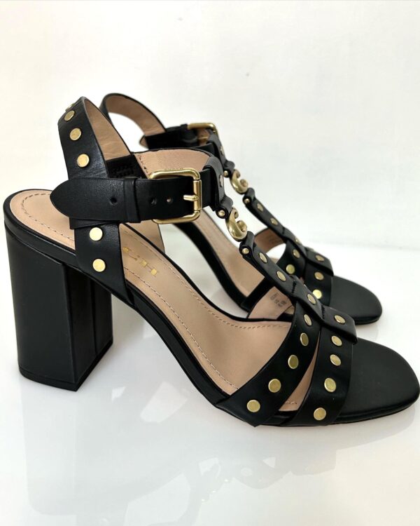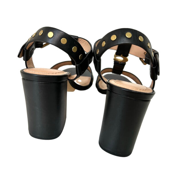 Sandalias de cuero negro con tachas doradas y taco ancho medio. Con hebilla de logo frontal en metal dorado. Interior y suela de cuero. Talle 36 1/2.