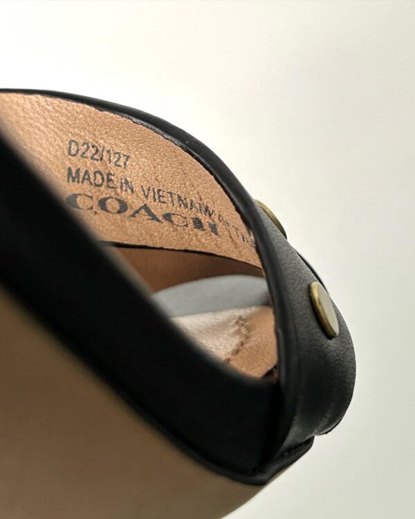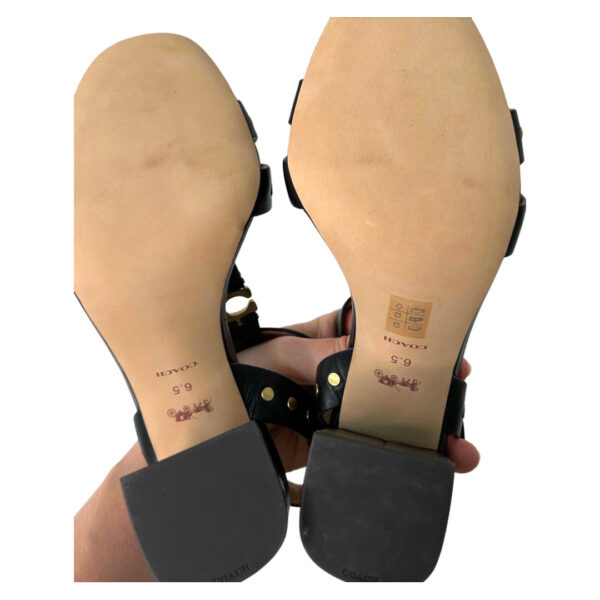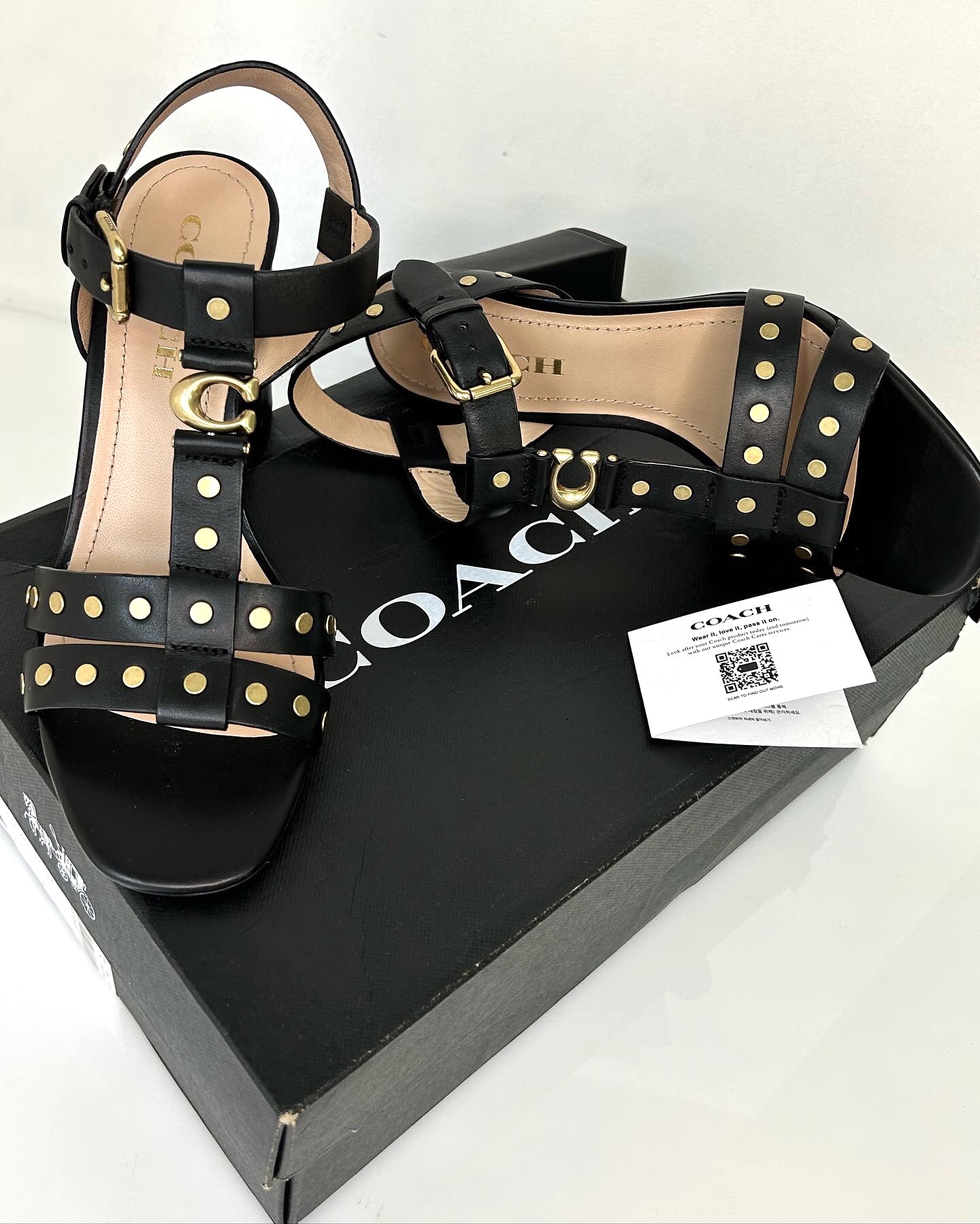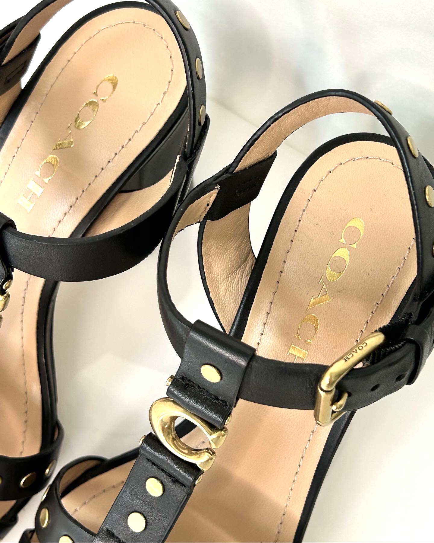 Sandalias de cuero negro con tachas doradas y taco ancho medio. Con hebilla de logo frontal en metal dorado. Interior y suela de cuero. Talle 36 1/2.