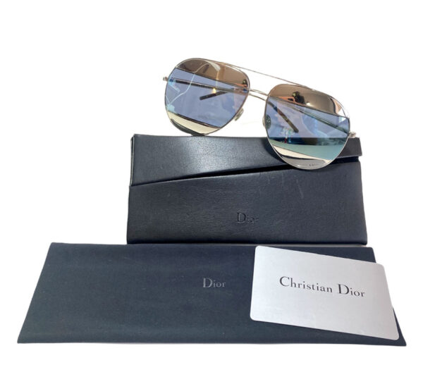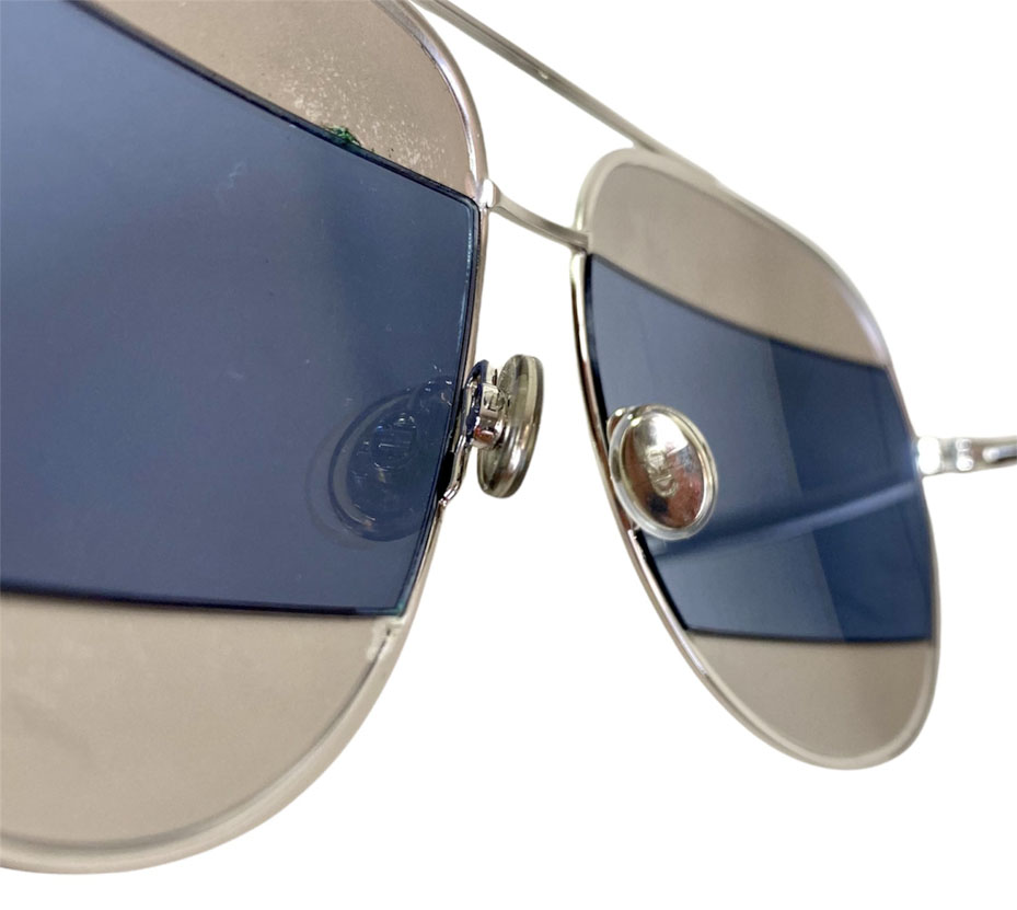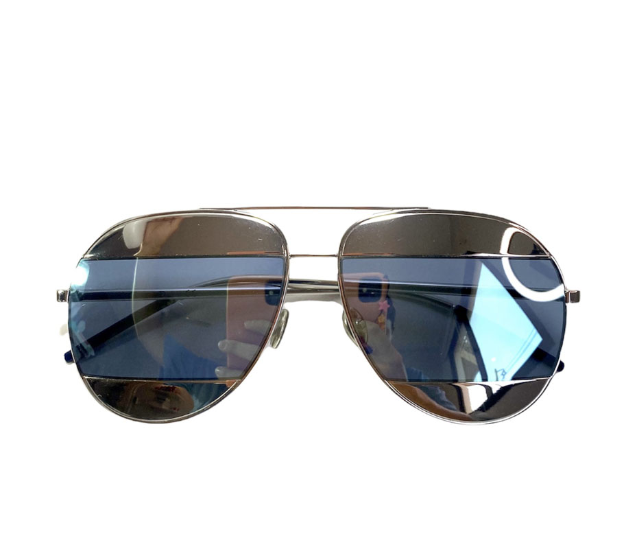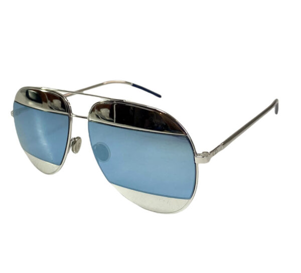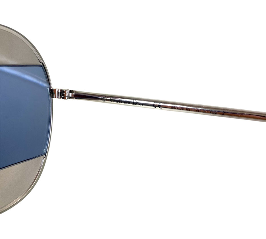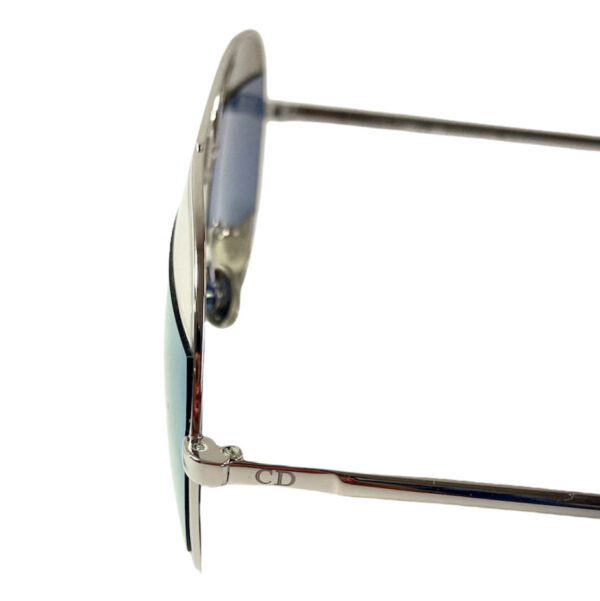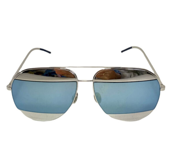 Lentes de sol femenino en vidrio espejado tono metálico y celeste espejado. Con patillas en metal plateado.