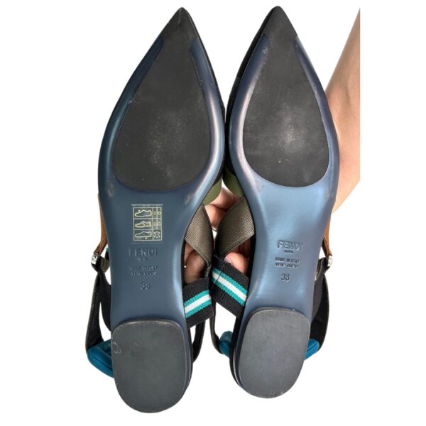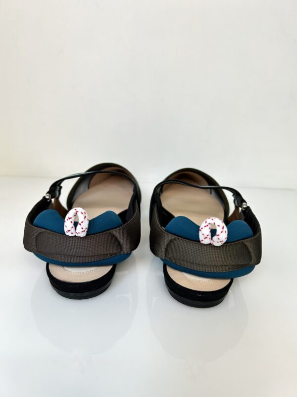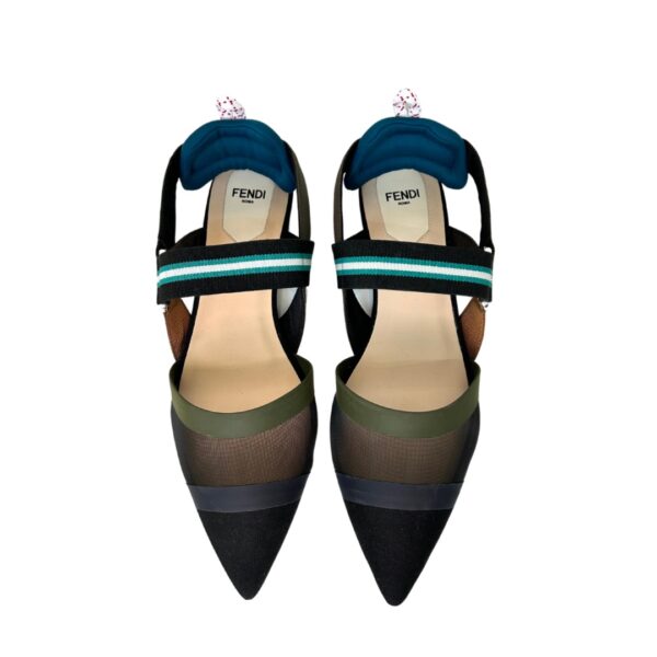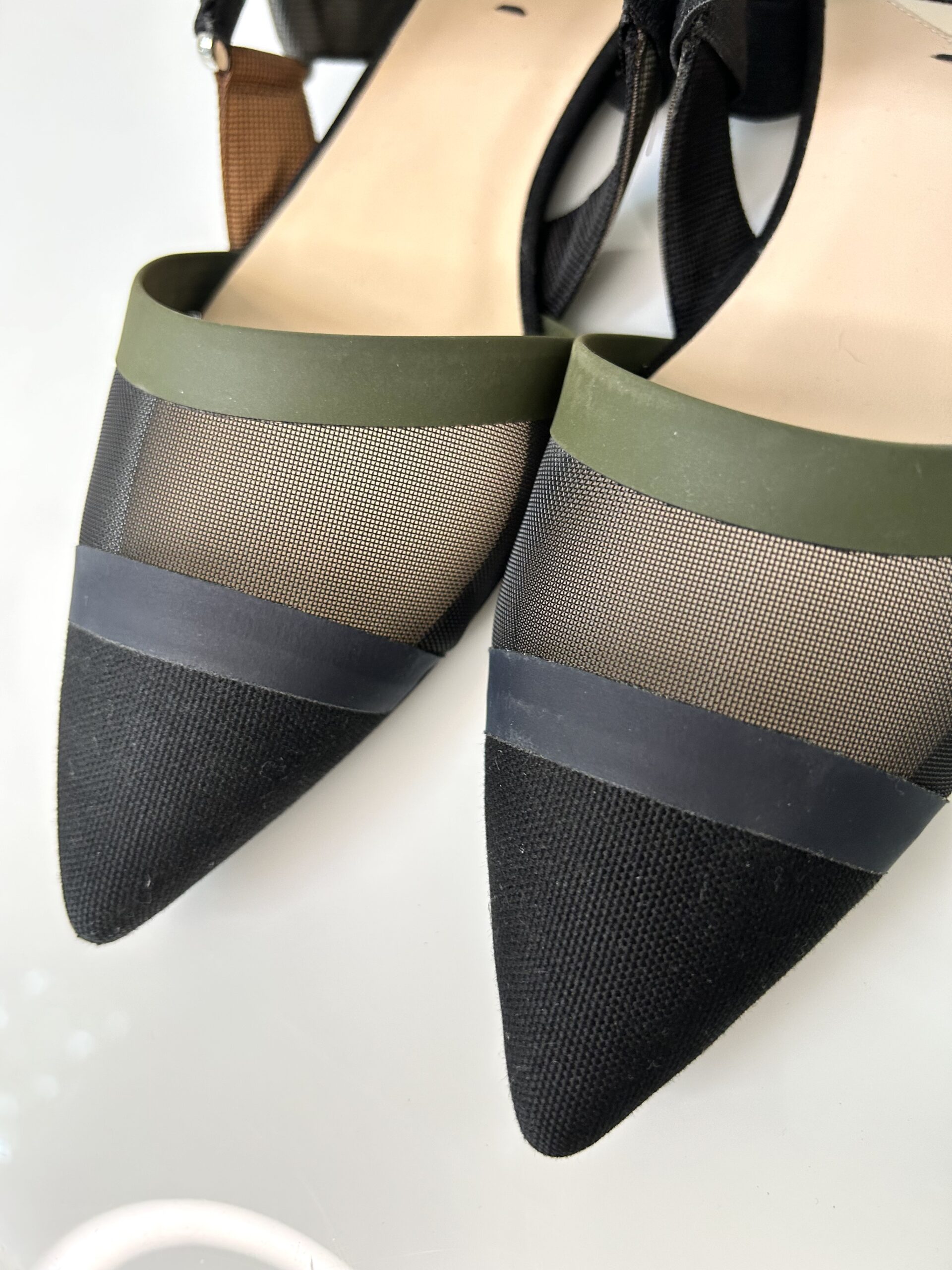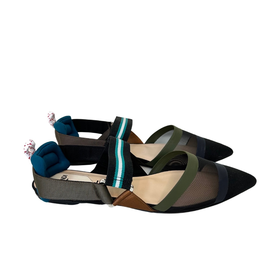 Chatitas planas en punta. De tejido red negro, gamuza, con detalles en tono verde musgo, azul, gris y marrón. Talle 38.