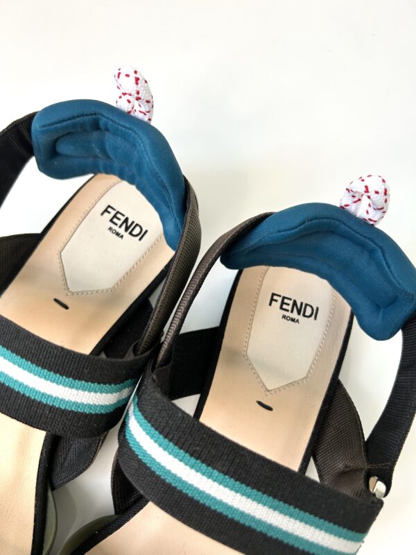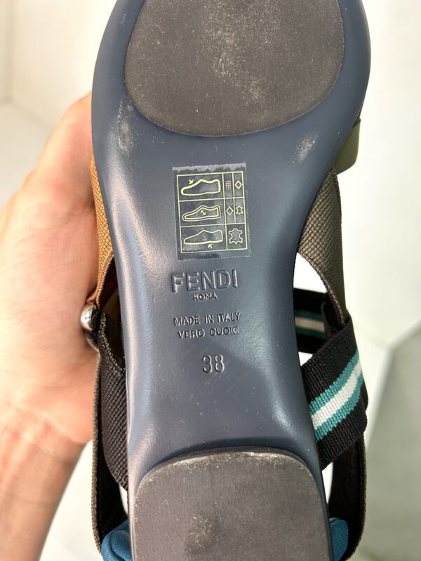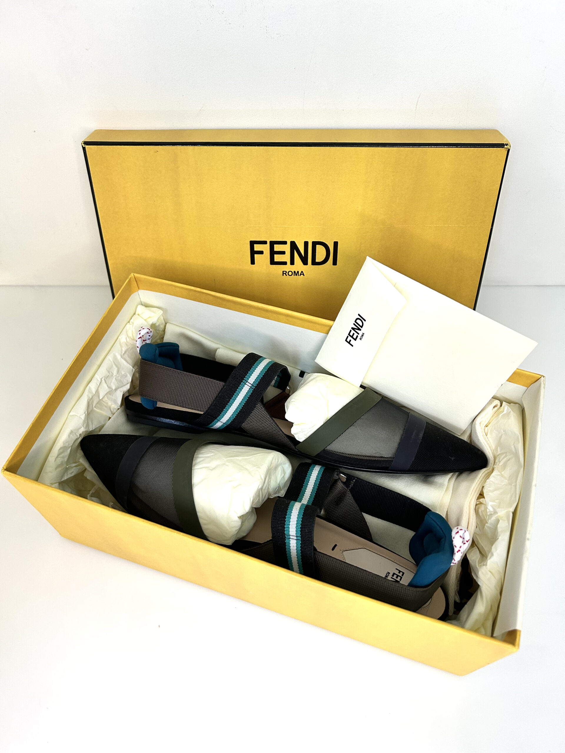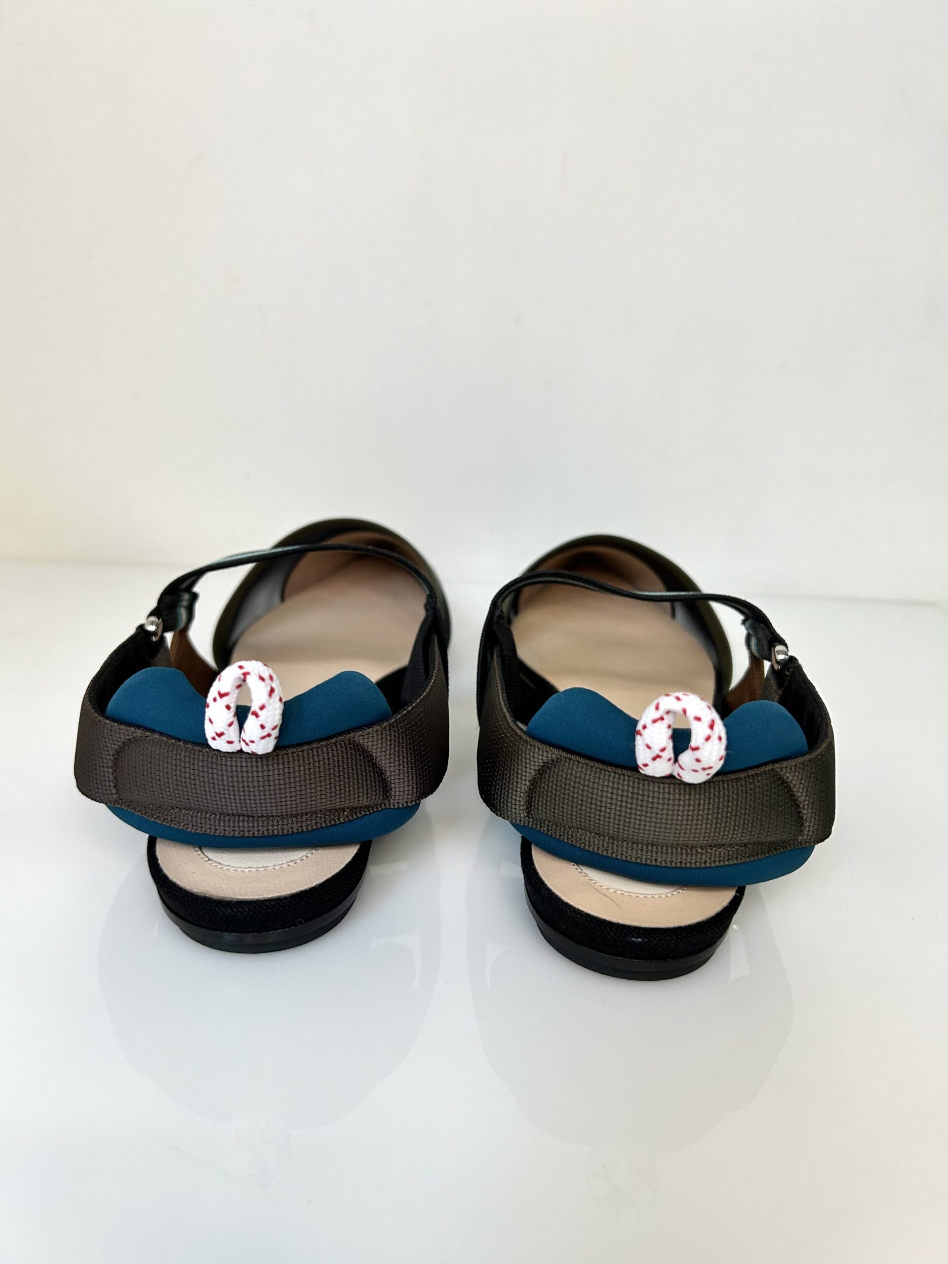 Chatitas planas en punta. De tejido red negro, gamuza, con detalles en tono verde musgo, azul, gris y marrón. Talle 38.