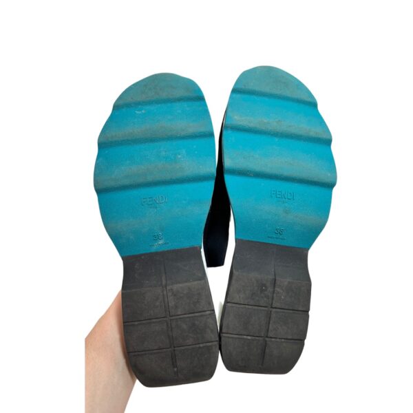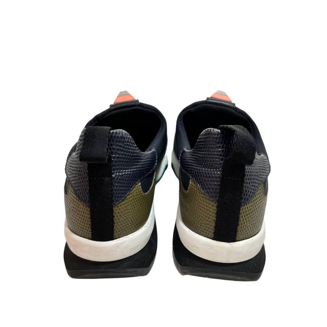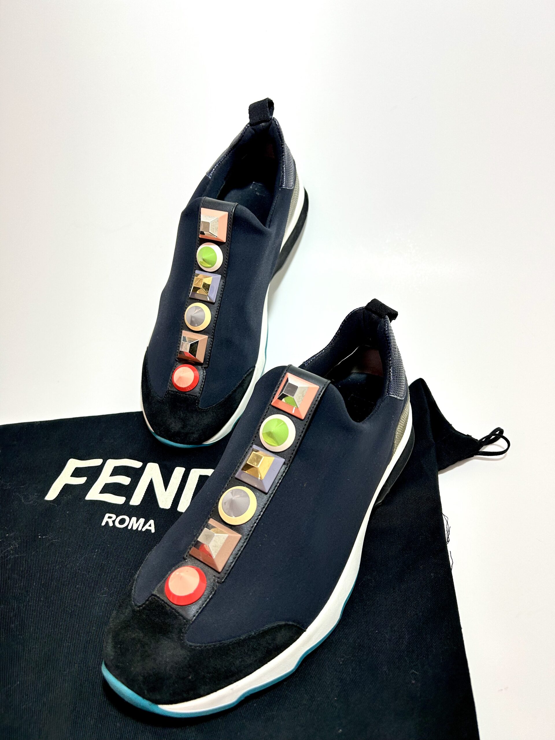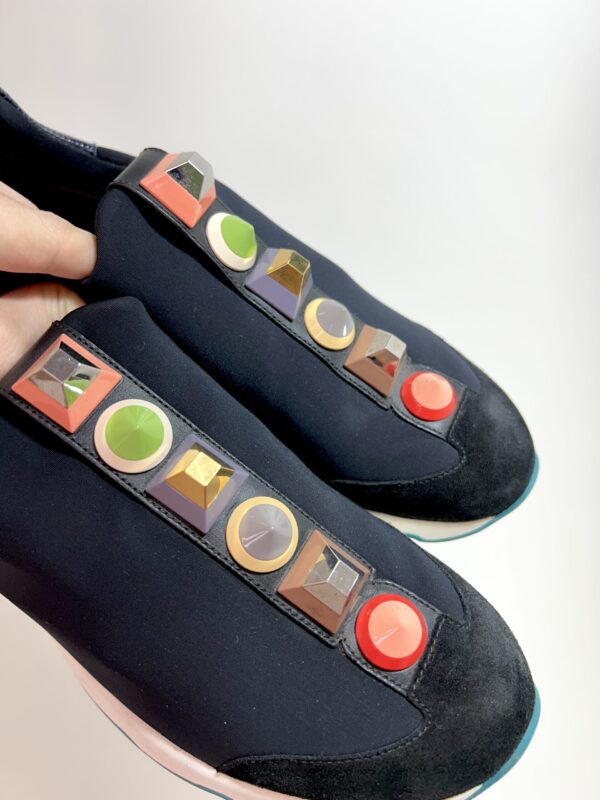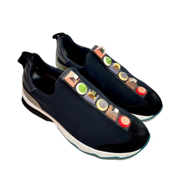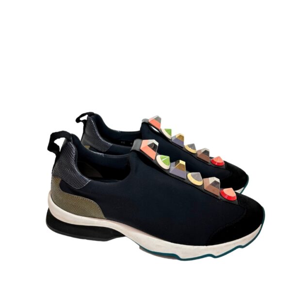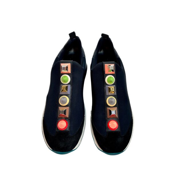 Sneakers de nylon color negro con tachas metálicas de colores y detalles en cuero gamuzado negro. Suela de goma blanca y azul. Sin cordones. Suela interna en cuero negro. Talle 38.