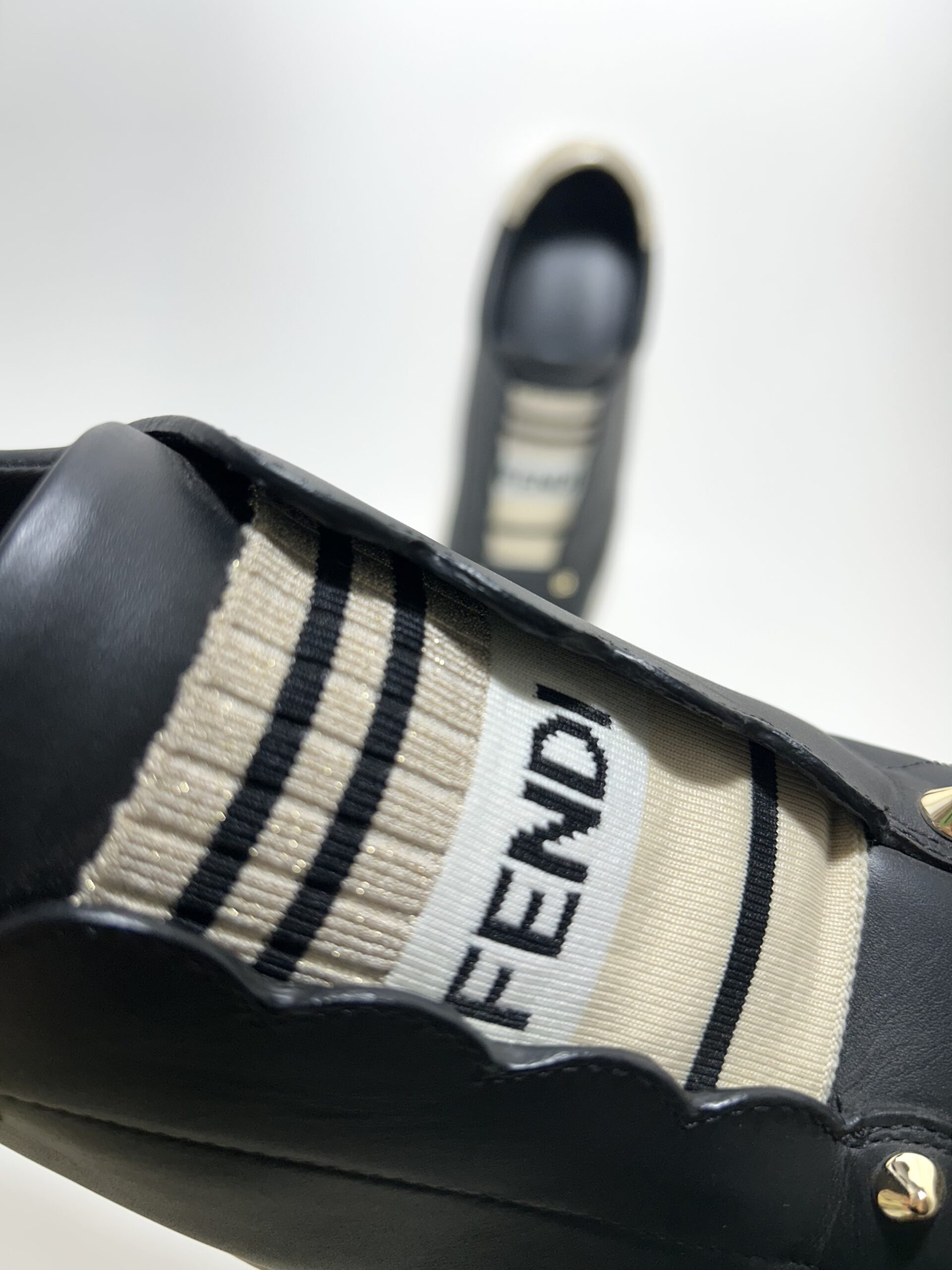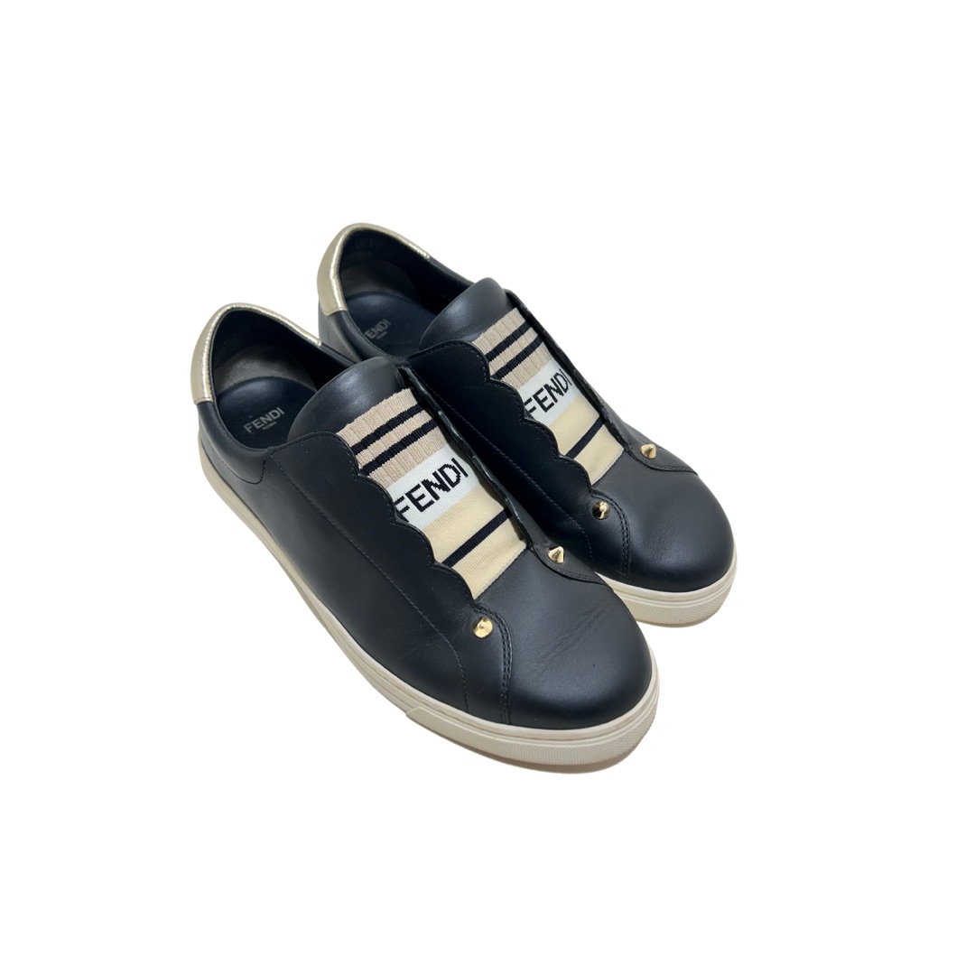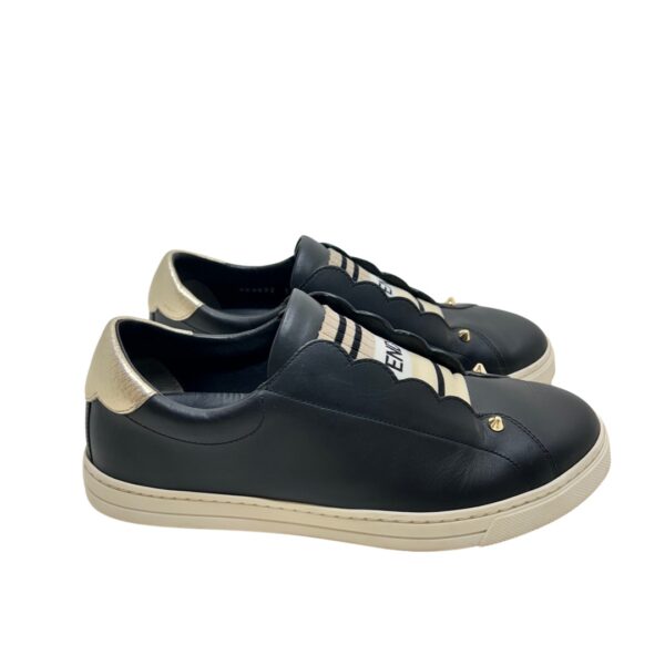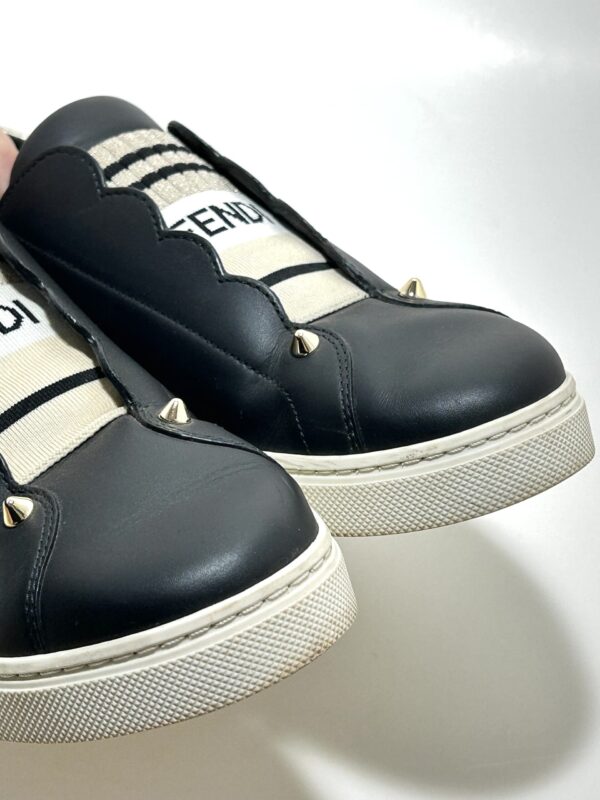 Championcitos de cuero negro con solapa con logo en tejido brillante en color beige. Tachas doradas en la punta. Interior forrado en cuero color negro.