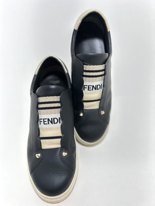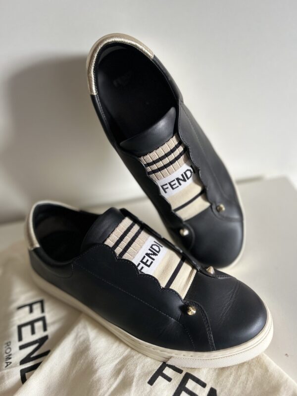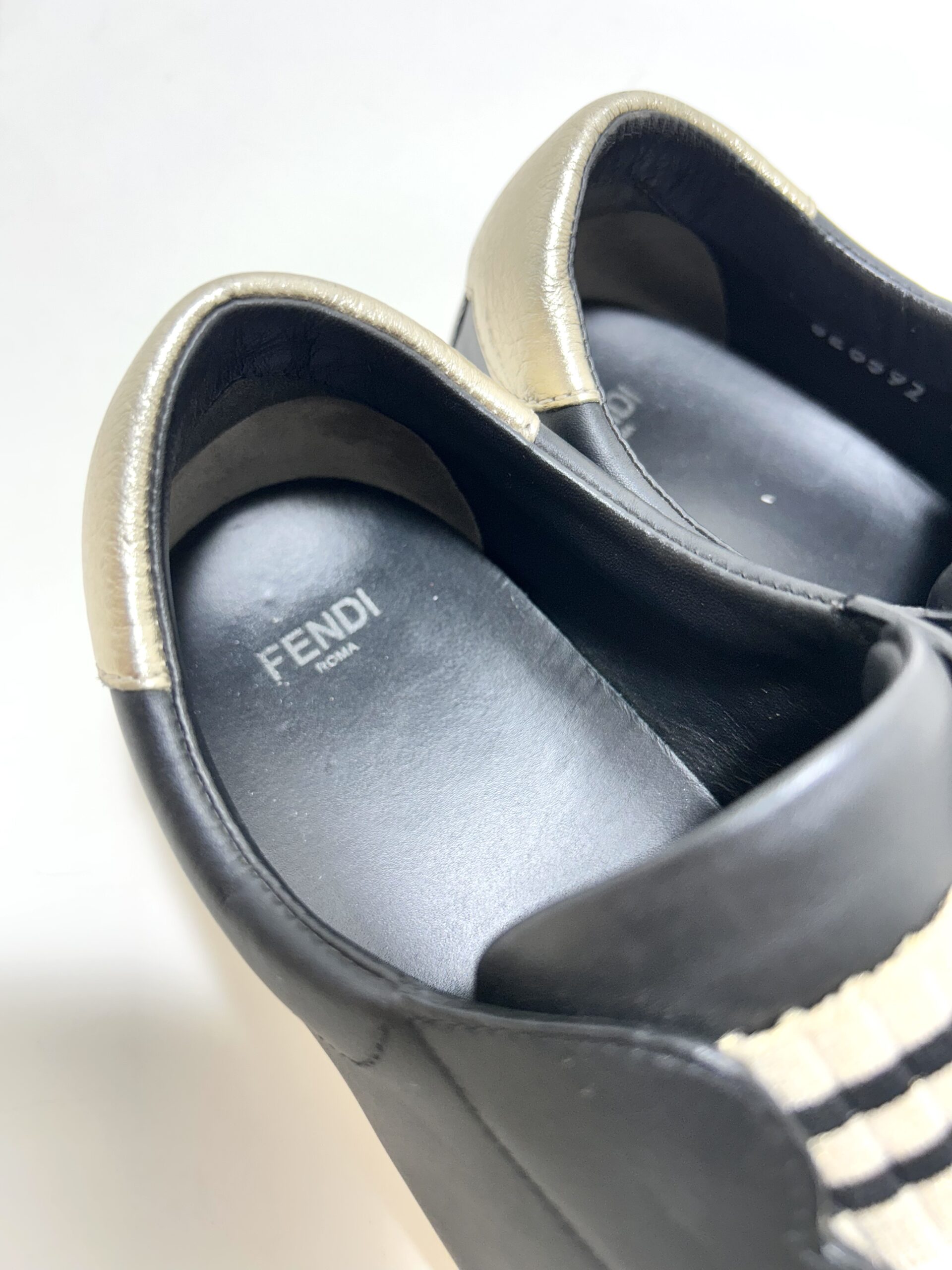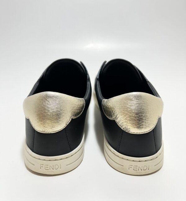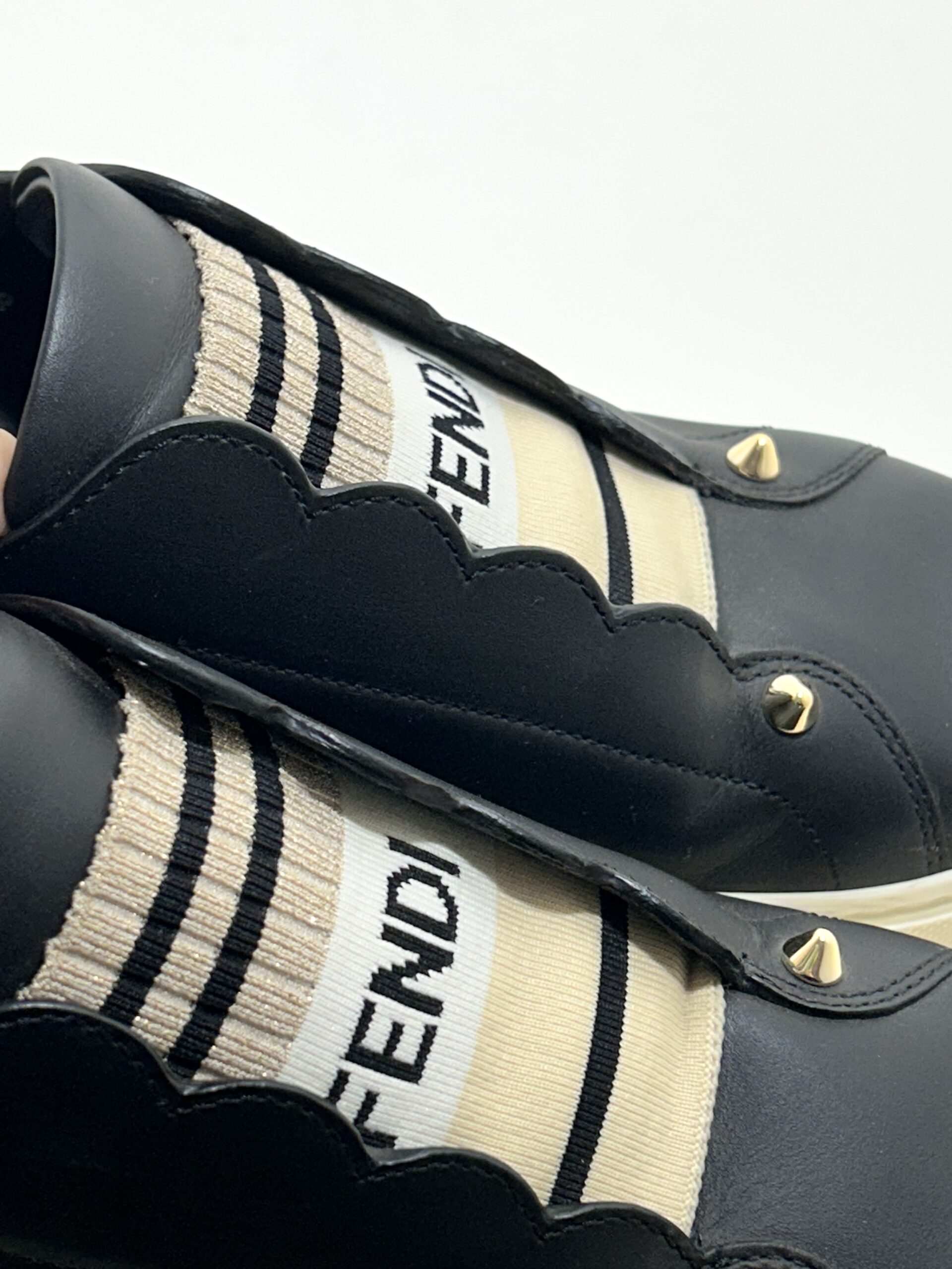 Championcitos de cuero negro con solapa con logo en tejido brillante en color beige. Tachas doradas en la punta. Interior forrado en cuero color negro.