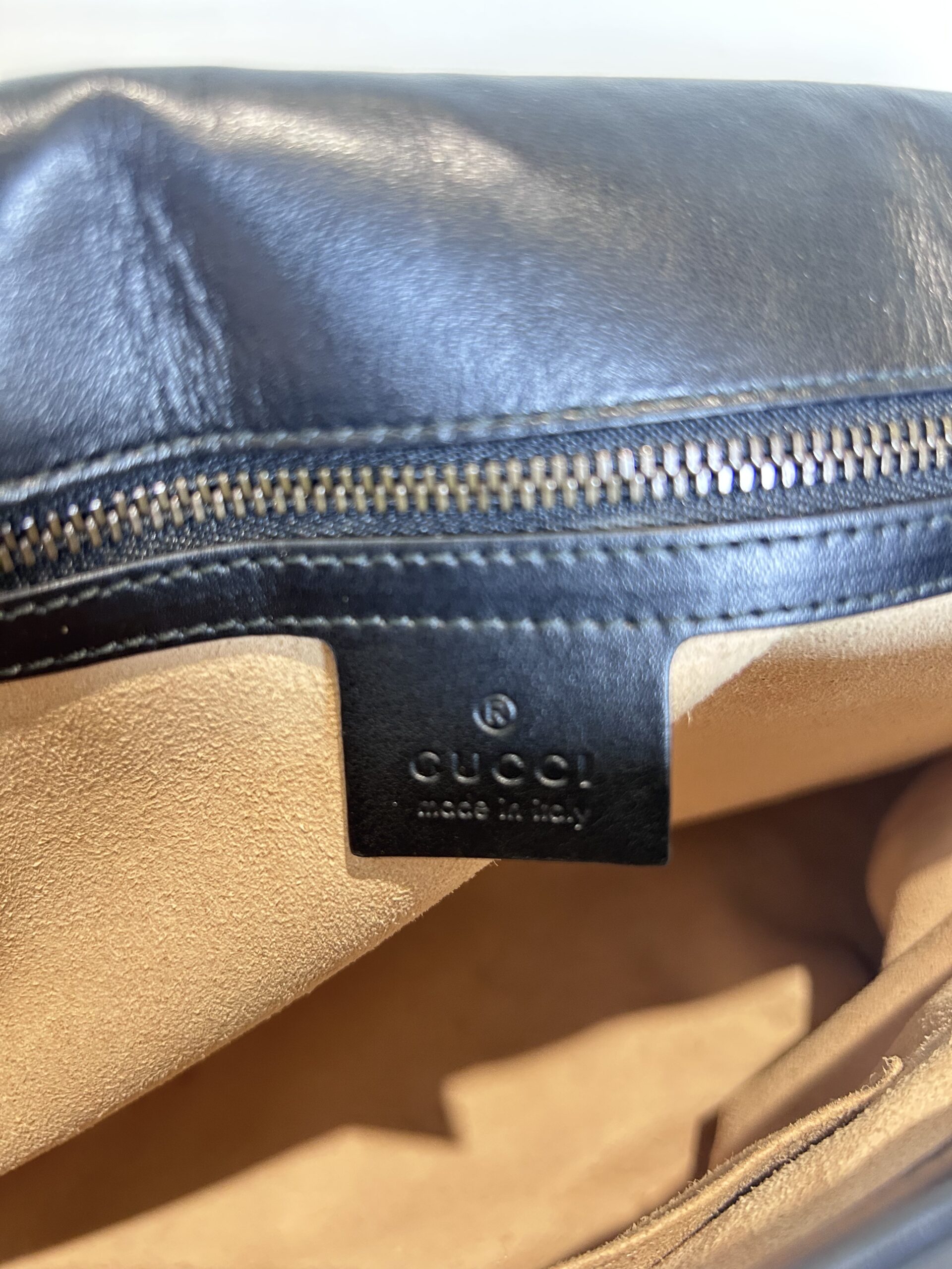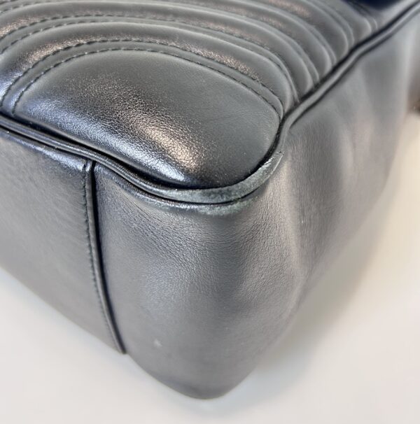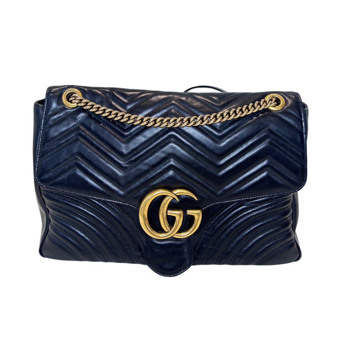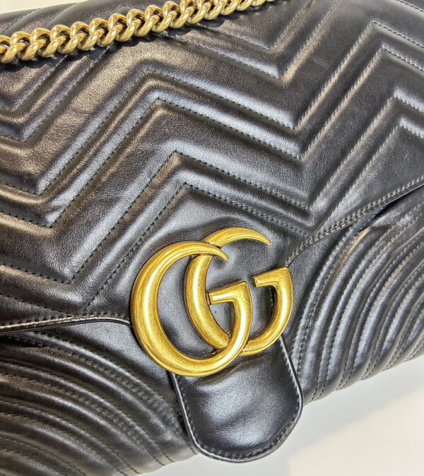 Bolso de hombro en cuero acolchado color negro con asa larga de cuero y Cadena dorada. Prendedor frontal con logo GG en metal dorado. Asa larga para usarla cruzada o al hombro. Se puede regular el largor. Interior revestido en cuero gamuzado color nude. Con bolsillo interno con cierre. Tamaño grande. Interior espacioso.
