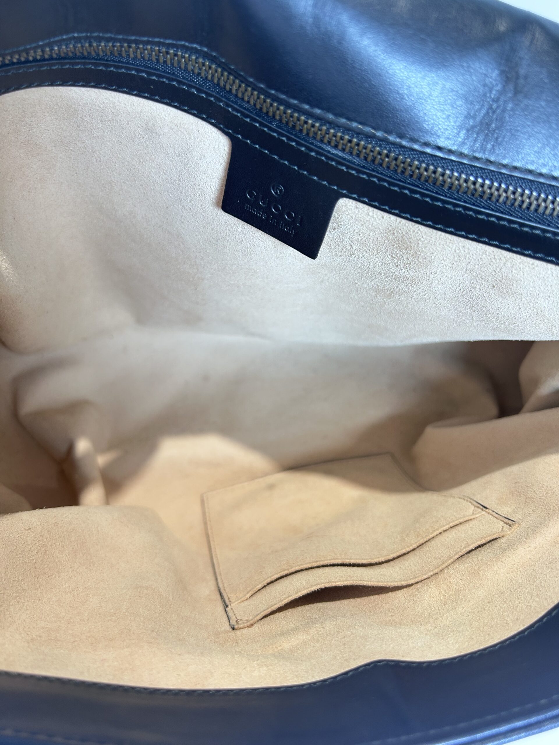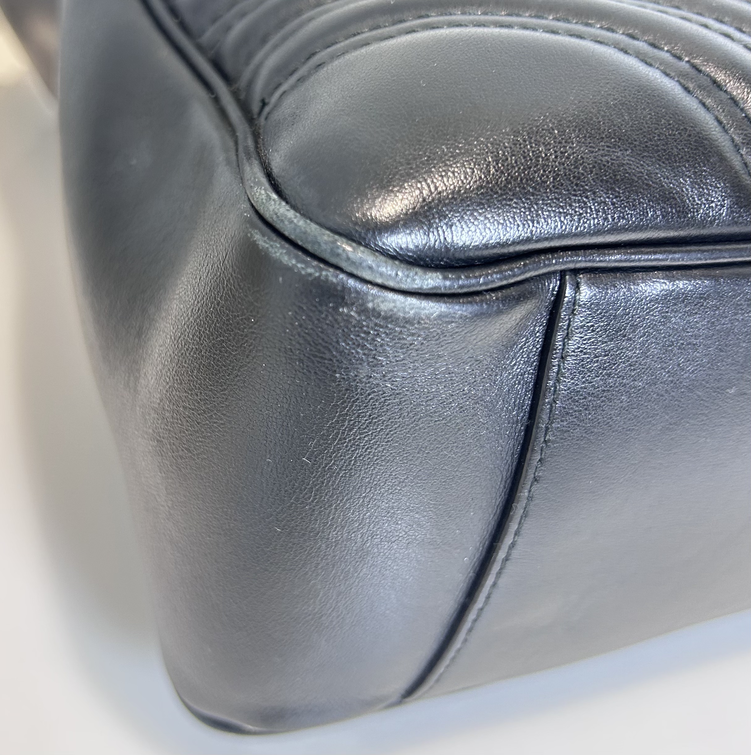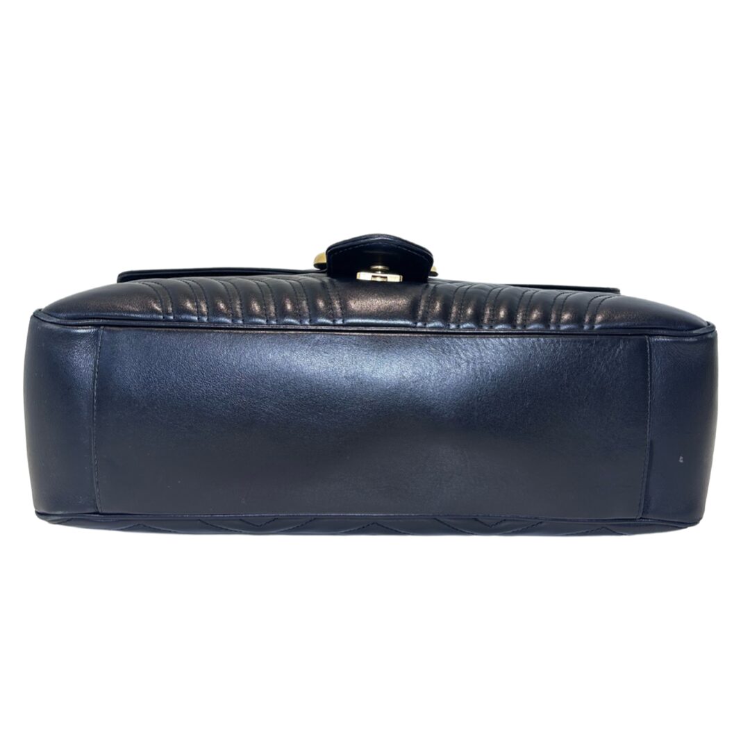 Bolso de hombro en cuero acolchado color negro con asa larga de cuero y Cadena dorada. Prendedor frontal con logo GG en metal dorado. Asa larga para usarla cruzada o al hombro. Se puede regular el largor. Interior revestido en cuero gamuzado color nude. Con bolsillo interno con cierre. Tamaño grande. Interior espacioso.
