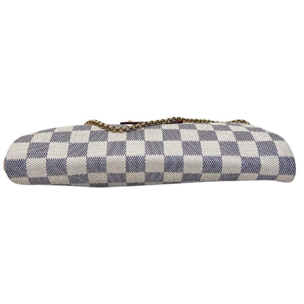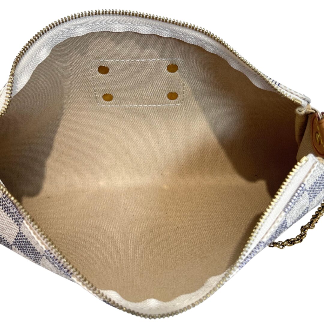 Bolso pequeño modelo pochette en monogram Damier azur blanco con detalles en cuero color natural. Incluye dos straps, uno corto de Cadena dorada para llevar el bolso de mano y un Strap largo removible de cuero color natural para llevar el bolso cruzado o al hombro. Placa frontal en metal dorado con logo de la marca. Interior revestido en tejido color beige. Tamaño pequeño.