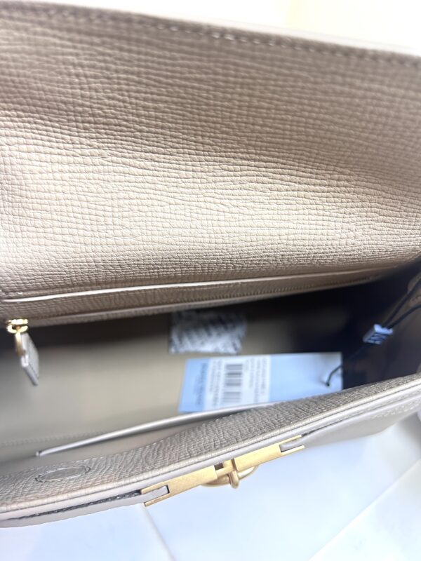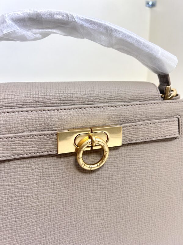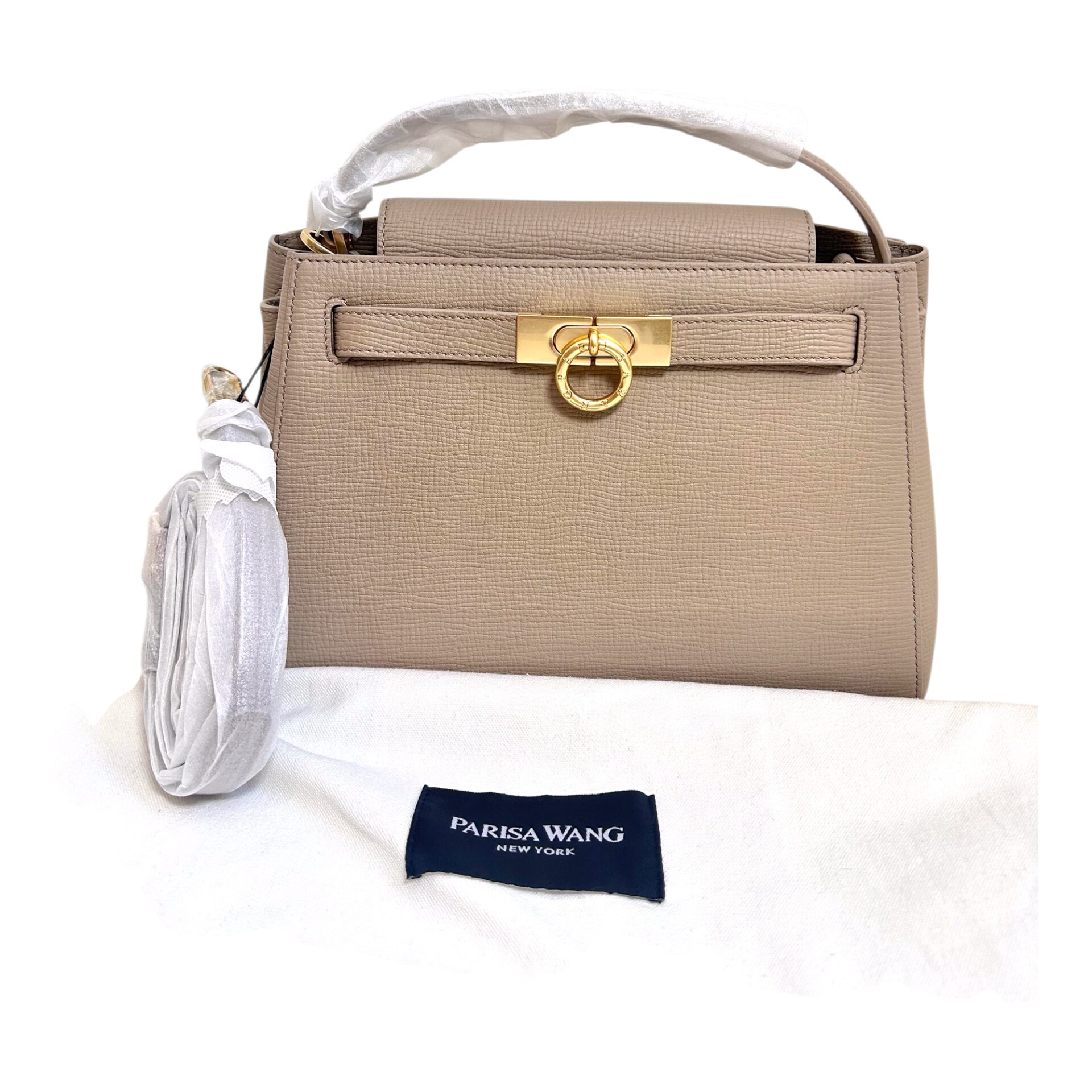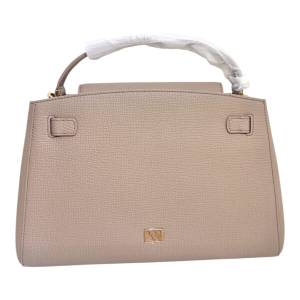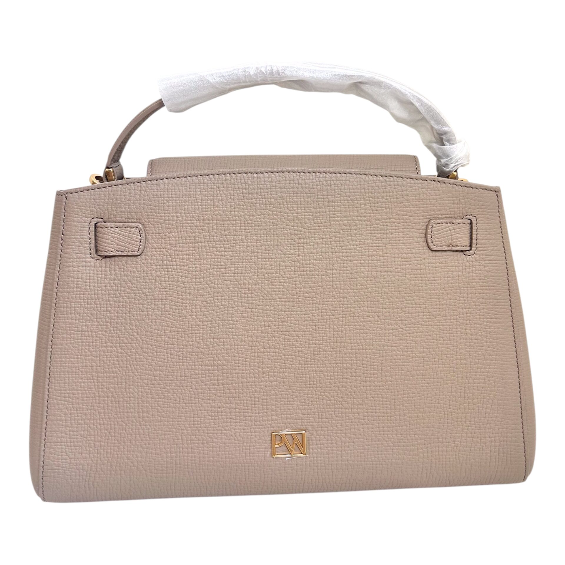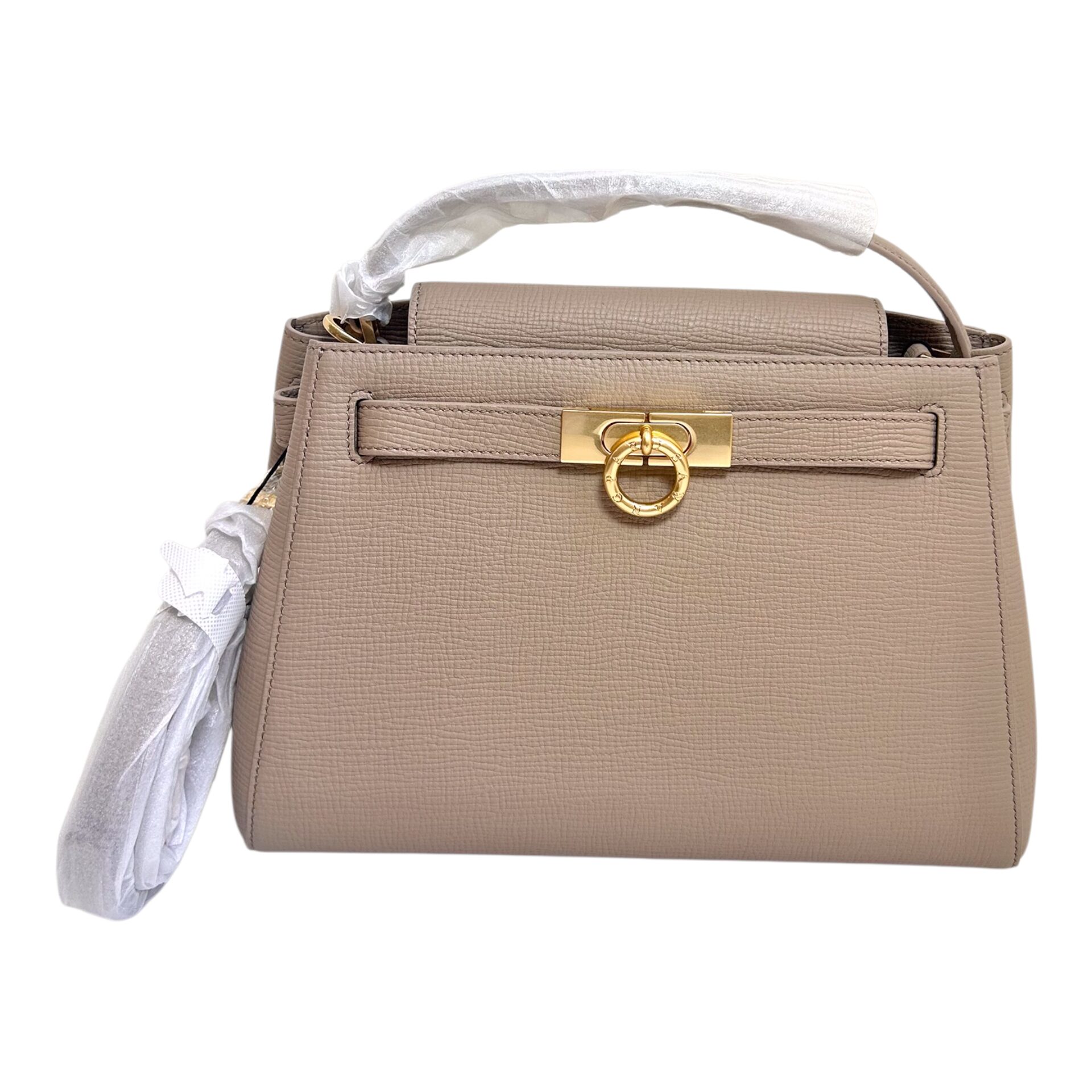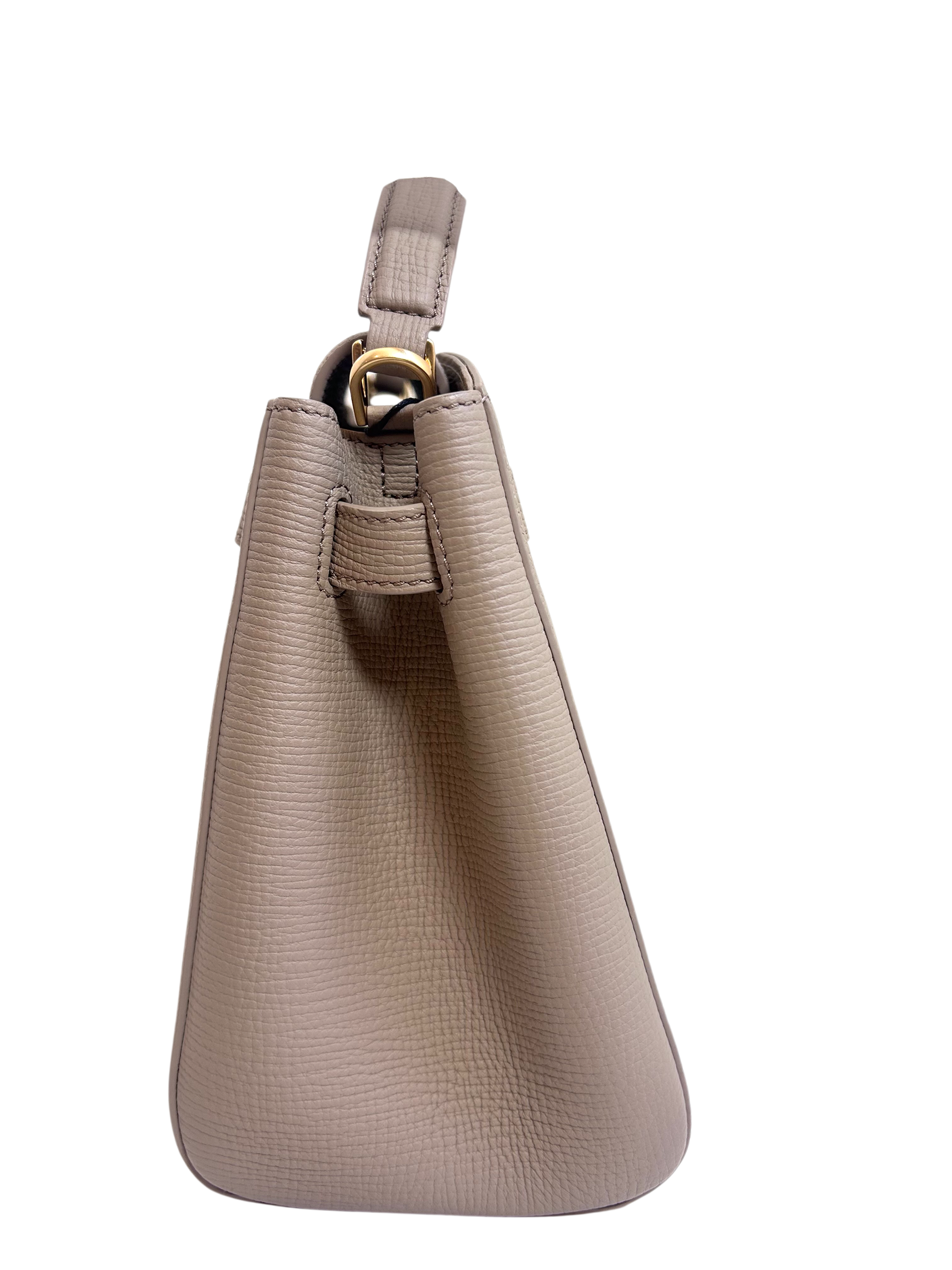 Bolso nuevo sin uso realizado en cuero “grain leather” con relieve en tono natural nude. Prendedor con iman al centro frontal del bolso en metal dorado. Con handle de mano y Strap removible de cuero en el mismo tono para llevarla cruzada o al hombro. Molde cuadrado, cómodo y liviano. Interior revestido en cuero, con bolsillo con cierre. Tamaño mediano.