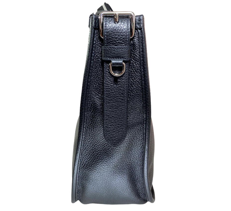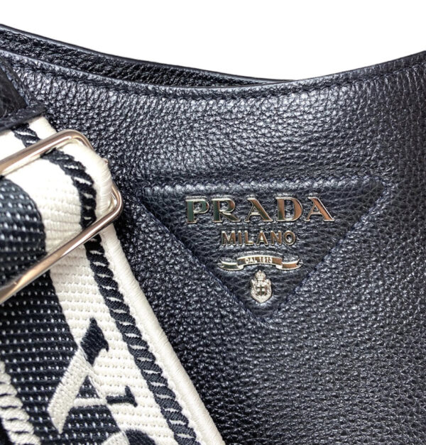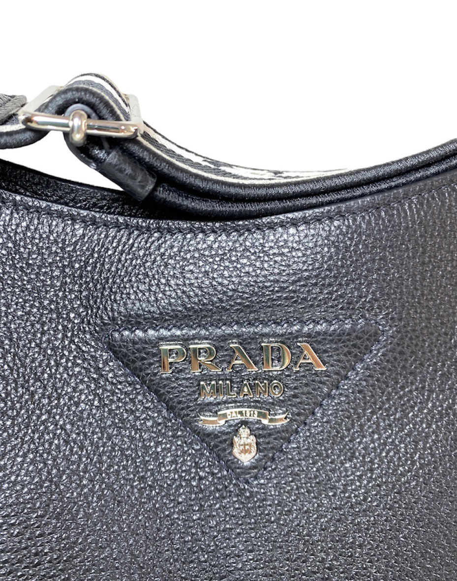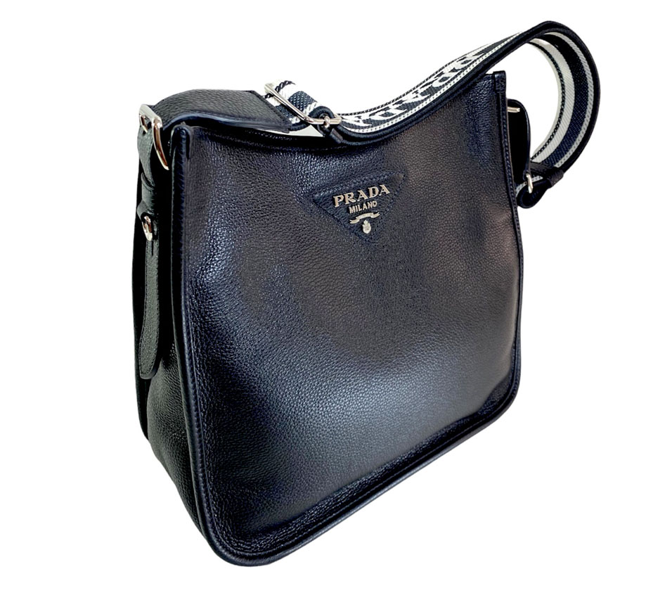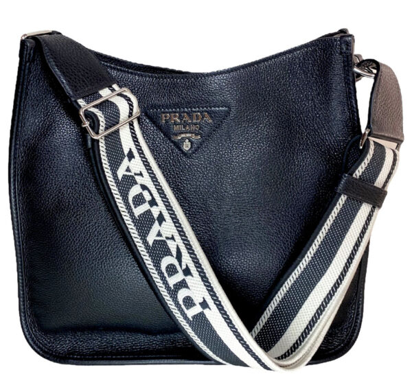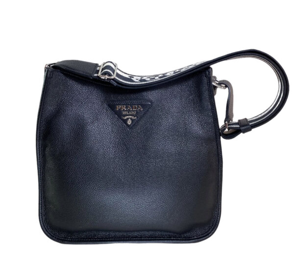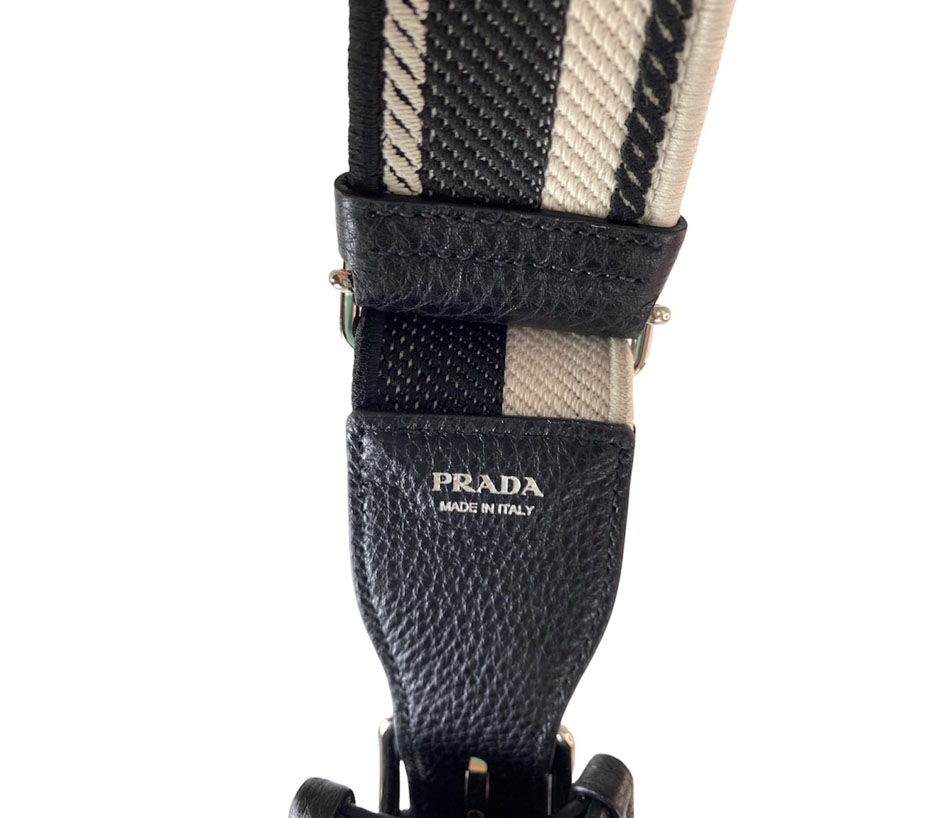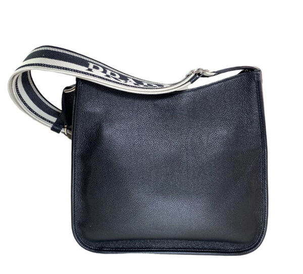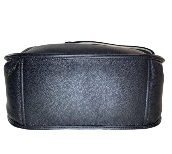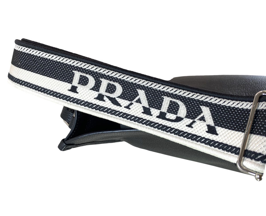 Bolso de hombro en cuero negro con strap de tejido blanco con logo negro. Tamaño mediano.