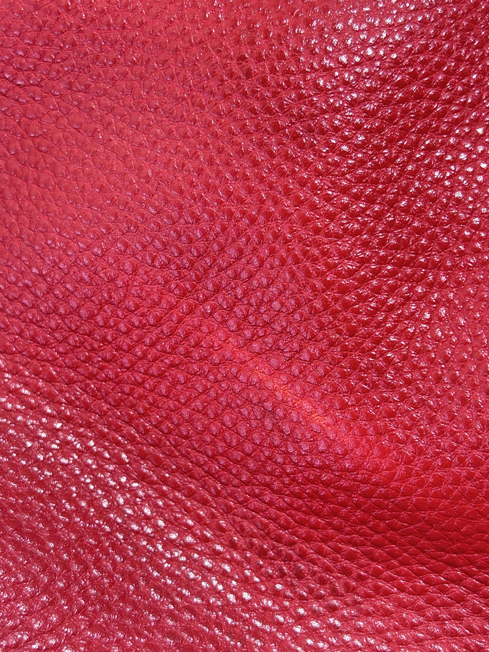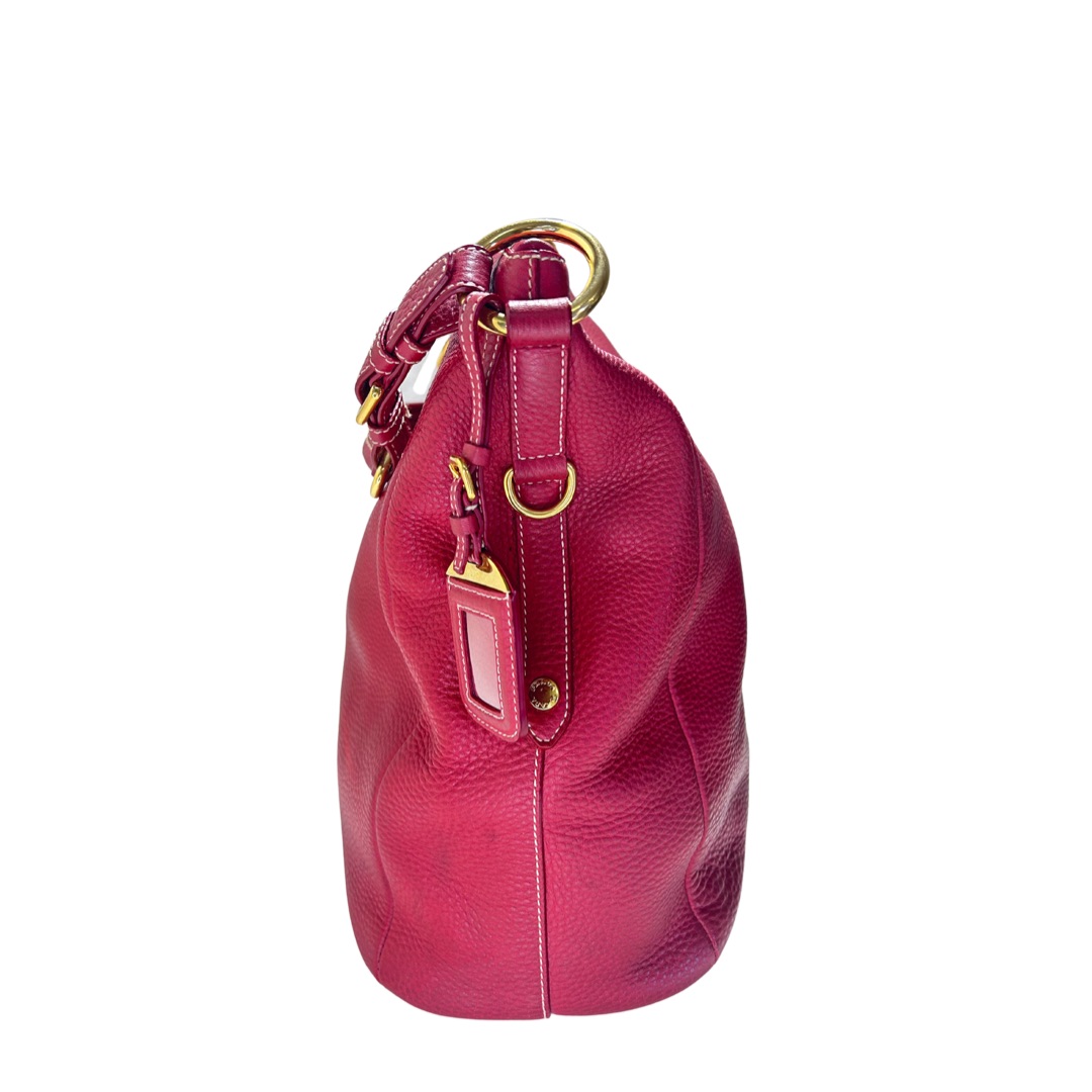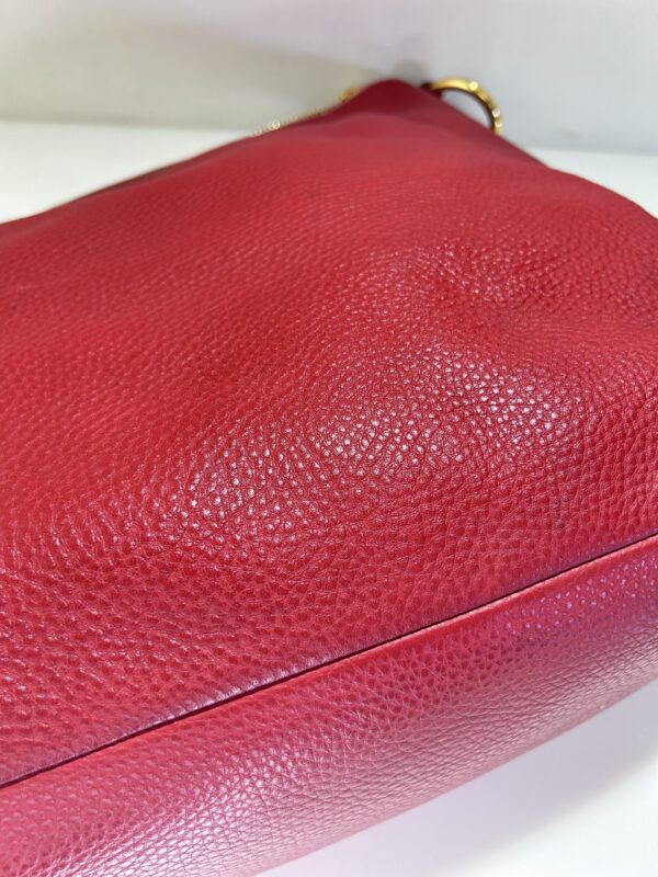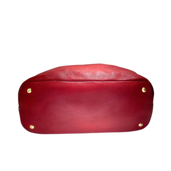 Bolso modelo Hobo en cuero vacuno color rojo cherry. Con asa media en cuero rojo para llevarla al hombro. Logo central en metal dorado. Con cierre. Forro interno en tejido beige. Con bolsillo con cierre interno. Interior amplio. Tamaño grande. Base ovalada con apoyadores de metal dorado.