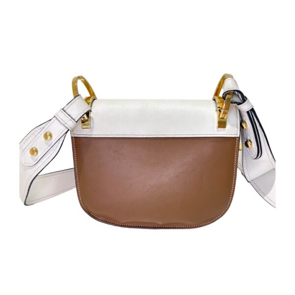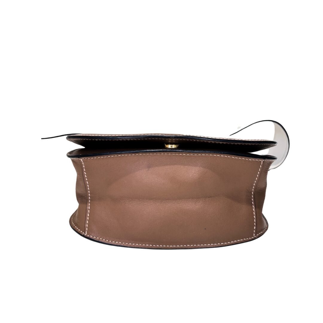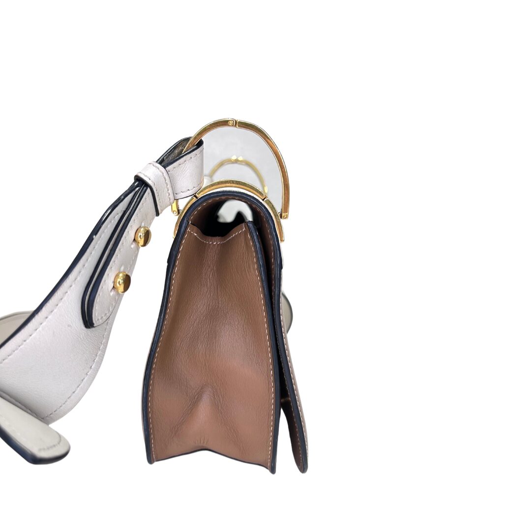 Bolso pequeño en cuero color Camelot y blanco crema modelo crossbody. Logo en solapa frontal en metal dorado. Strap largo y ancho en cuero color blanco crema, con largor regulable. Sin cierre exterior, con botón imantado en solapa frontal como sistema de cierre. Interior espacioso. Herrajes en metal dorado. Interior revestido en cuero color Camel.