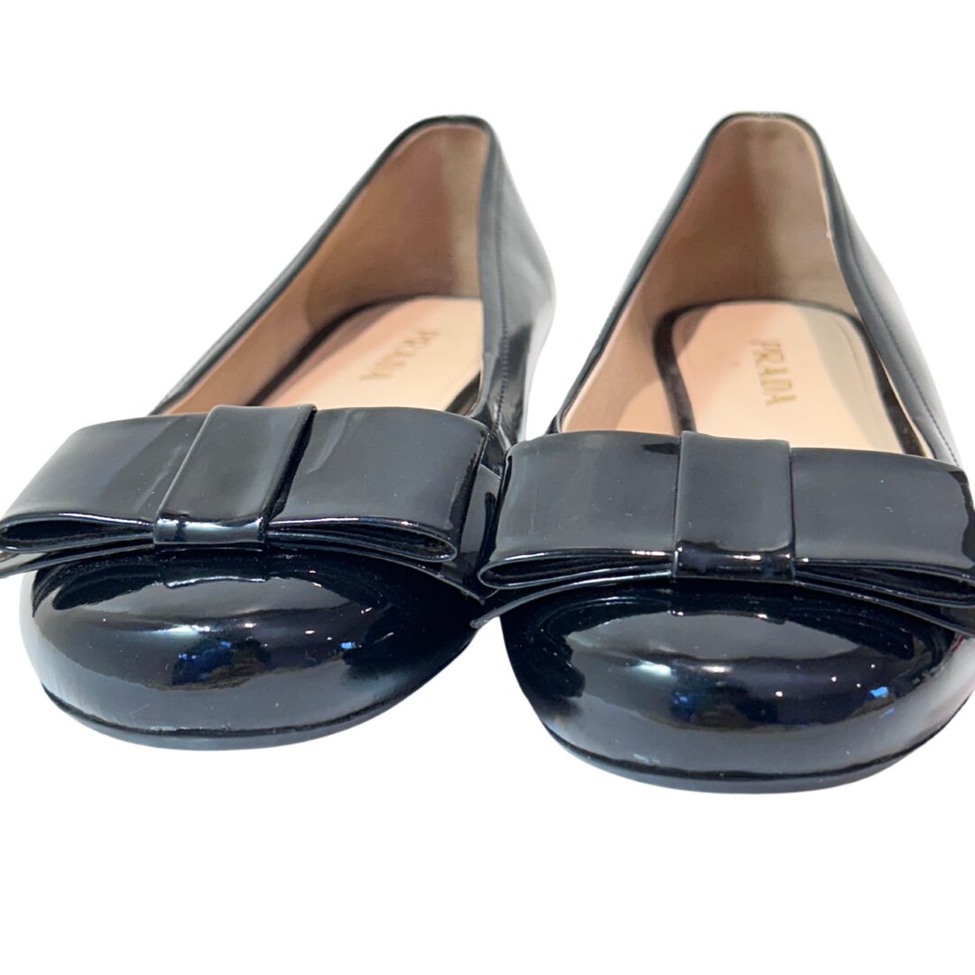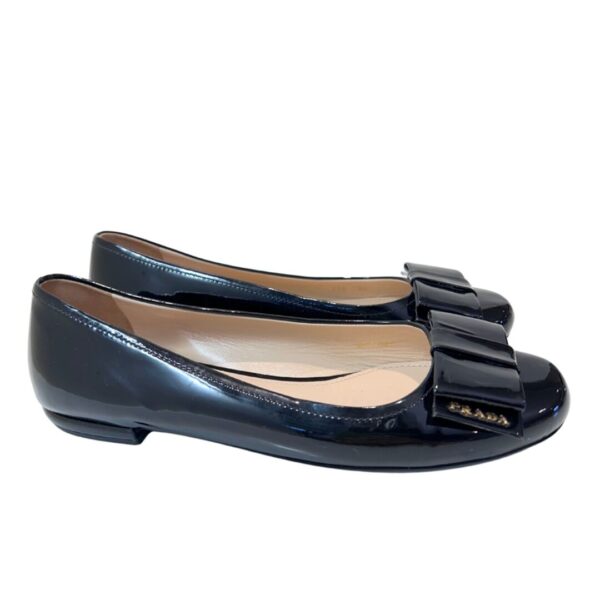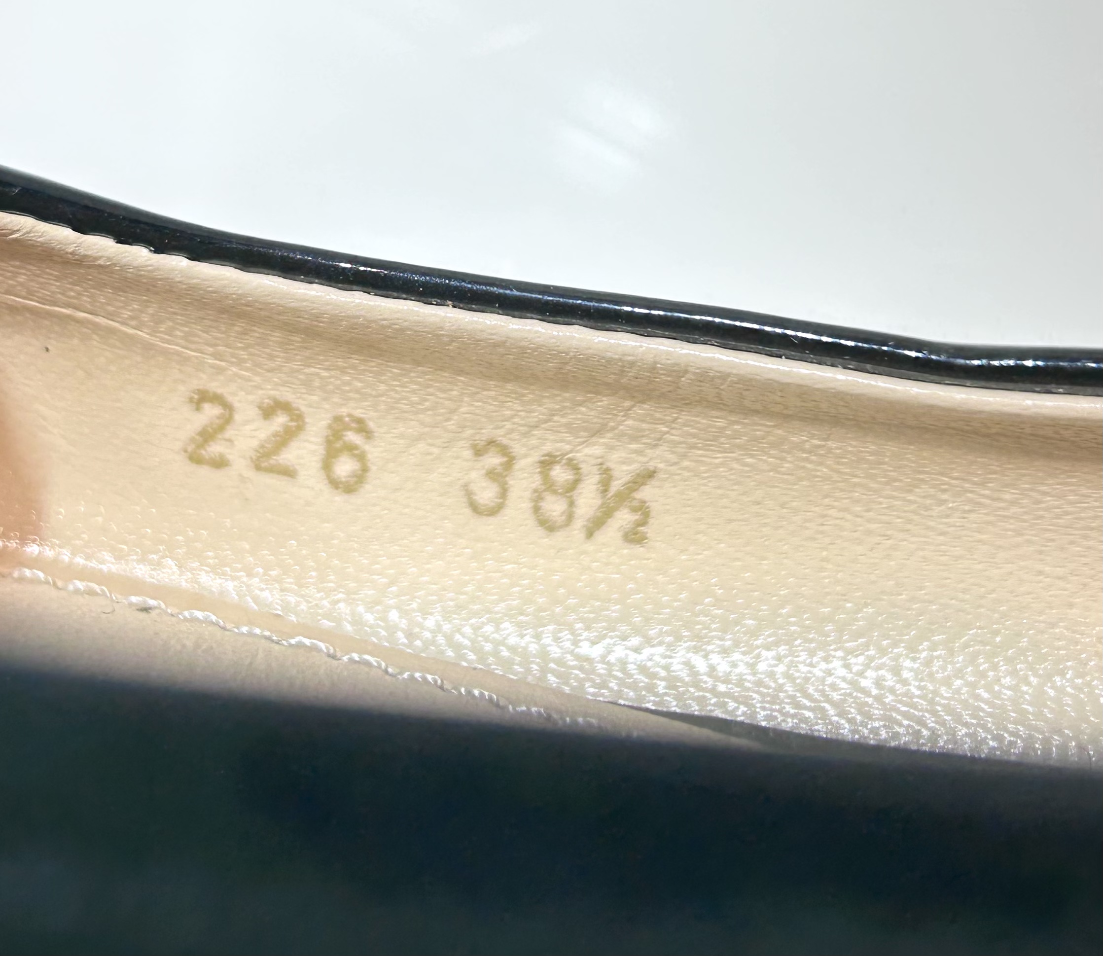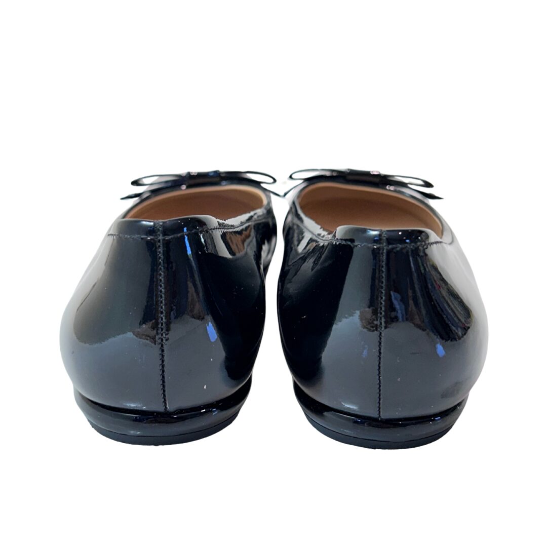 Chatitas bajas en cuero charolado color negro con moño en la punta. Logo en metal dorado situado a los costados de cada moño. Interior de cuero color nude. Suela de goma negra. Talle 38 1/2.