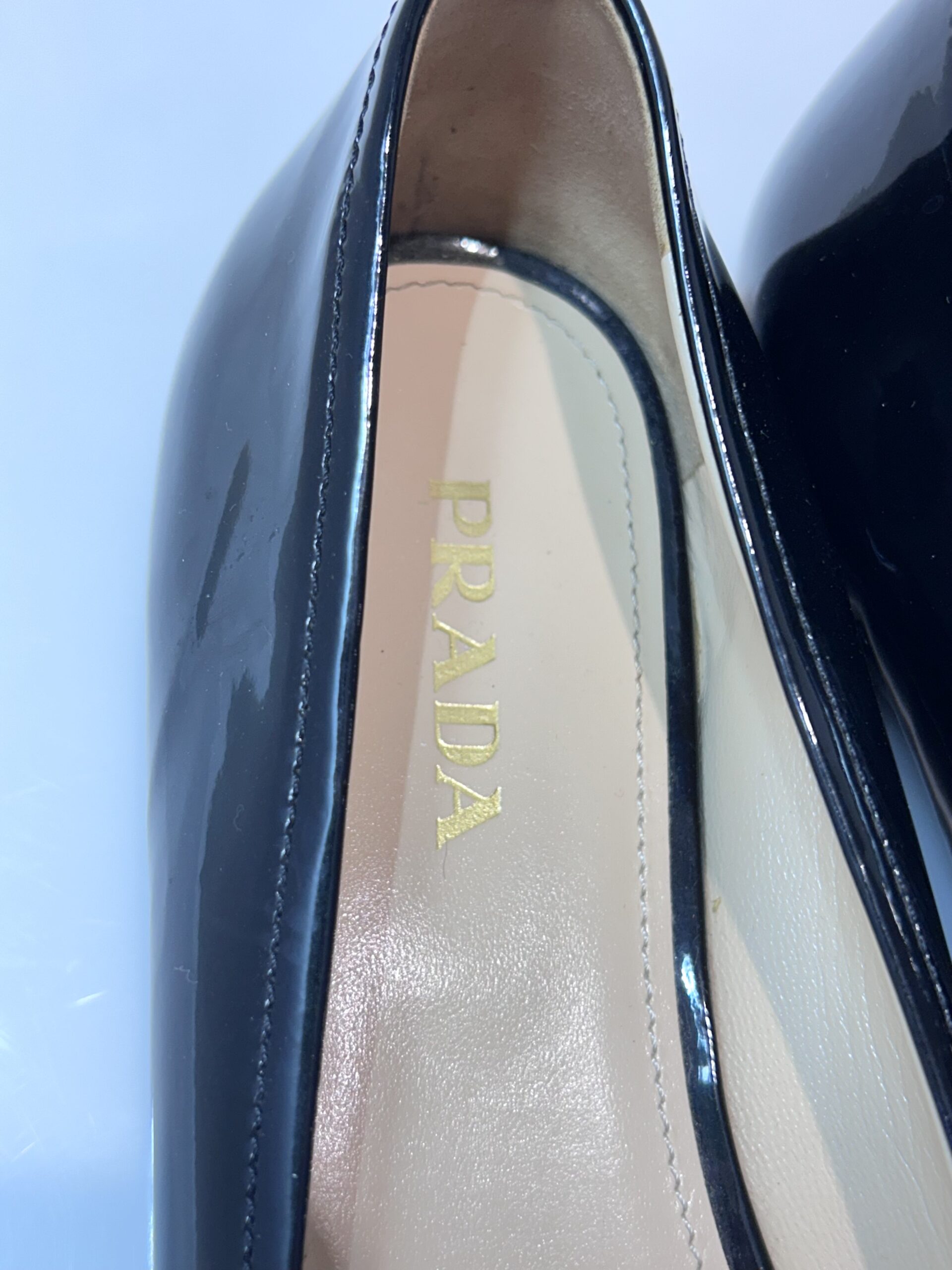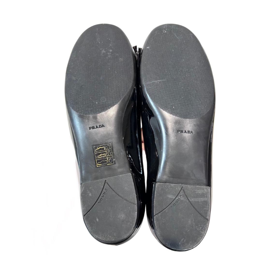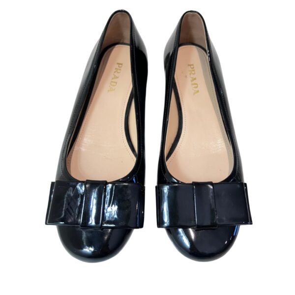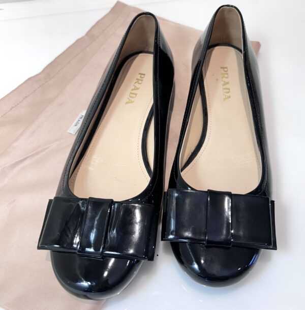 Chatitas bajas en cuero charolado color negro con moño en la punta. Logo en metal dorado situado a los costados de cada moño. Interior de cuero color nude. Suela de goma negra. Talle 38 1/2.