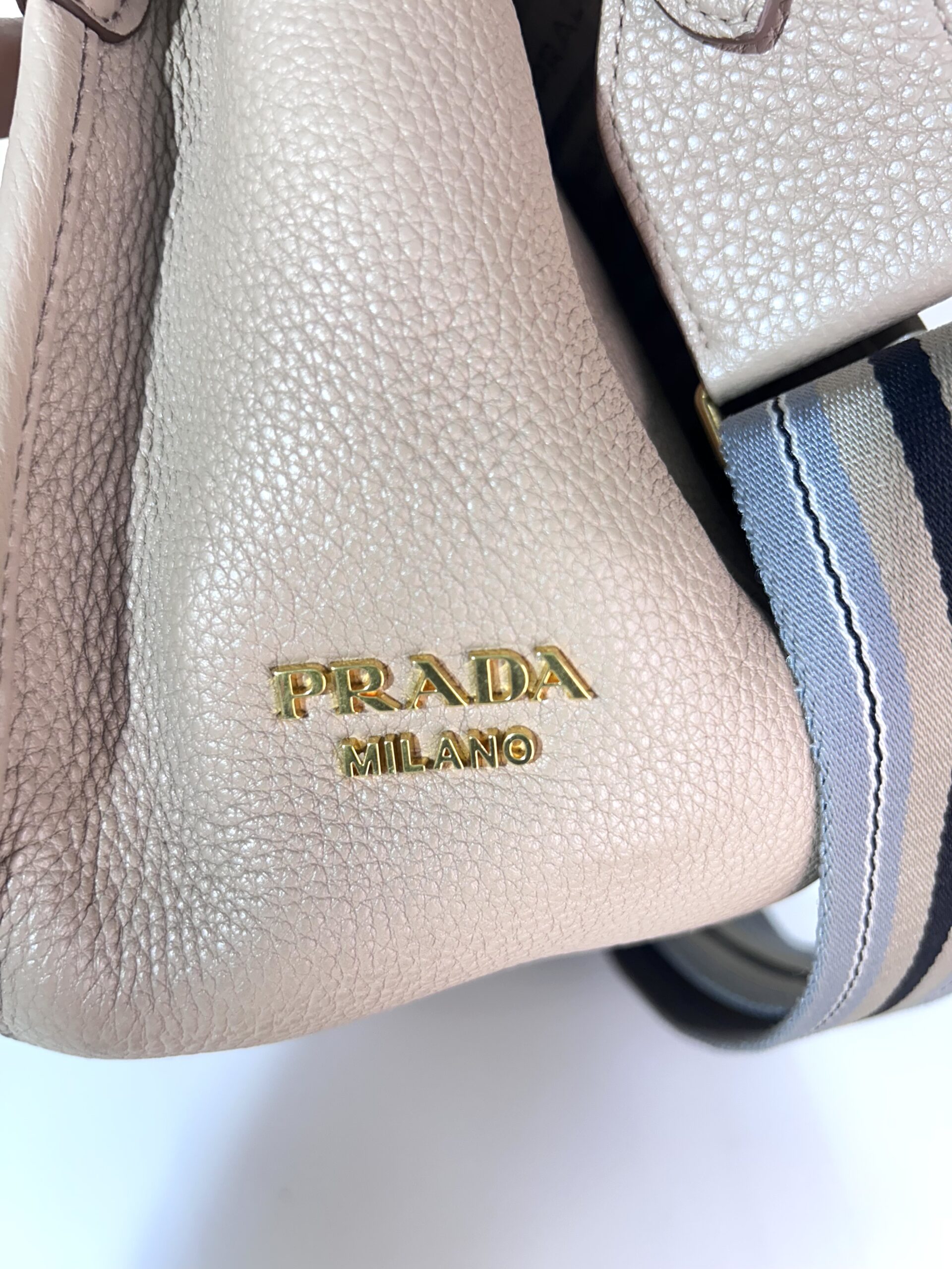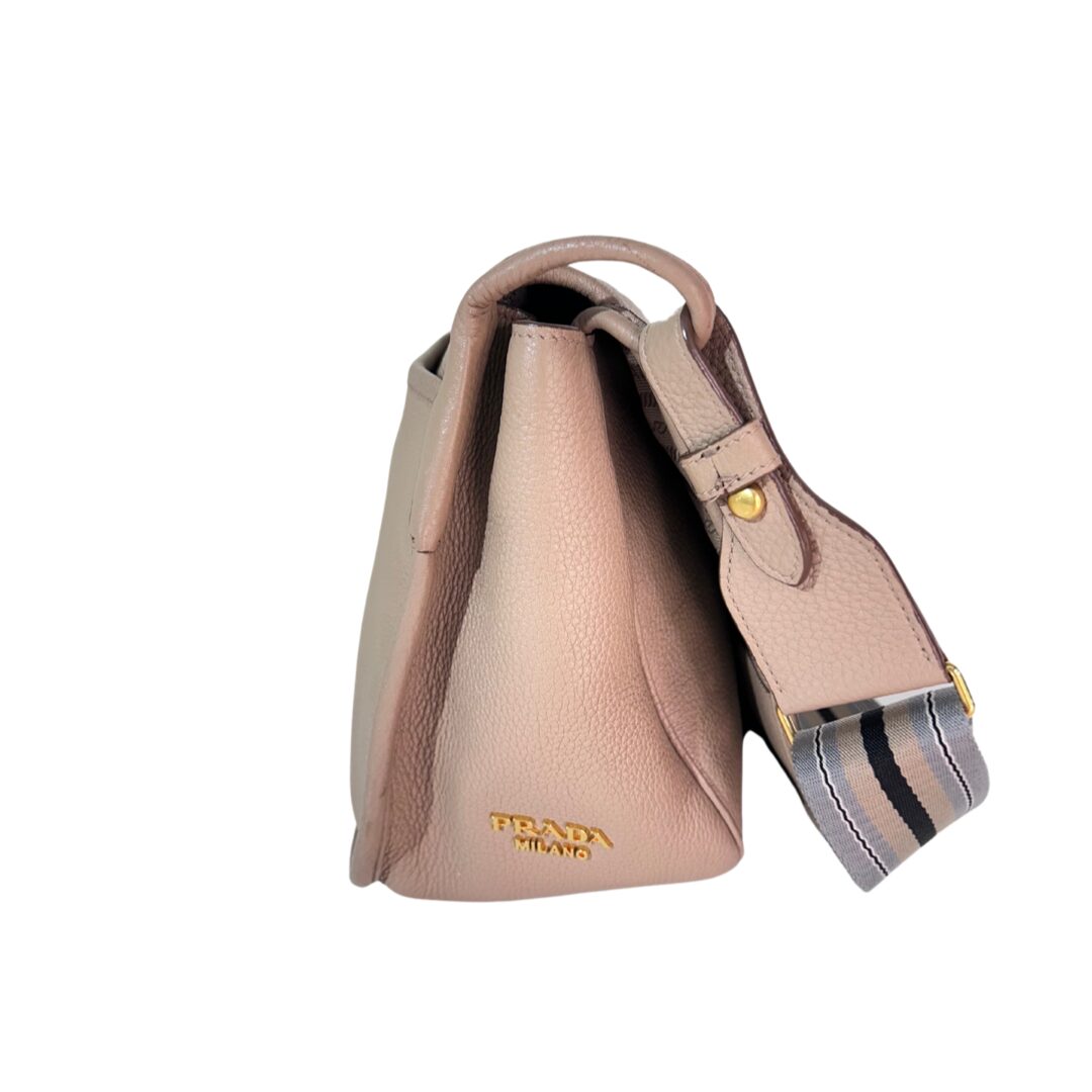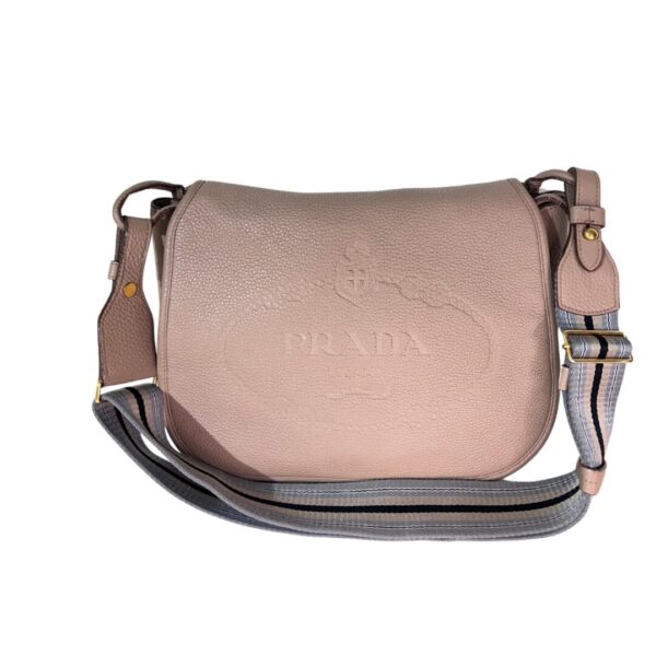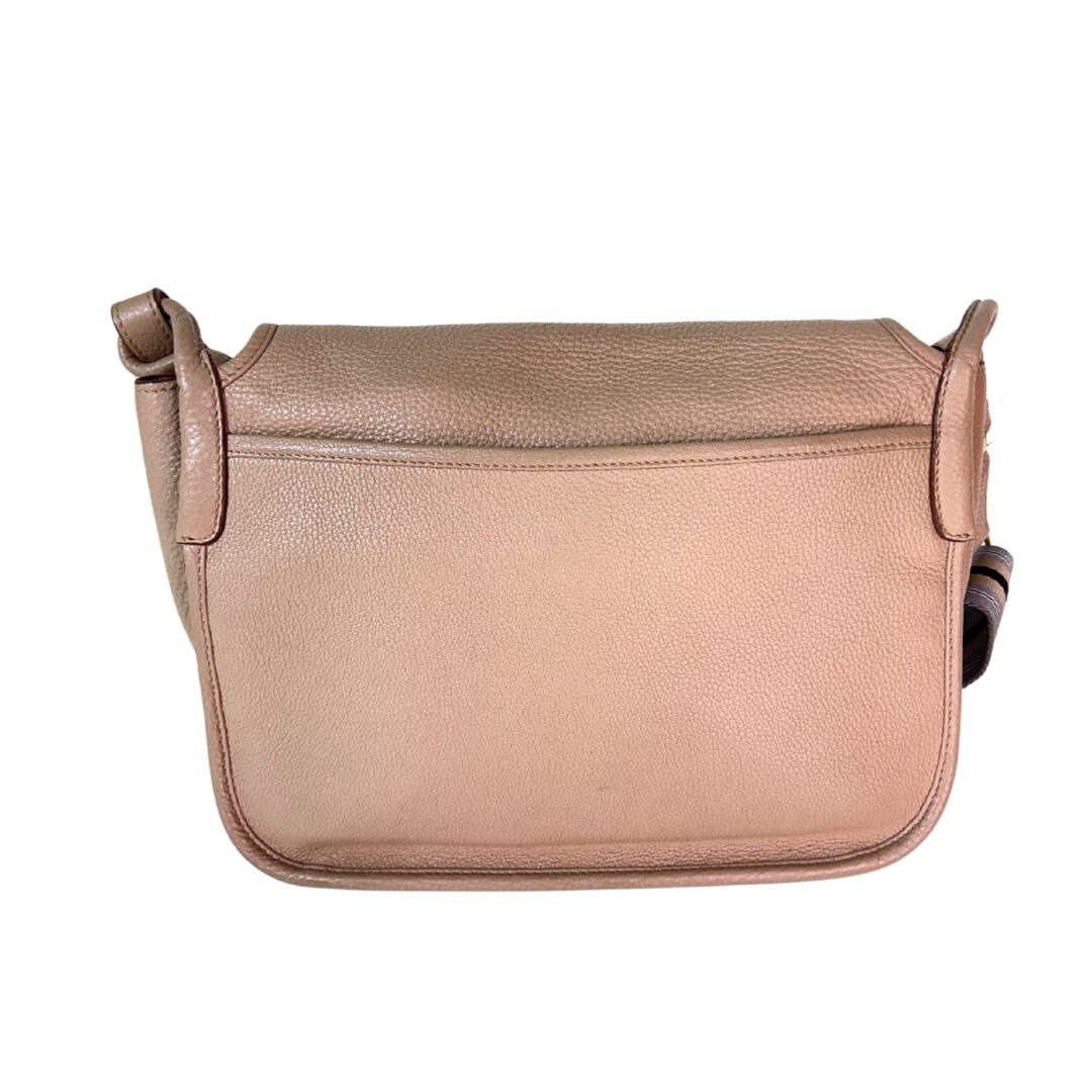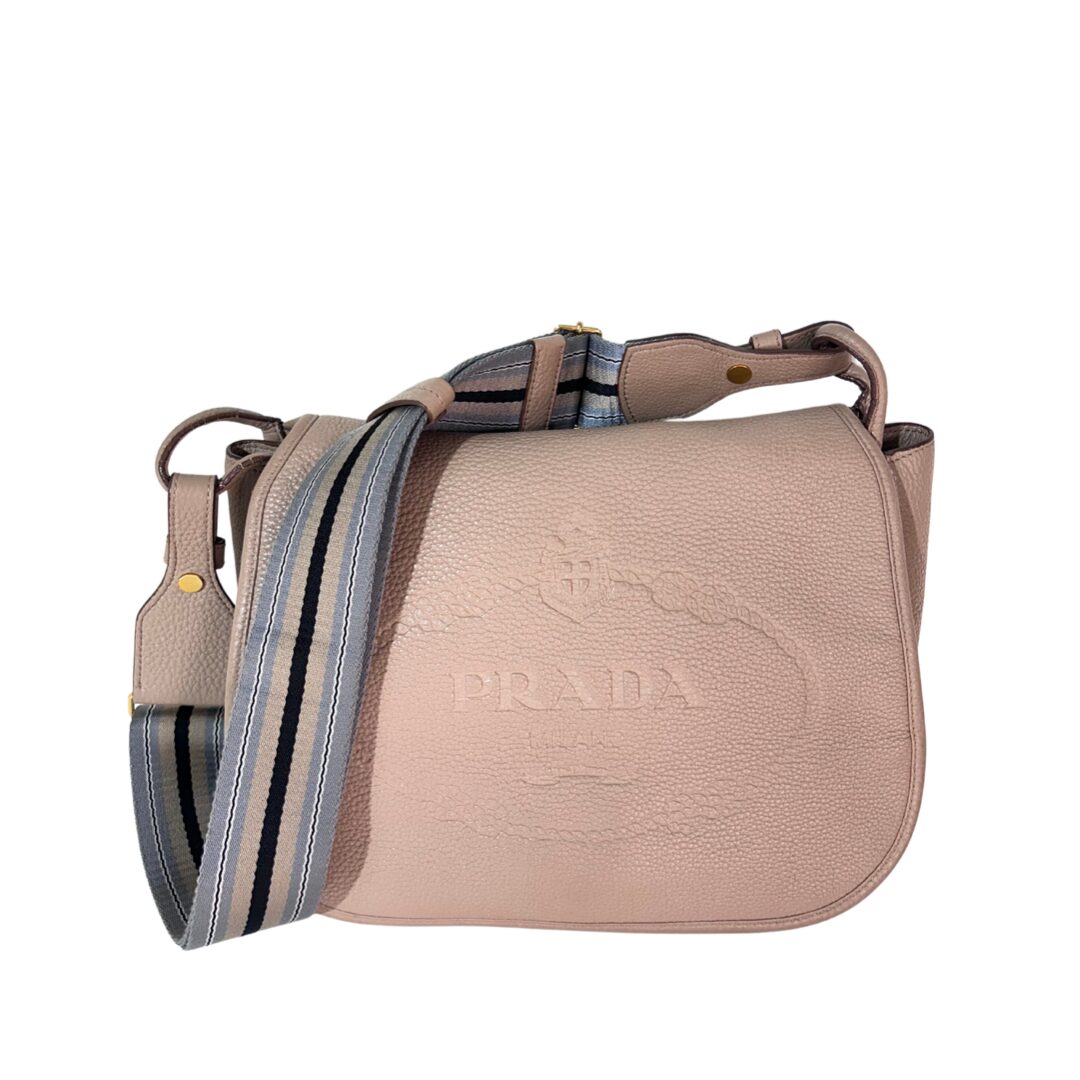 Bolso de cuero en relieve color nude. Logo grabado en centro del bolso. Con solapa frontal que contiene prendedor en metal dorado como sistema de cierre. Sin cierre externo. Con bolsillo con cierre en forro interno. Interior en tejido monogram color marrón. Strap grueso de nylon en tonos celeste, marrón y negro. Se puede remover el Strap y regular el largor. Para usarla cruzada o al hombro. Tamaño mediano.