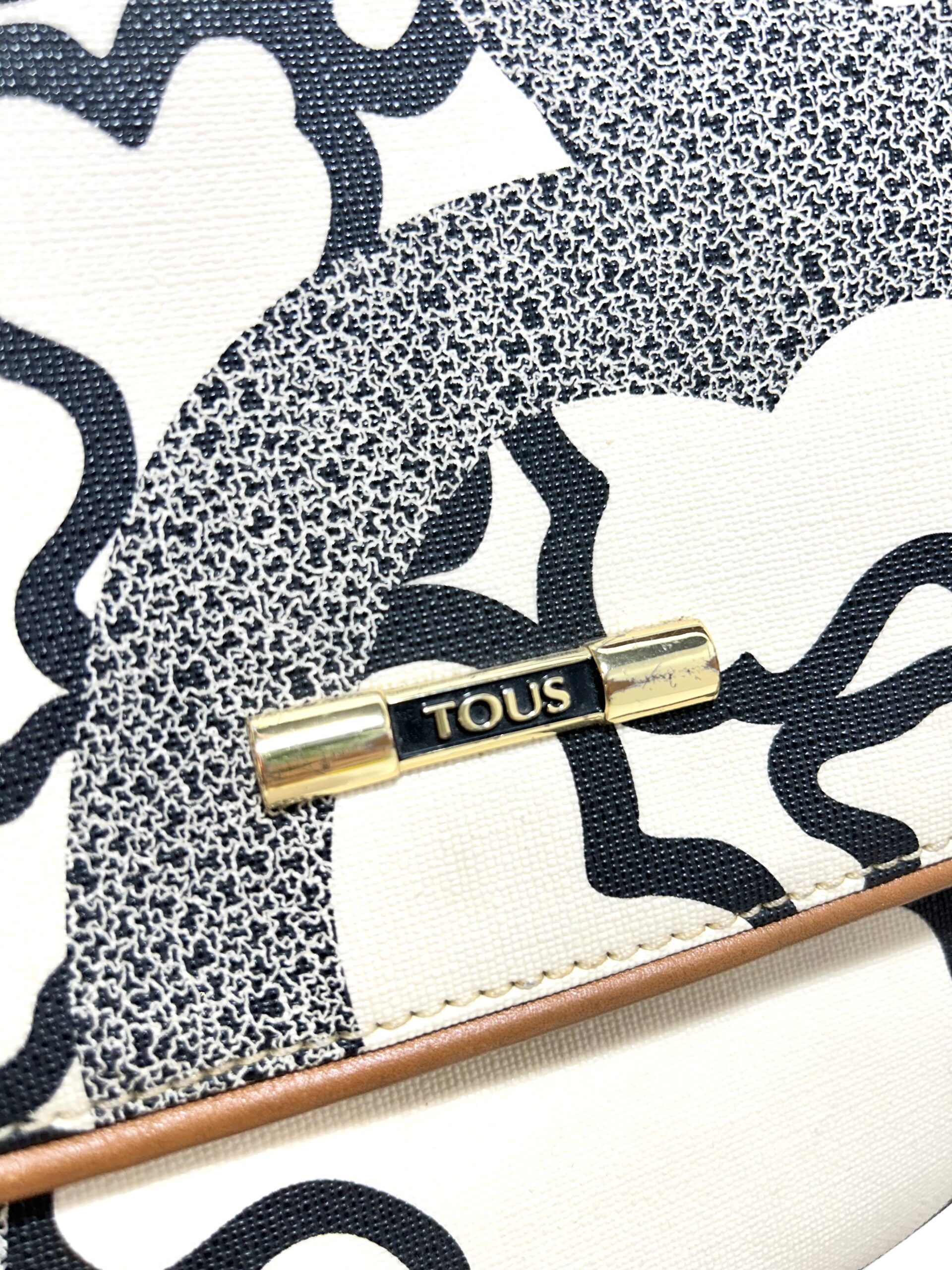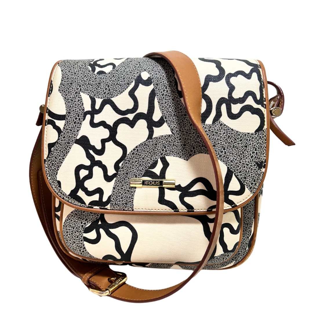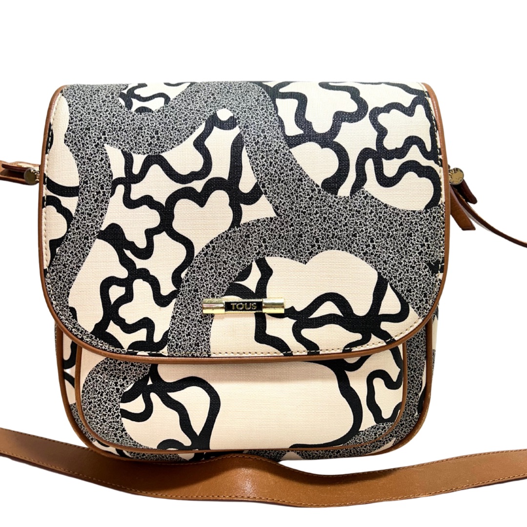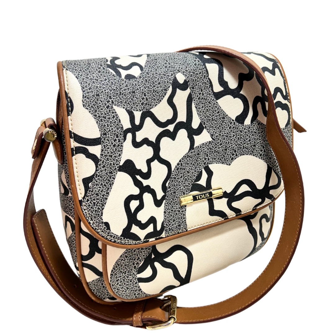 Bandolera de cuero monogram beige con estampado de ositos en color negro. Solapa delantera con prendedor. Bolsillo frontal grande. Logo en placa de metal dorado. Interior con bolsillo con cierre y compartimientos. Correa regulable de cuero color Camel para usarla cruzada o al hombro.