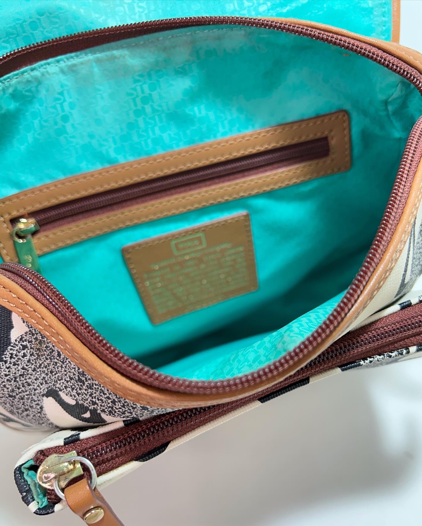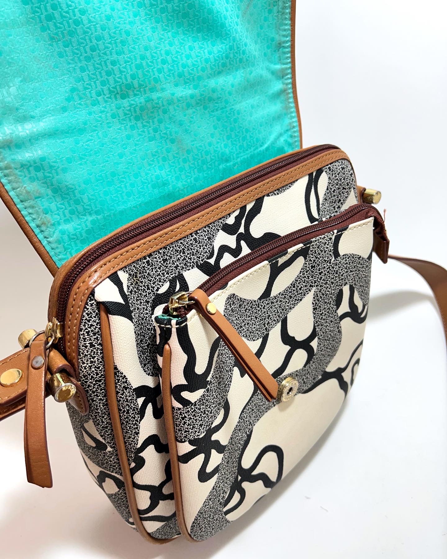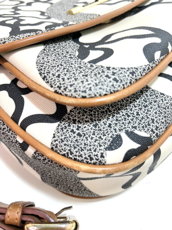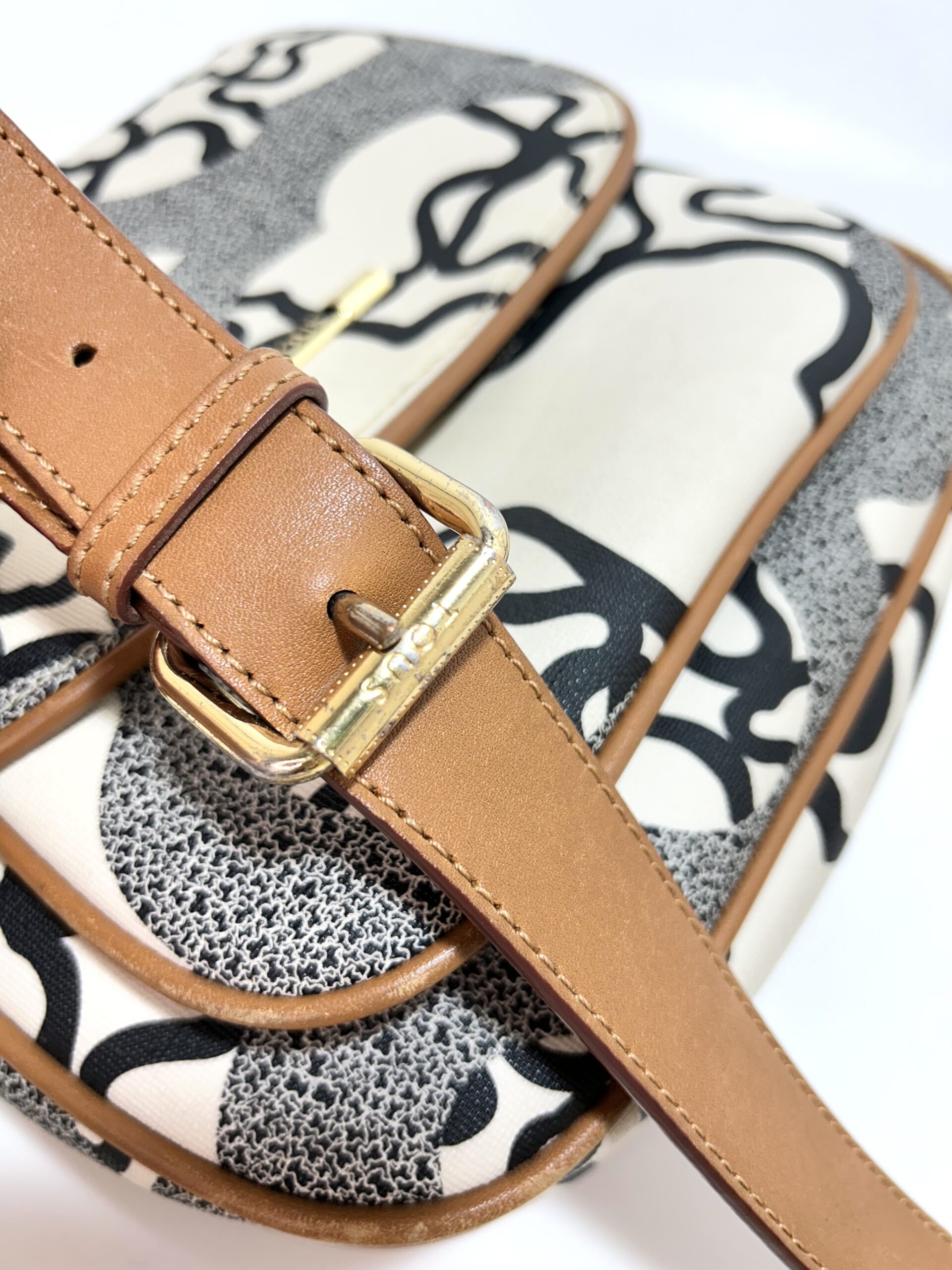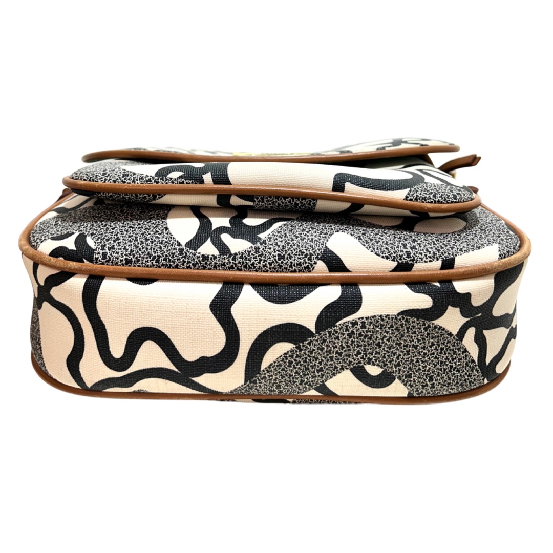 Bandolera de cuero monogram beige con estampado de ositos en color negro. Solapa delantera con prendedor. Bolsillo frontal grande. Logo en placa de metal dorado. Interior con bolsillo con cierre y compartimientos. Correa regulable de cuero color Camel para usarla cruzada o al hombro.