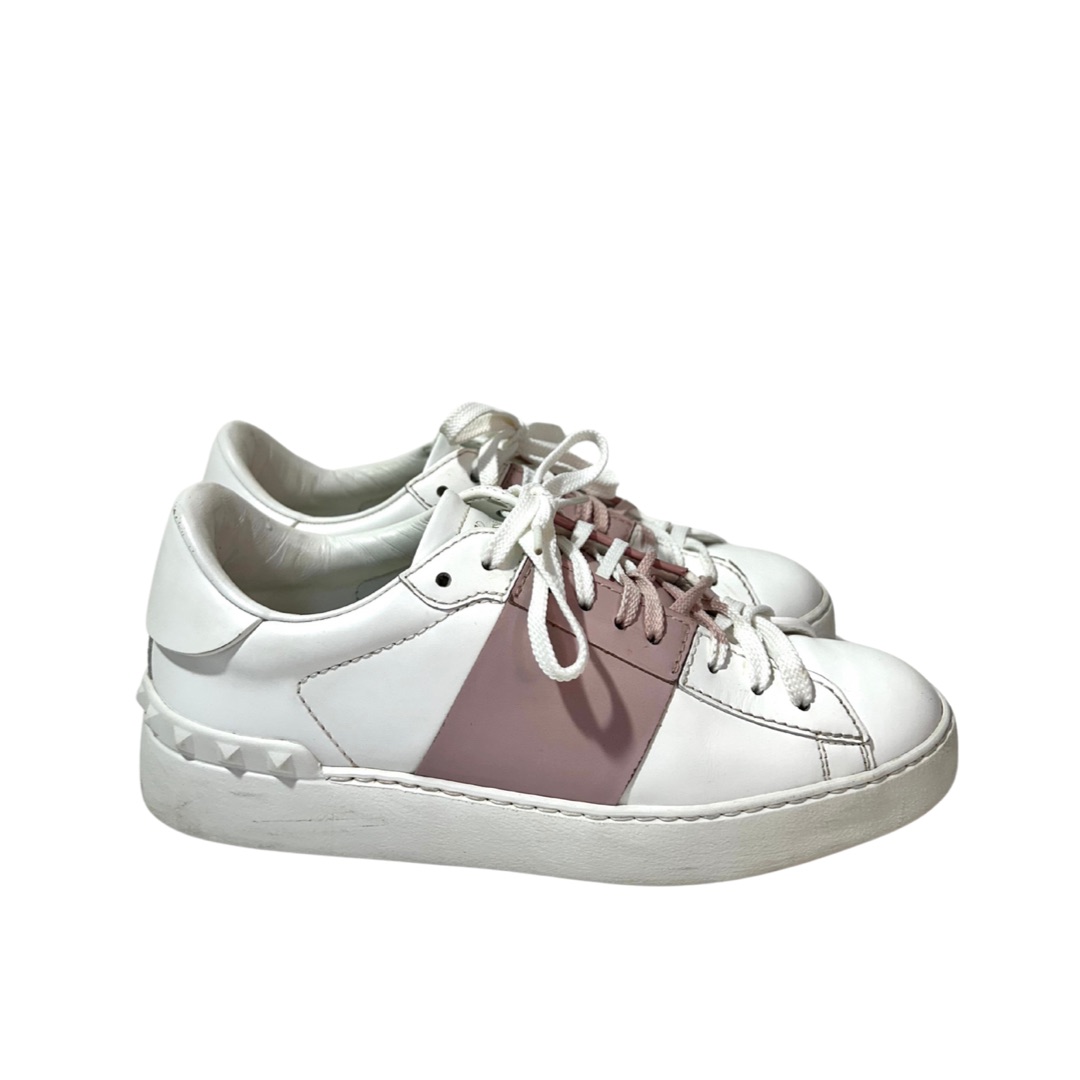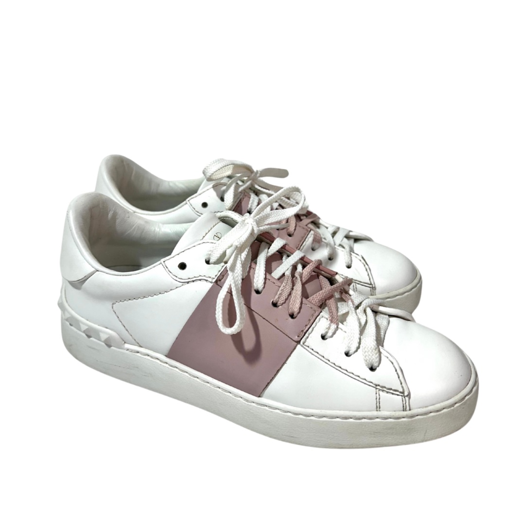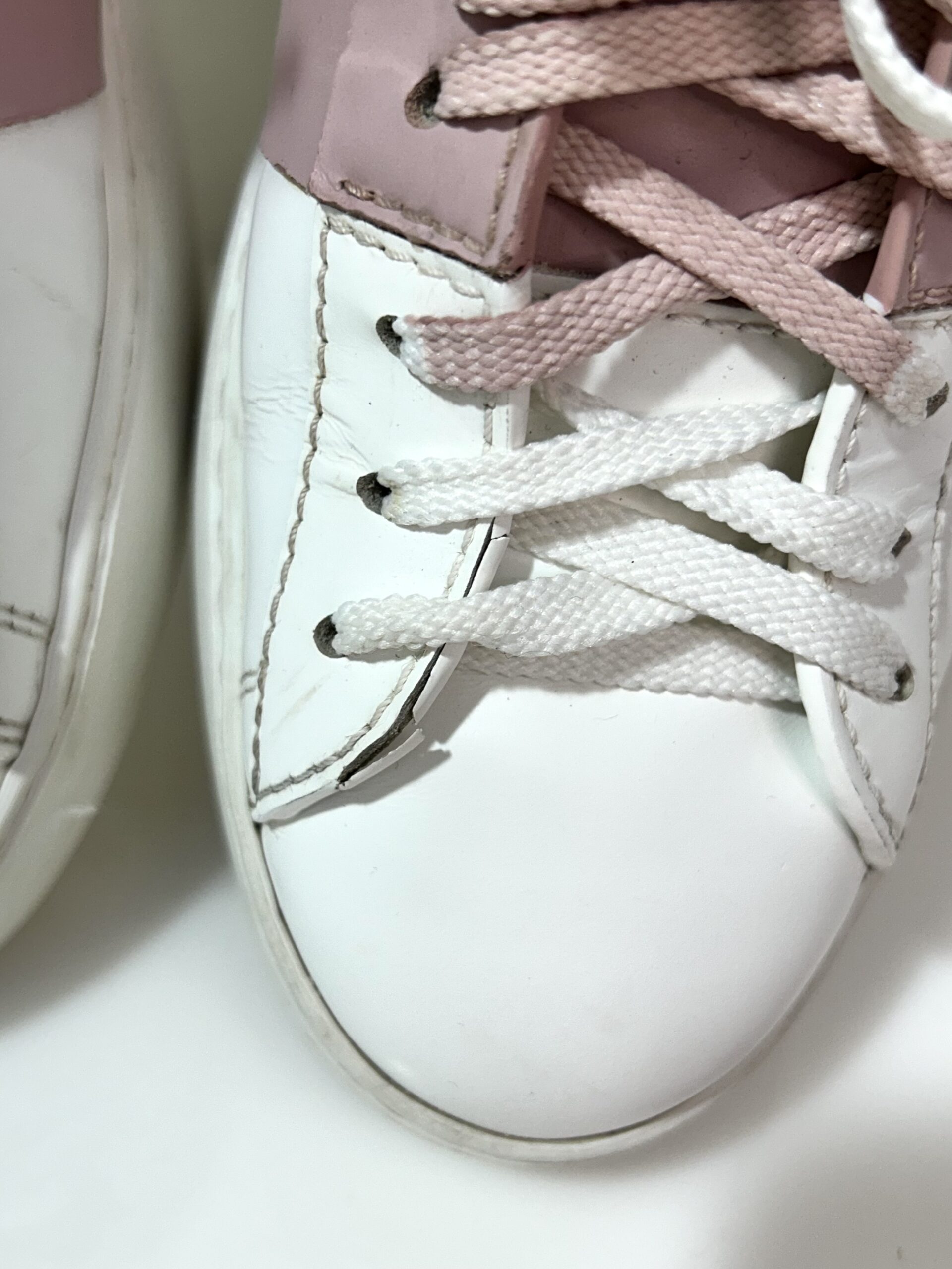 Sneakers en cuero blanco con randa en cuero color rosa claro. Cordones blancos con rosa. Suela de goma blanca. Interior de cuero blanco. Talón con tachas de goma. Logo dorado en solapa frontal. Talle 38 1/2.