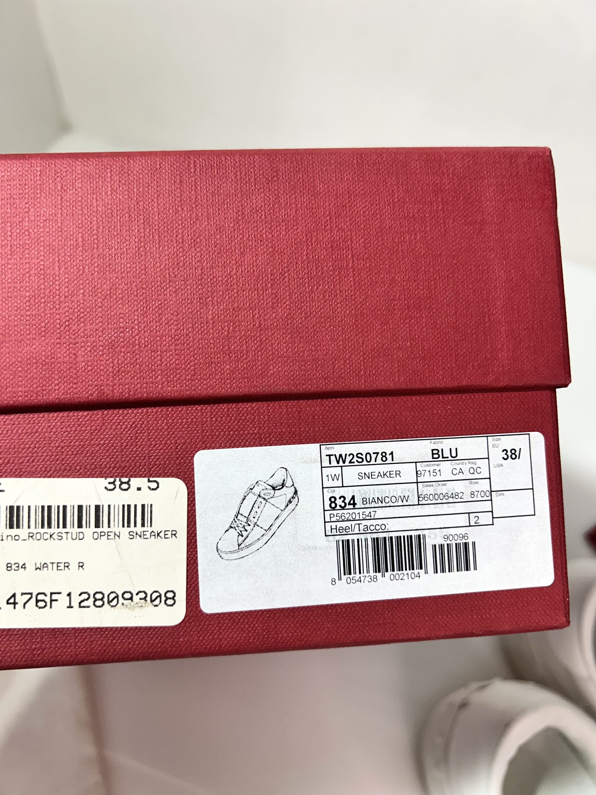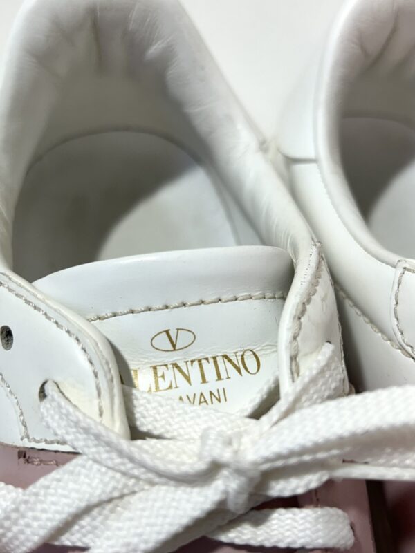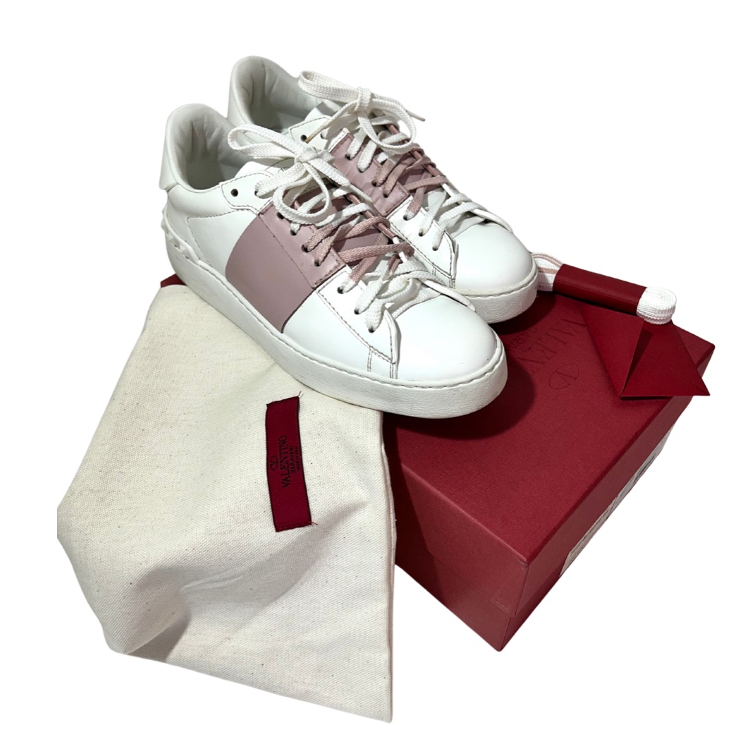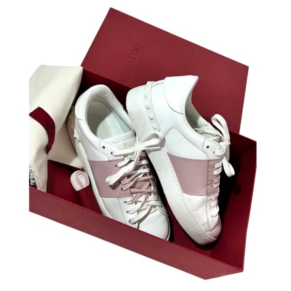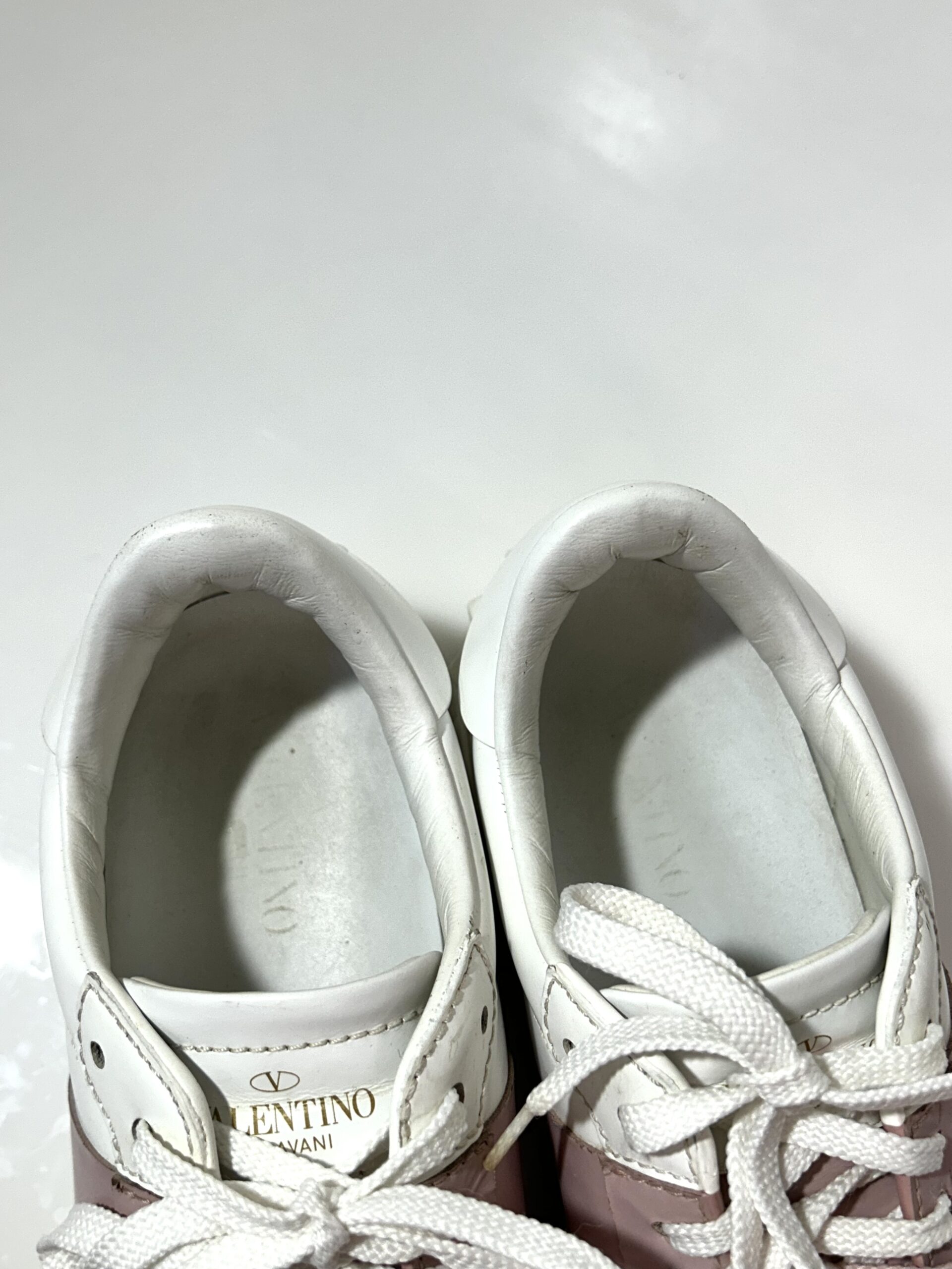Sneakers en cuero blanco con randa en cuero color rosa claro. Cordones blancos con rosa. Suela de goma blanca. Interior de cuero blanco. Talón con tachas de goma. Logo dorado en solapa frontal. Talle 38 1/2.