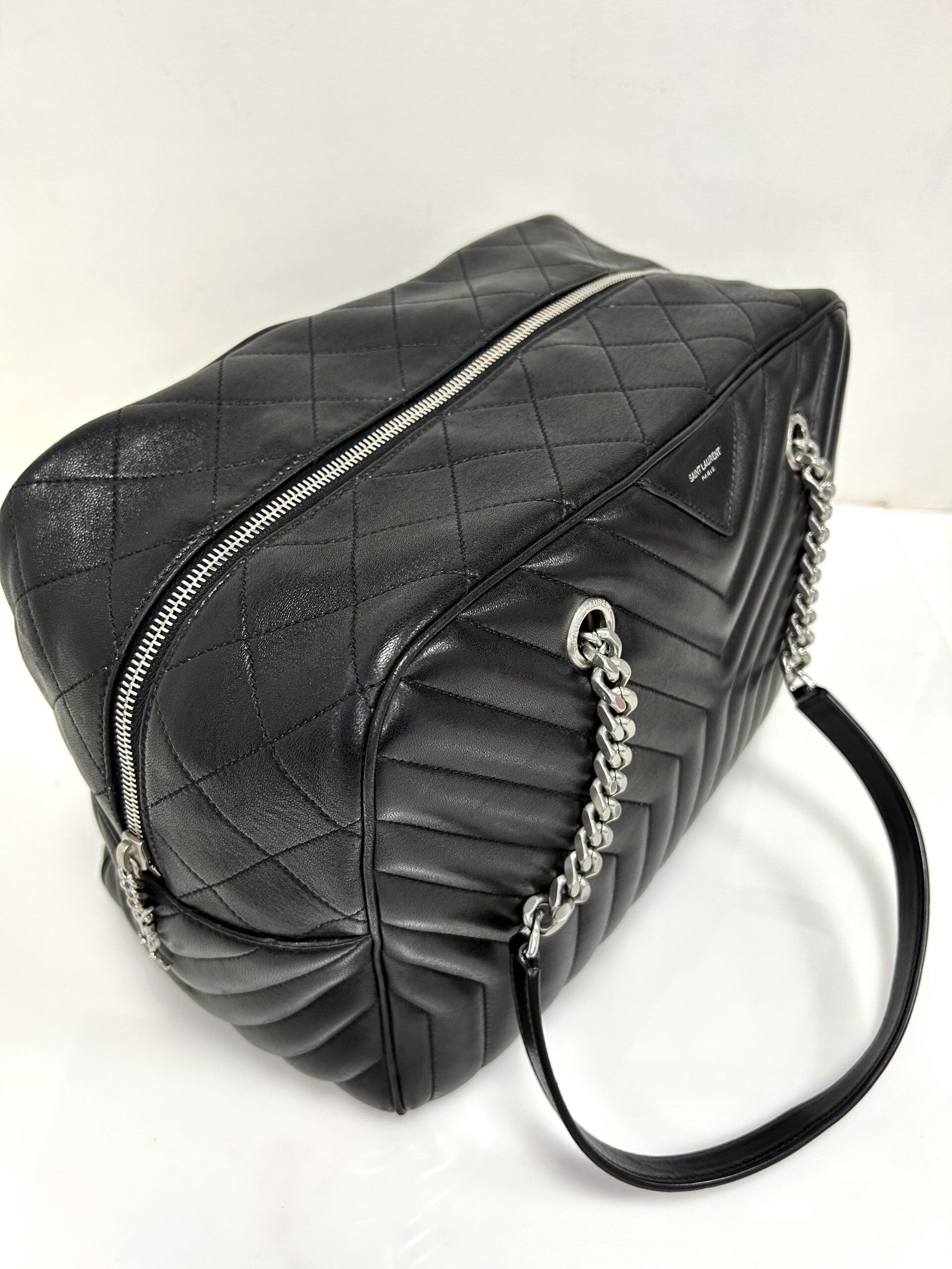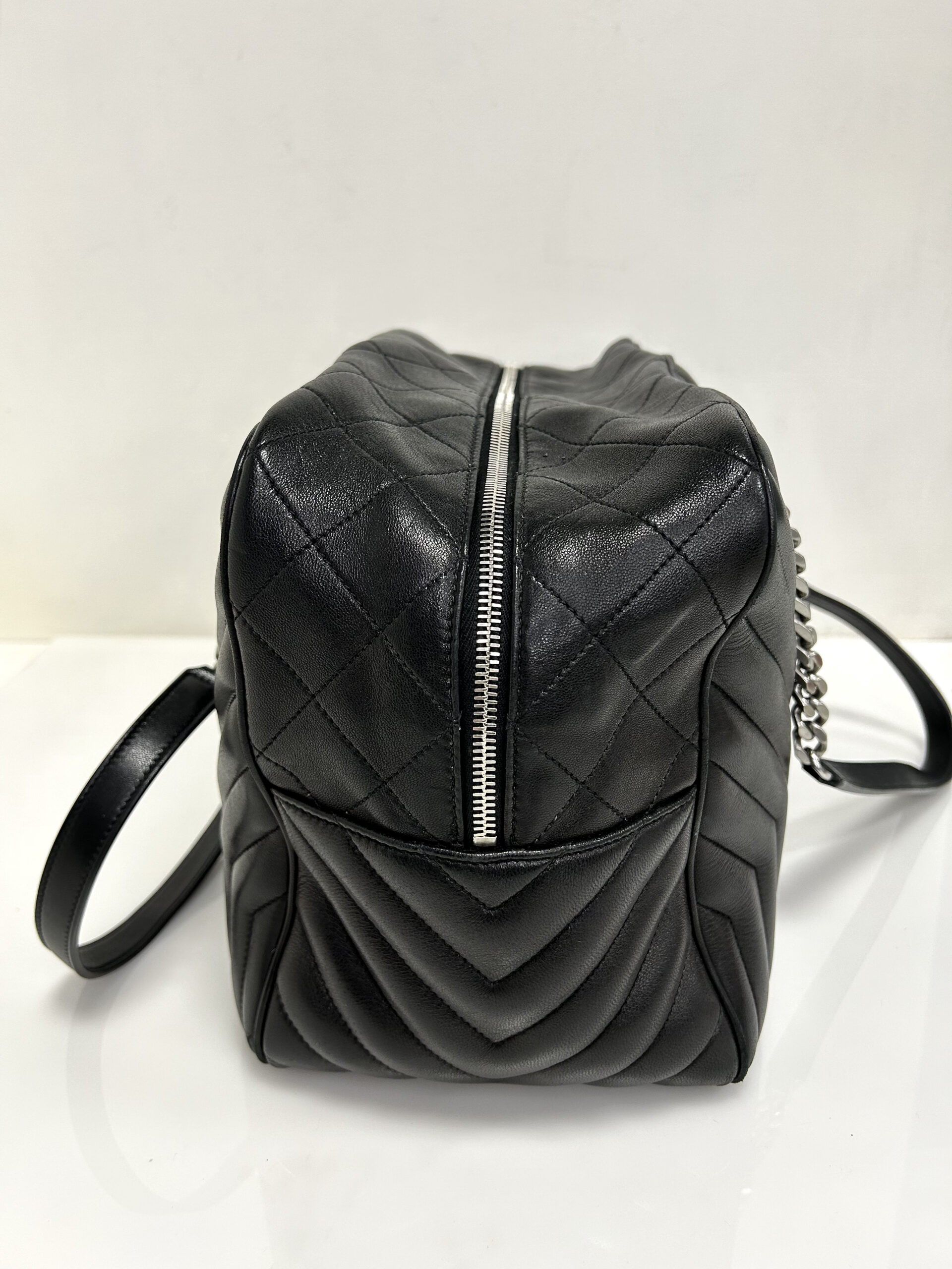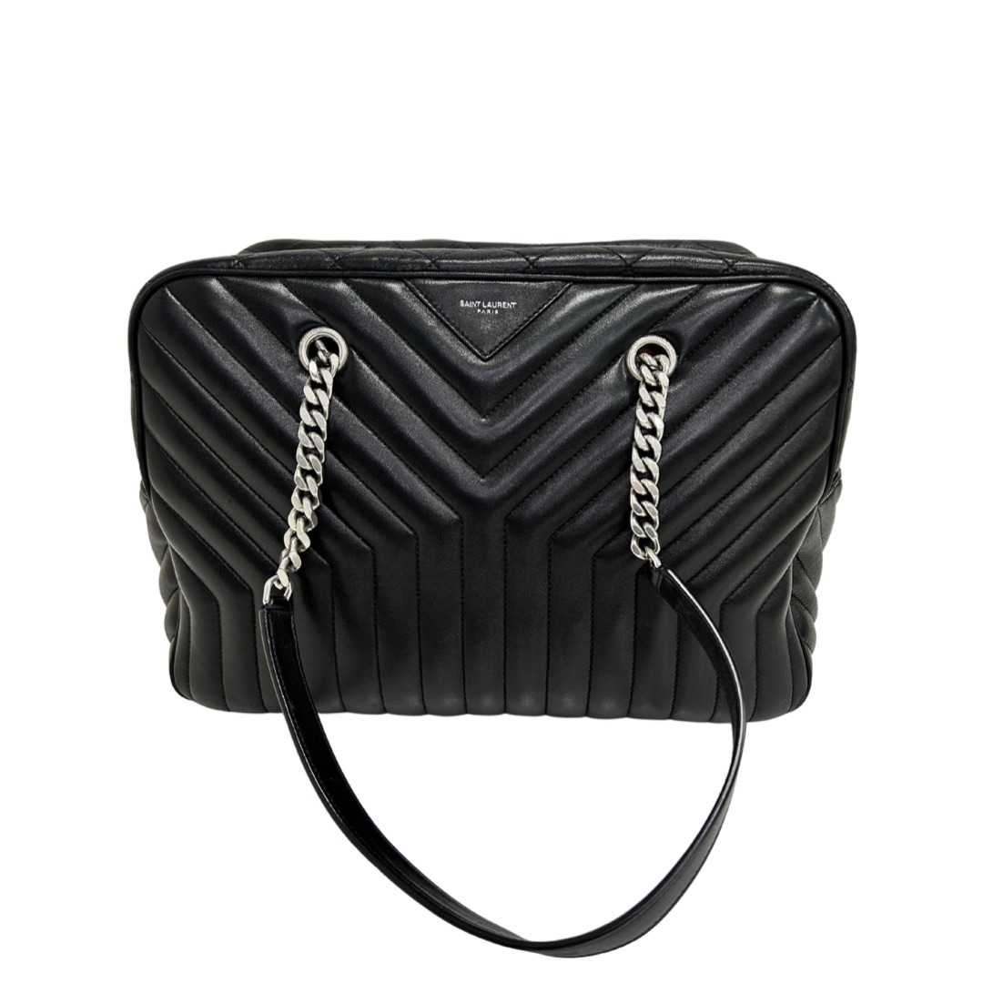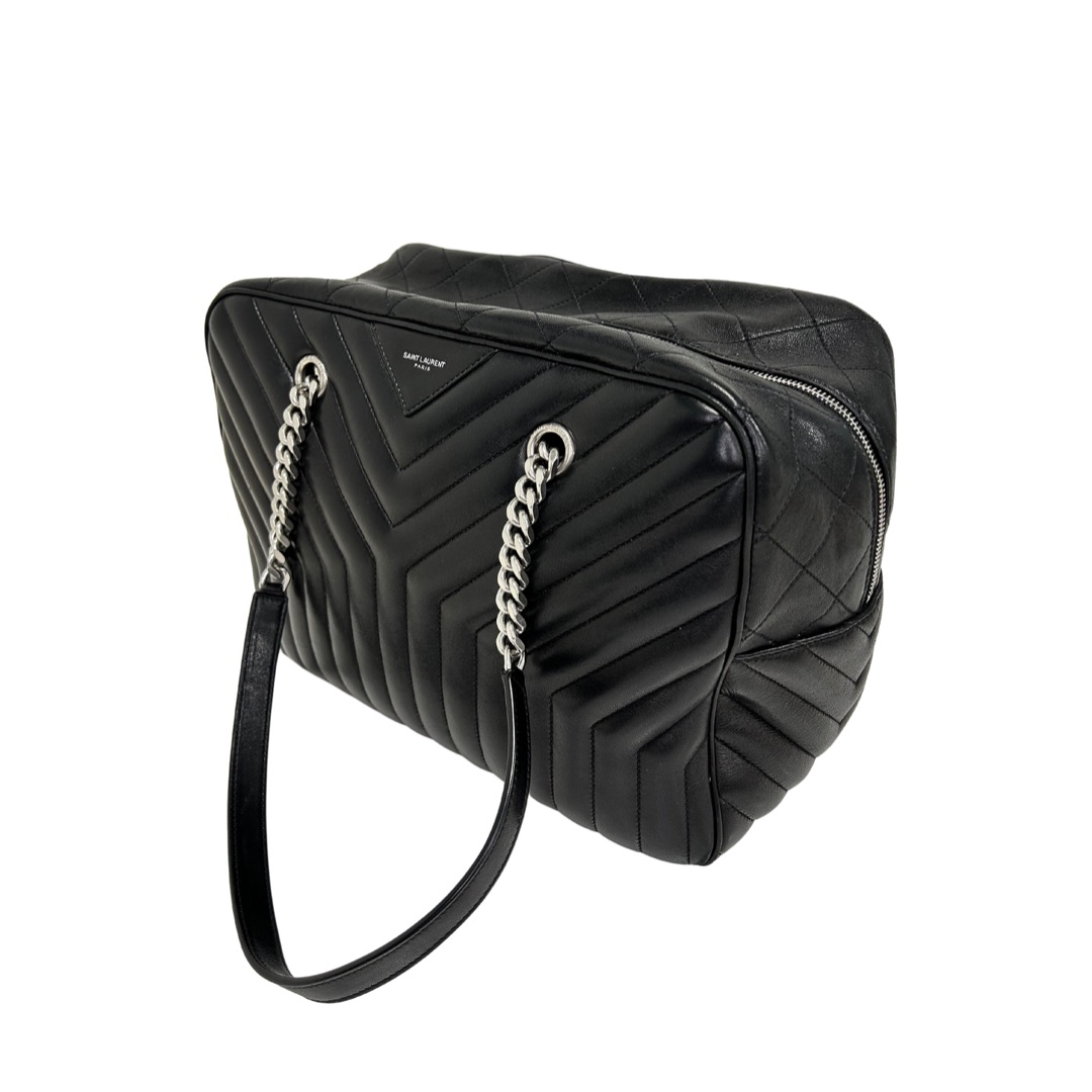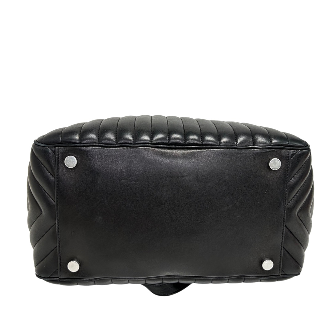 Bolso de hombro en cuero calfskin matelasse acolchado color negro. Con asa en cadena color plata viejo y cuero negro, para llevarla al hombro. Con cierre y colgante con logo. Logo frontal grabado en color plateado.