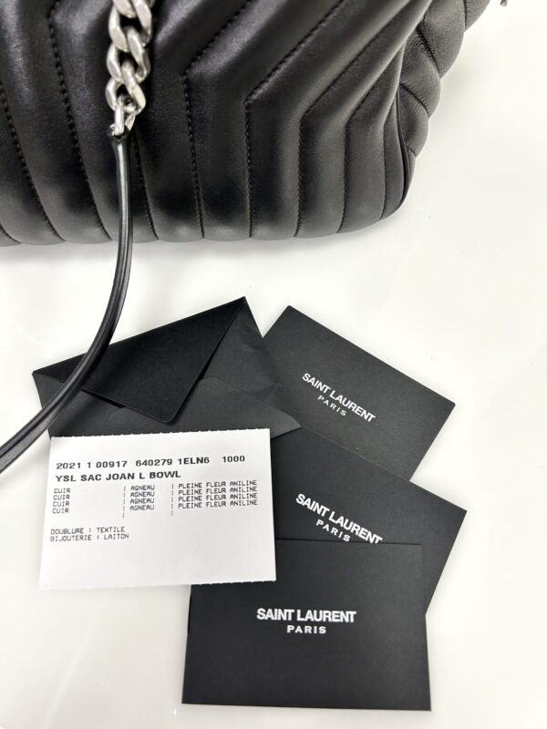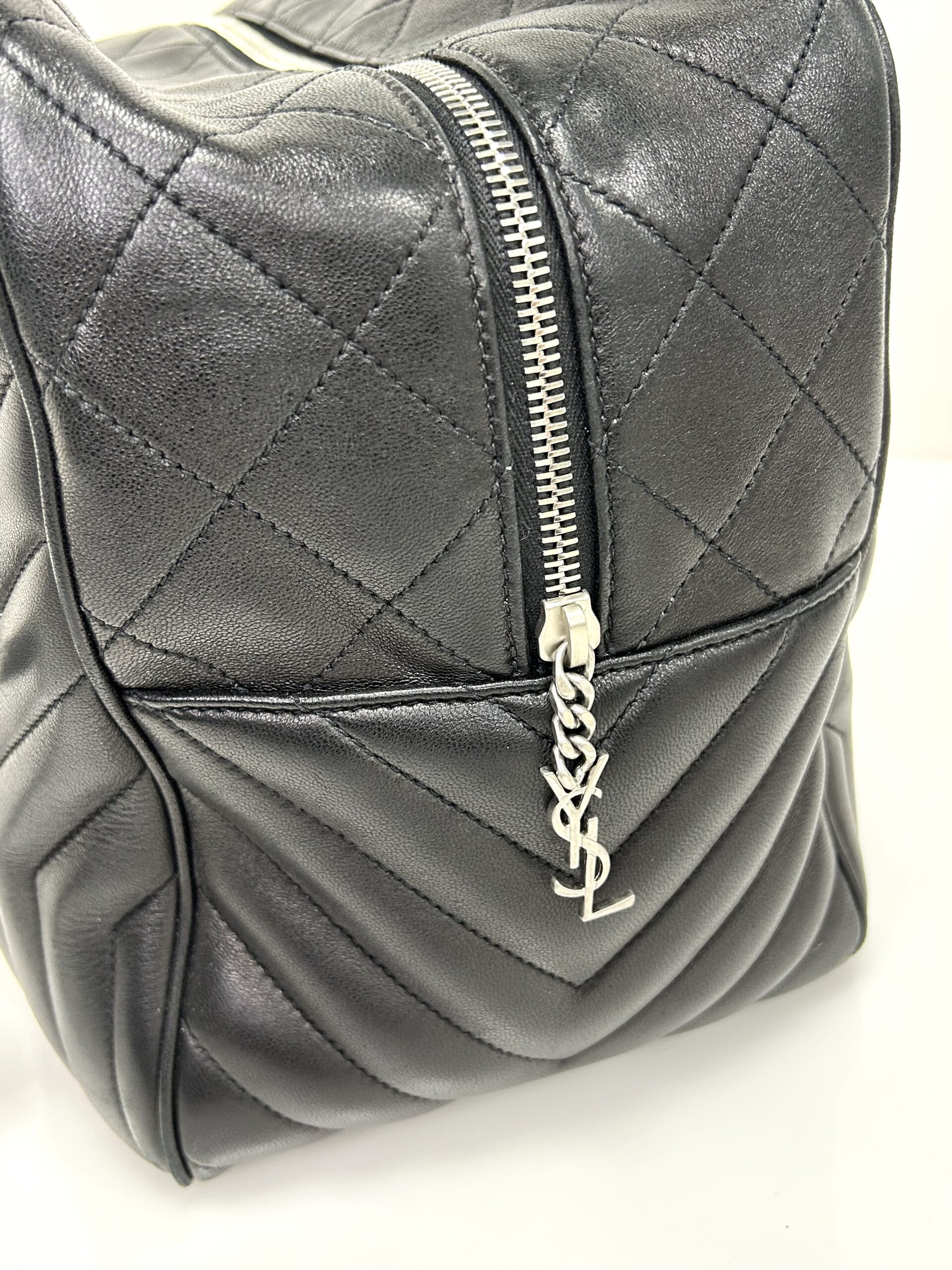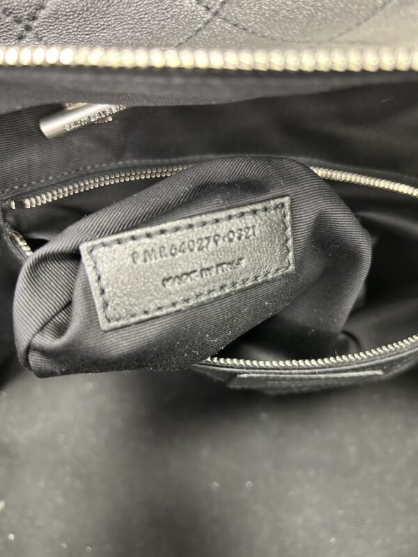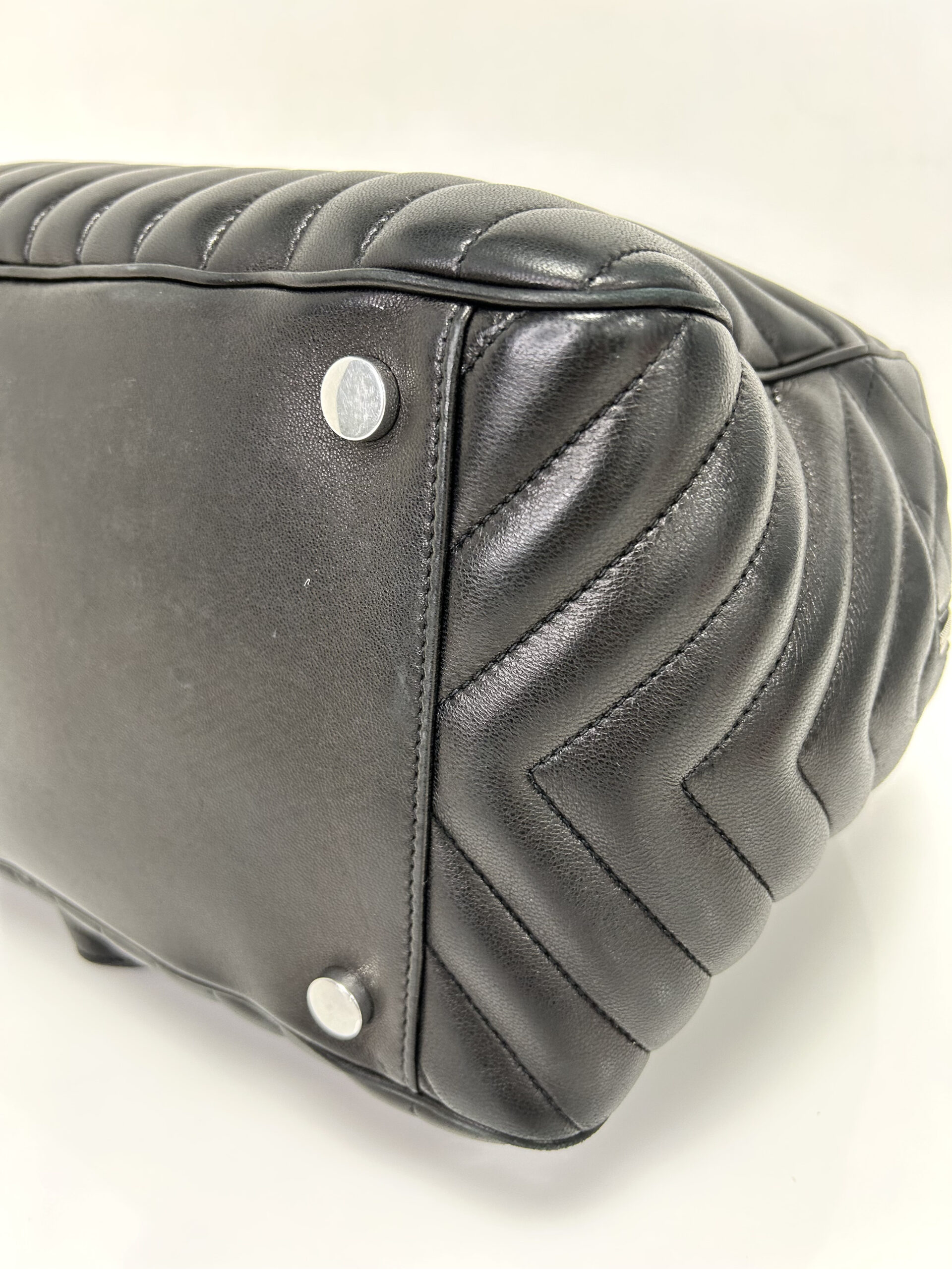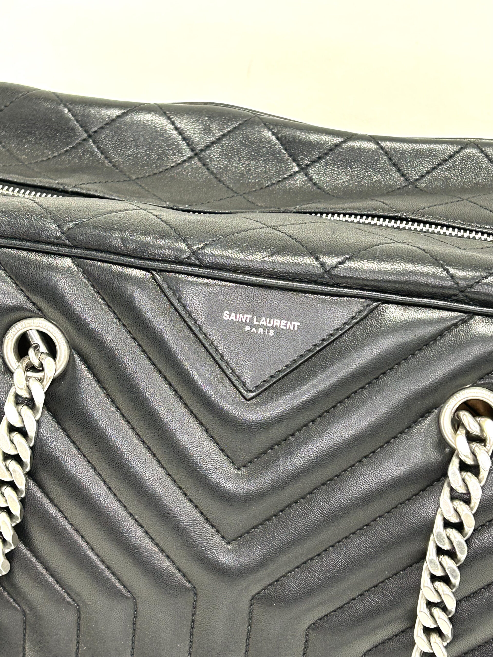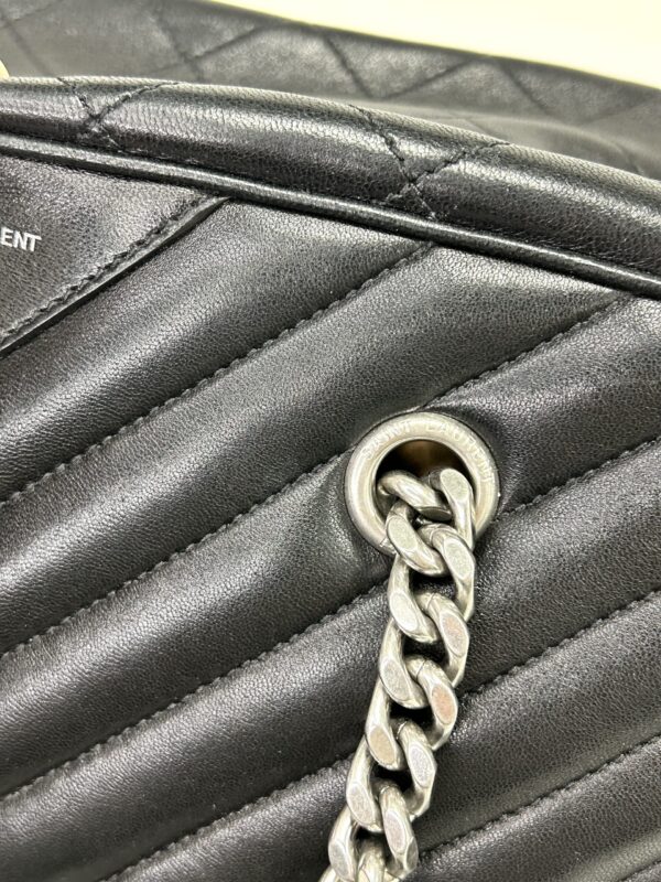 Bolso de hombro en cuero calfskin matelasse acolchado color negro. Con asa en cadena color plata viejo y cuero negro, para llevarla al hombro. Con cierre y colgante con logo. Logo frontal grabado en color plateado.